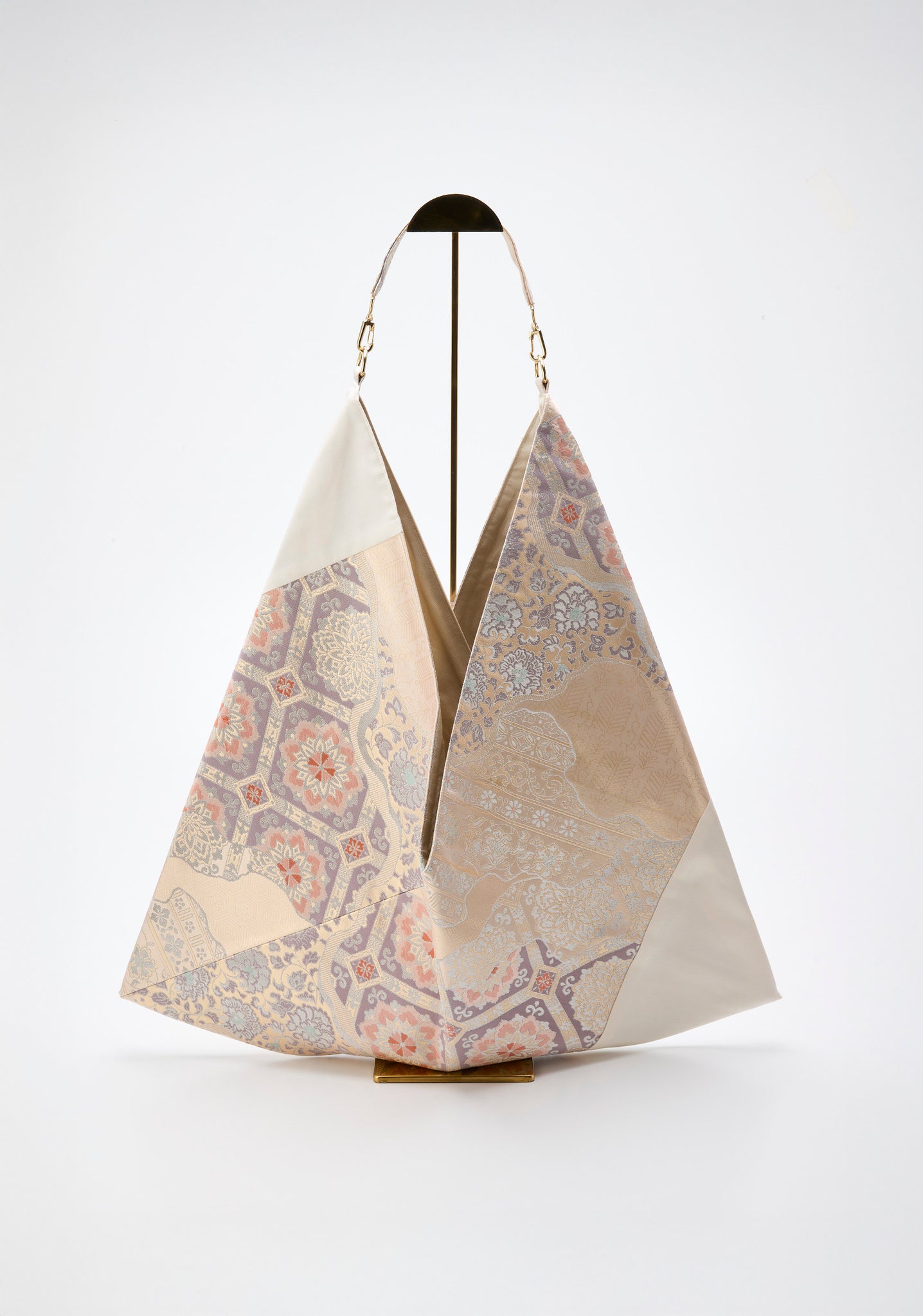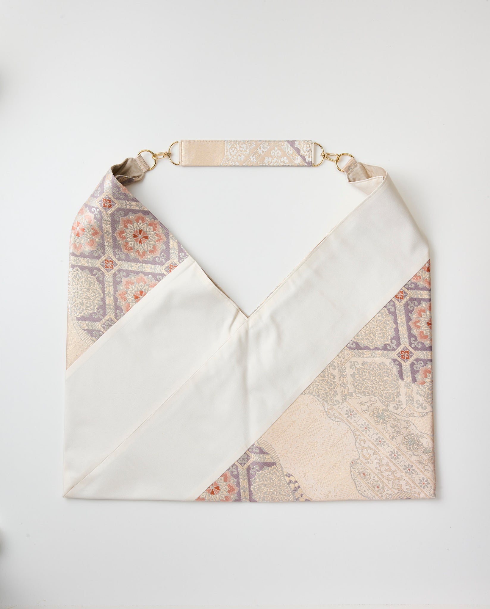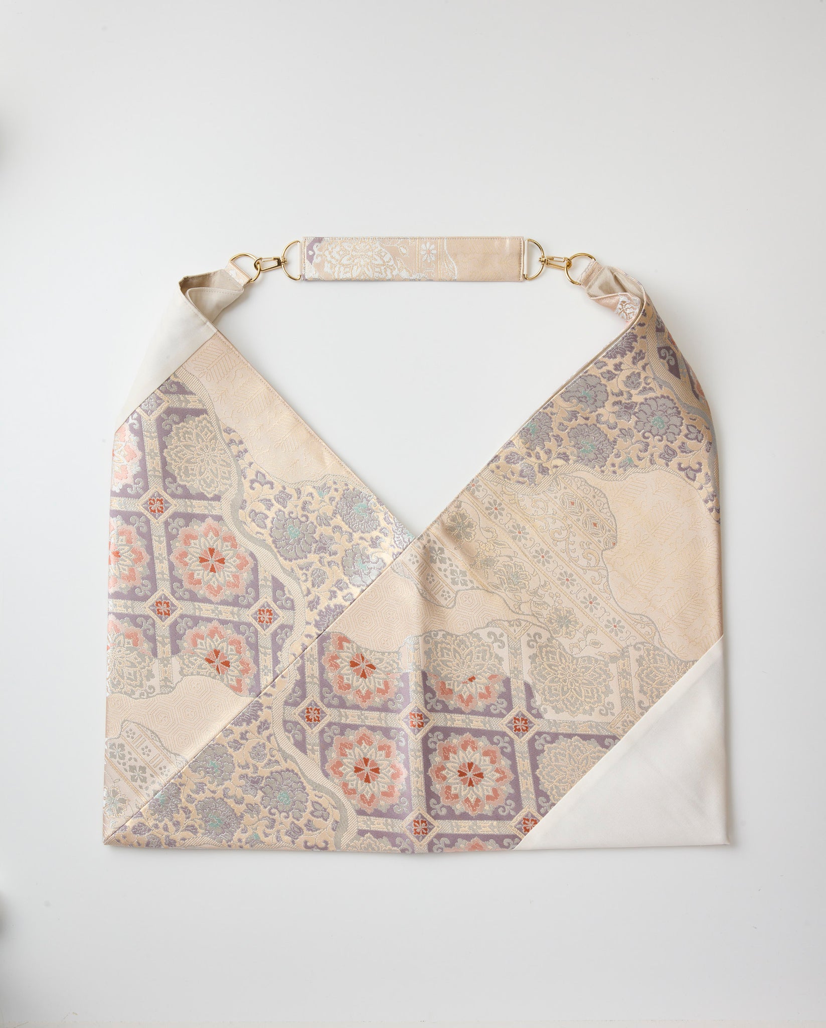 広げると四角に見えても、実際肩にかけ中にものをいれると重みで口が自然と閉じる設計になっております。金具タブも同じ帯からとった共地素材を使うことで統一感のある仕上がりにしております。また室内と屋外では織り地の色味や艶が大きく変わるのも特徴です。
