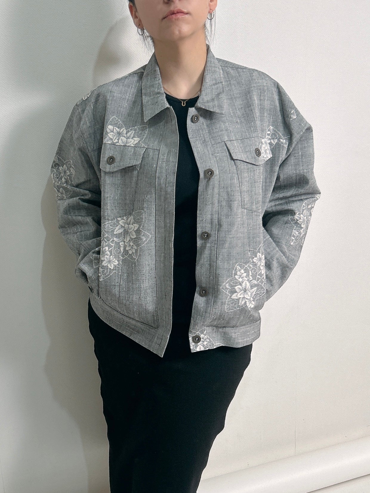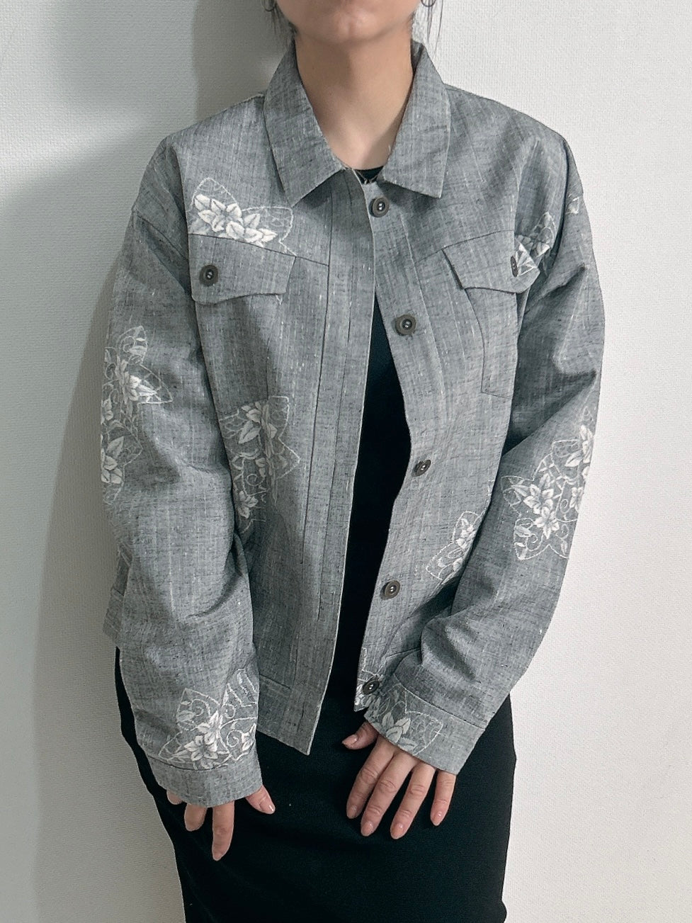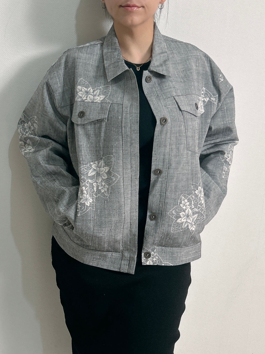 デニムジャケットの3rdモデルをもとに、リアレンジした品でございます。デニム本来の風合いを再現するため、内側全面に布芯を張り、肉厚な質感を生み出しました。これにより、着物地でありながらも、しっかりとした立体感と重厚さを持たせております。