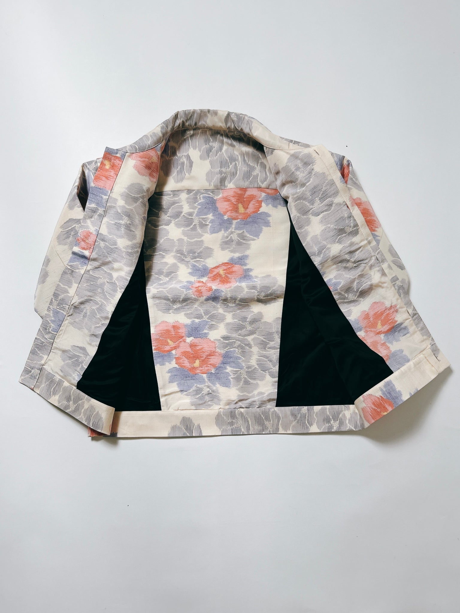 デニムジャケットの3rdモデルをもとに、リアレンジした品でございます。デニム本来の風合いを再現するため、内側全面に布芯を張り、肉厚な質感を生み出しました。これにより、着物地でありながらも、しっかりとした立体感と重厚さを持たせております。