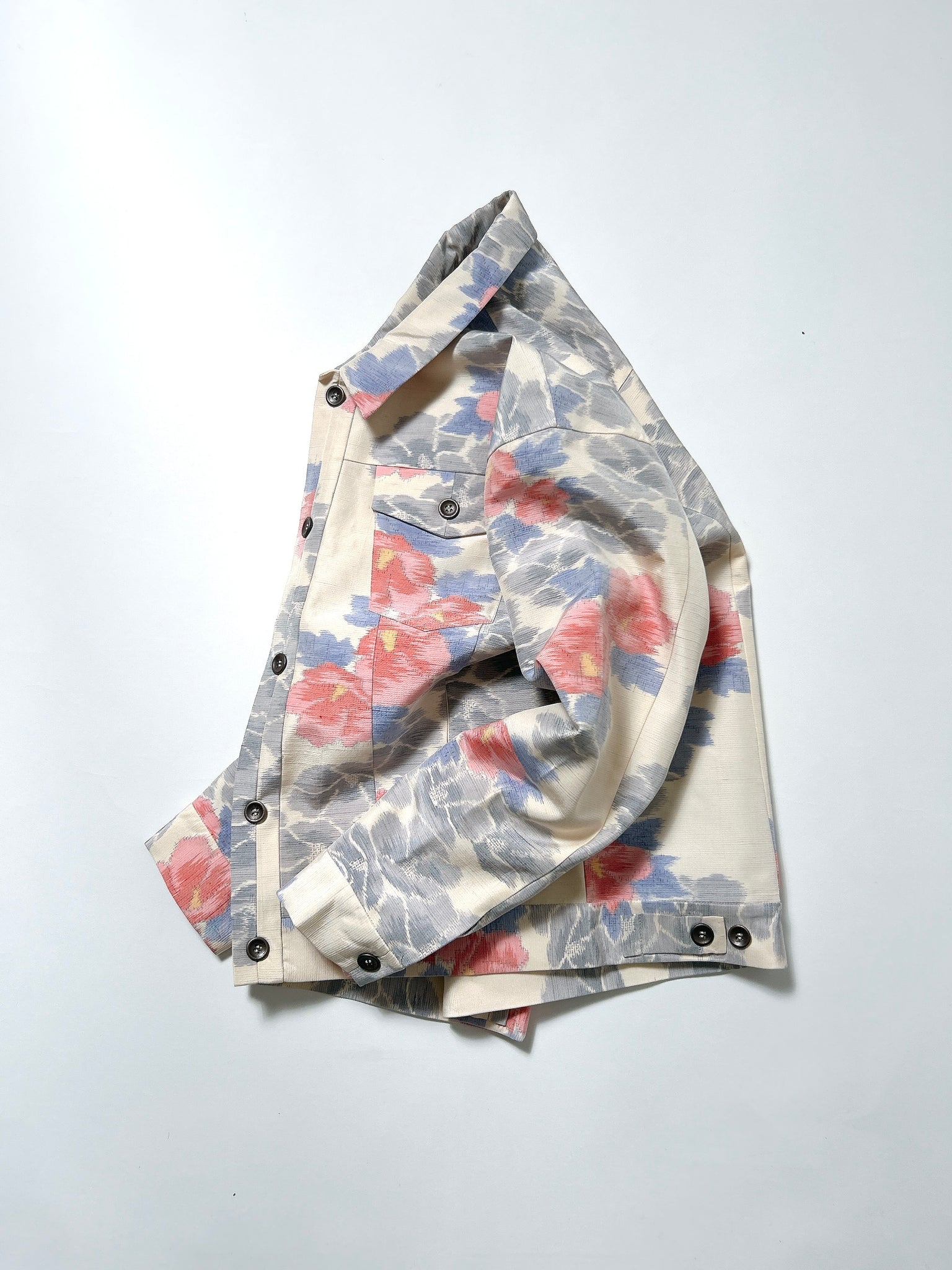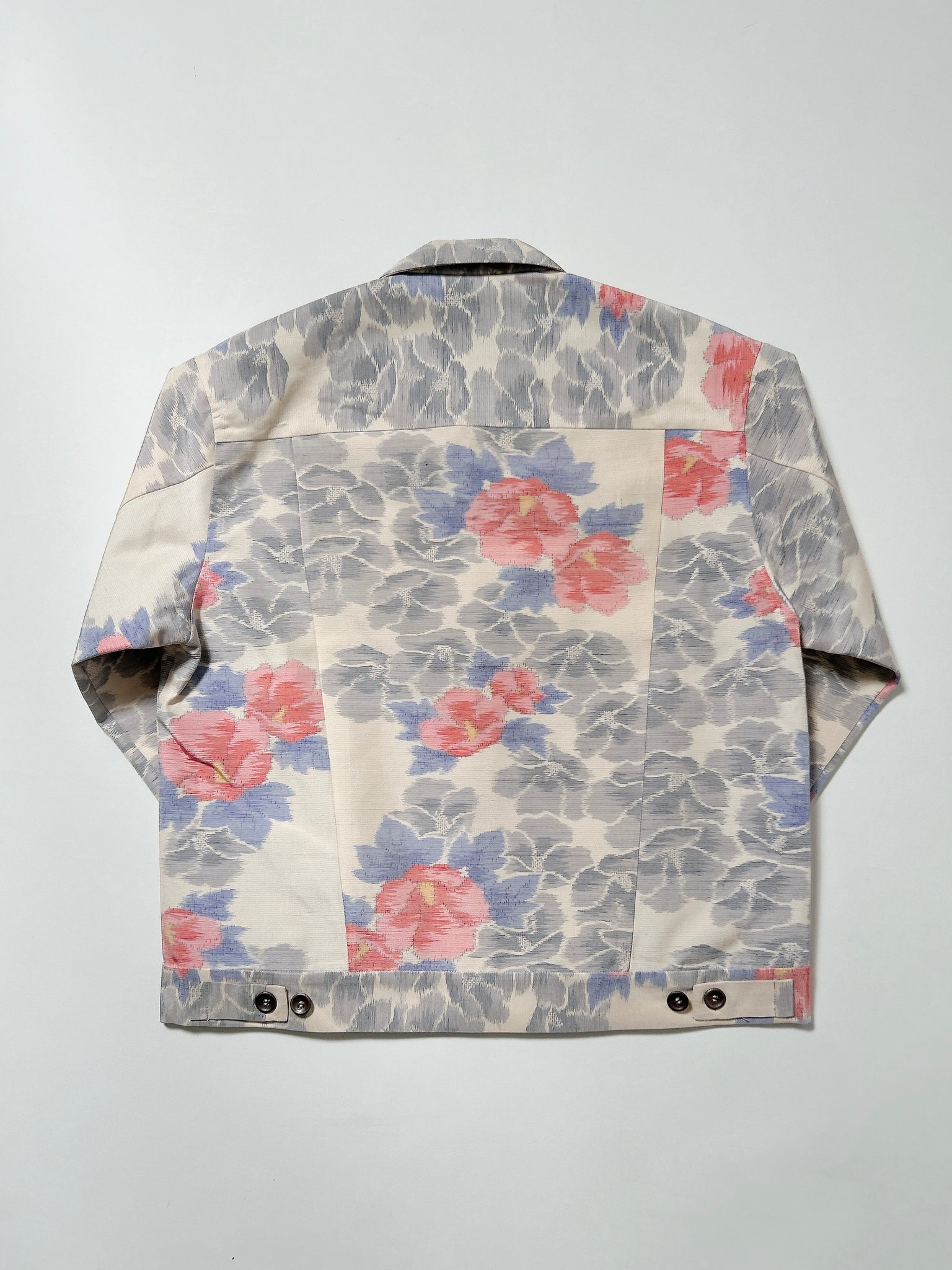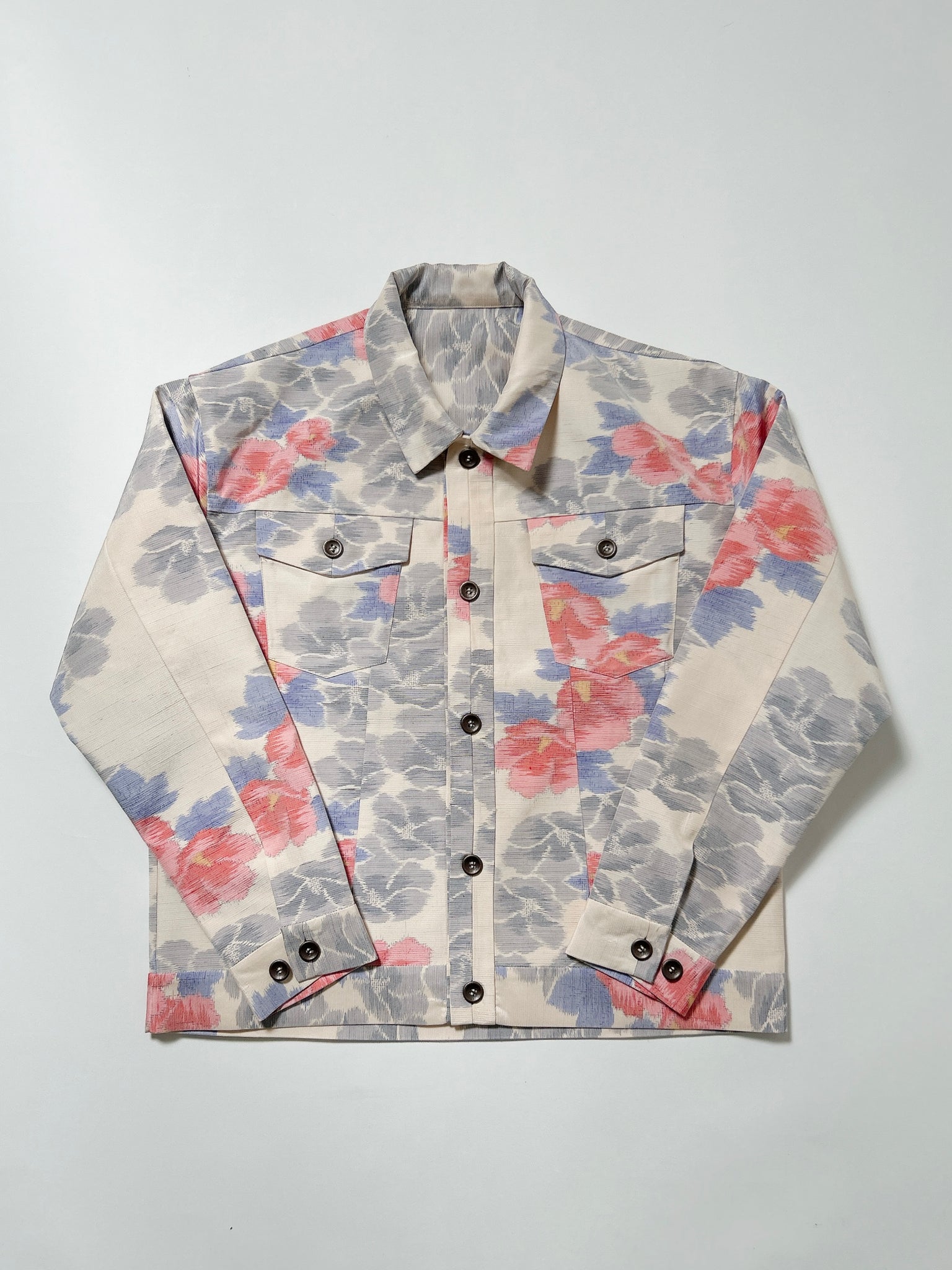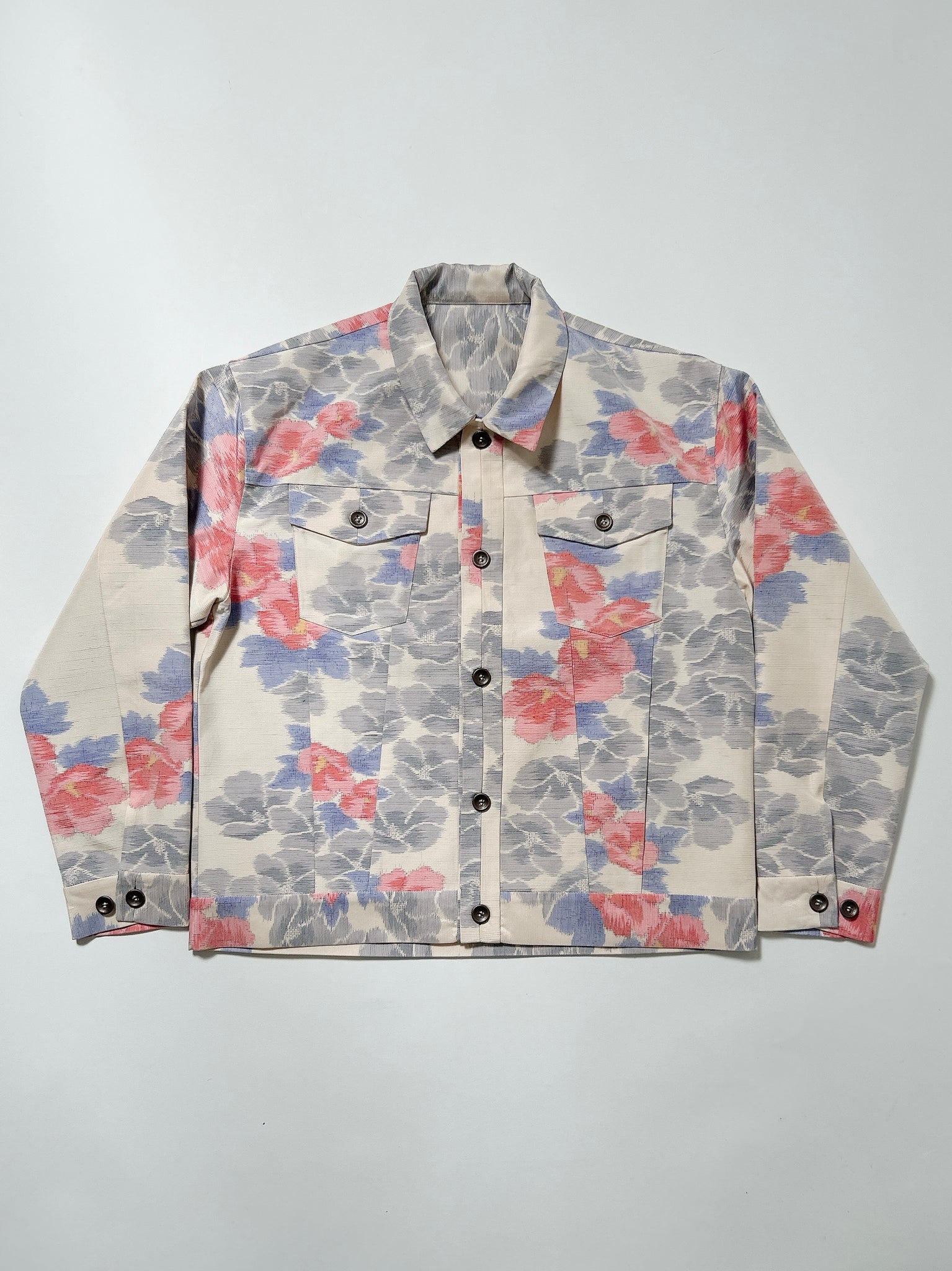 また、ケニシャツに続き、極力ステッチを表に出さない縫製仕様を採用。お着物の持つ本来の美しさや、柄の流れを損なうことなく、素材そのものが持つ魅力を存分に引き立てる仕上がりとなっております。