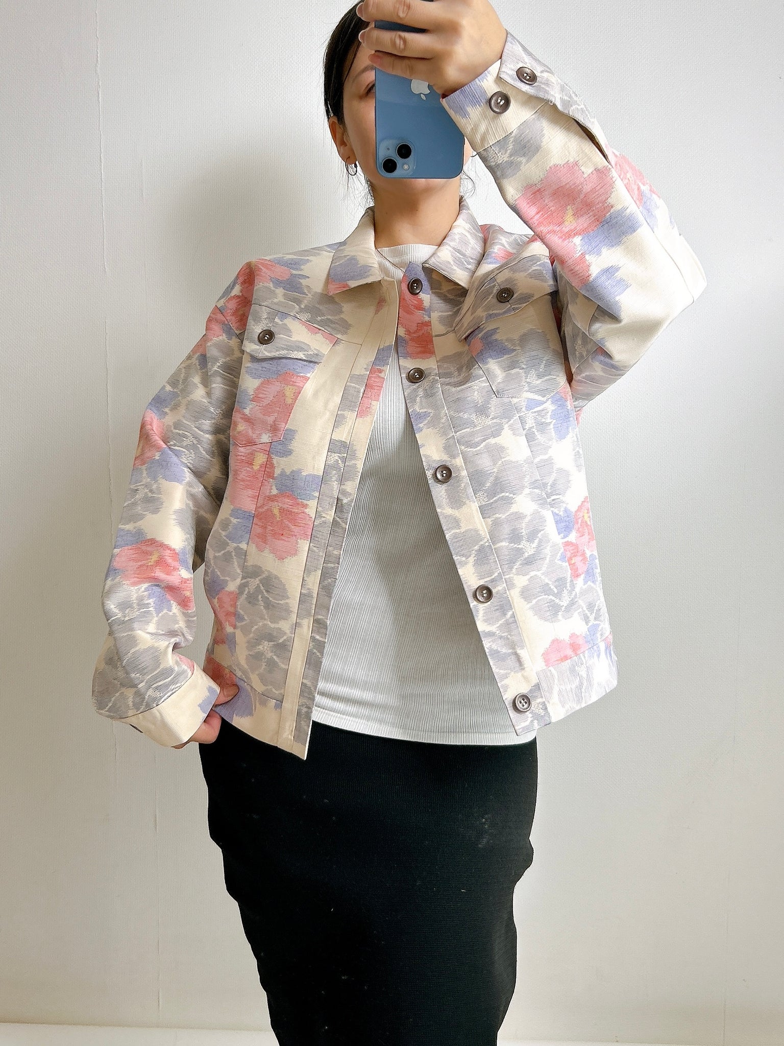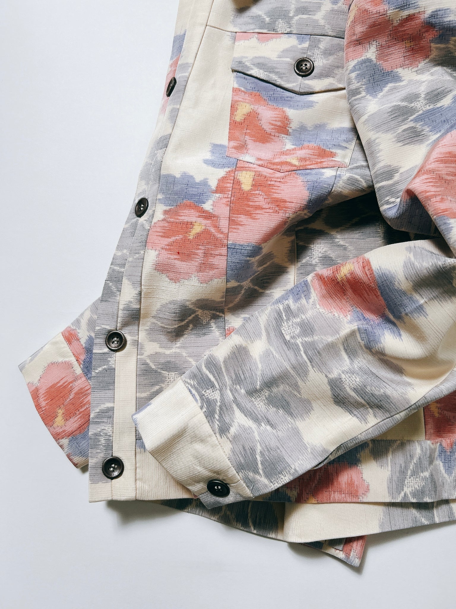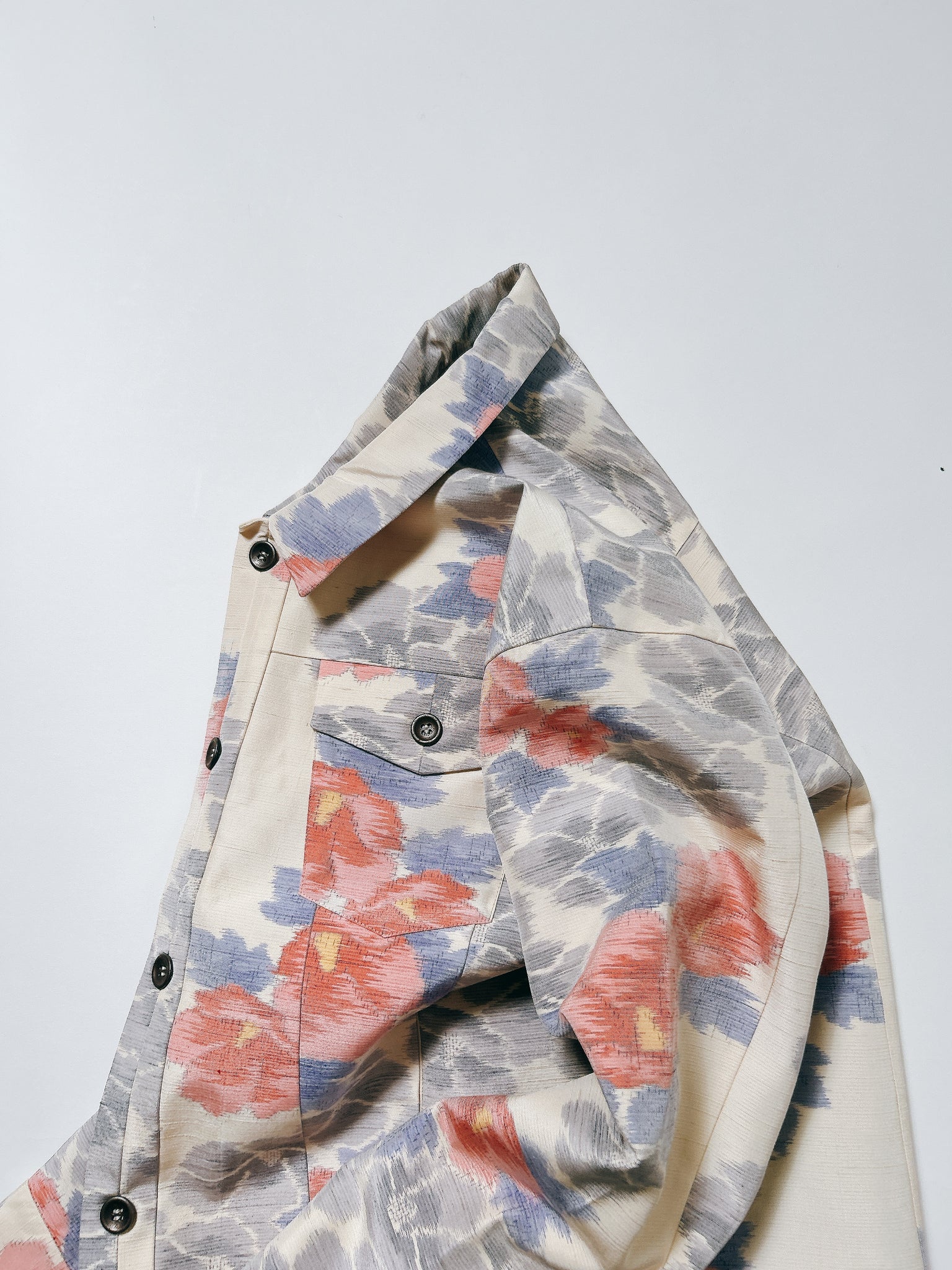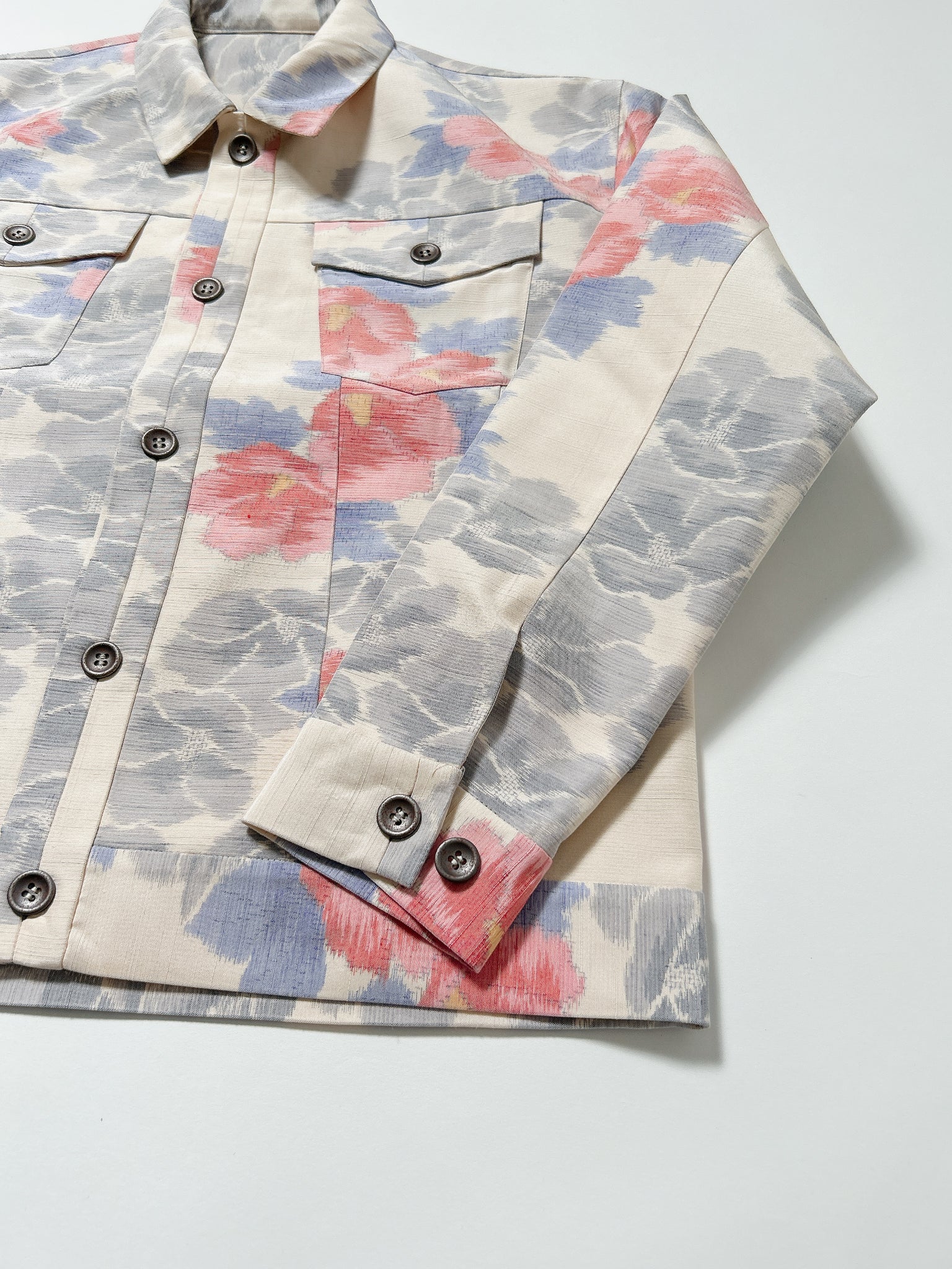 また、ケニシャツに続き、極力ステッチを表に出さない縫製仕様を採用。お着物の持つ本来の美しさや、柄の流れを損なうことなく、素材そのものが持つ魅力を存分に引き立てる仕上がりとなっております。