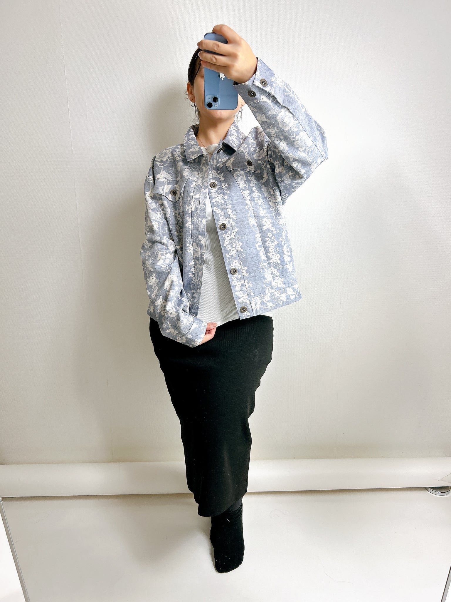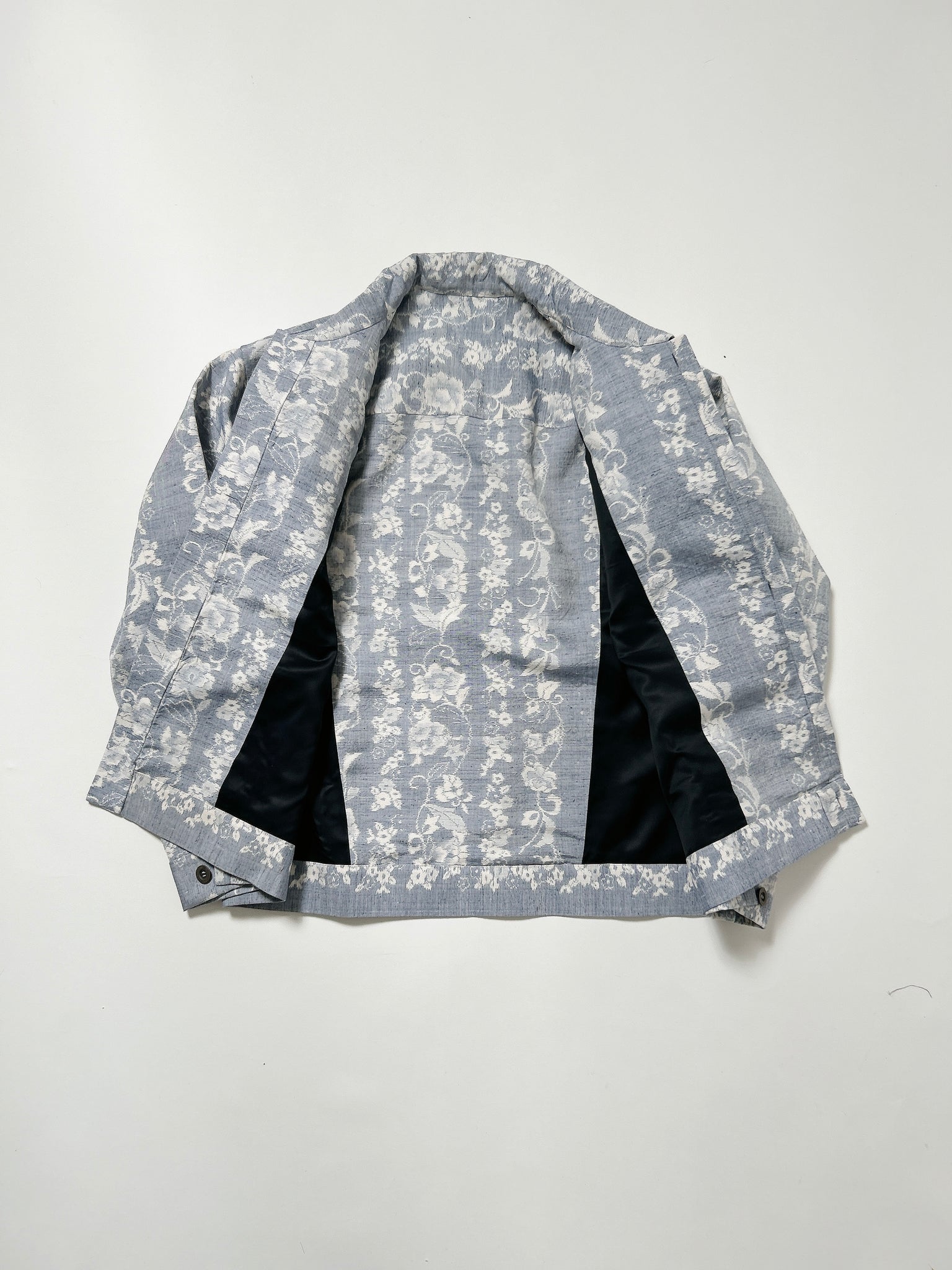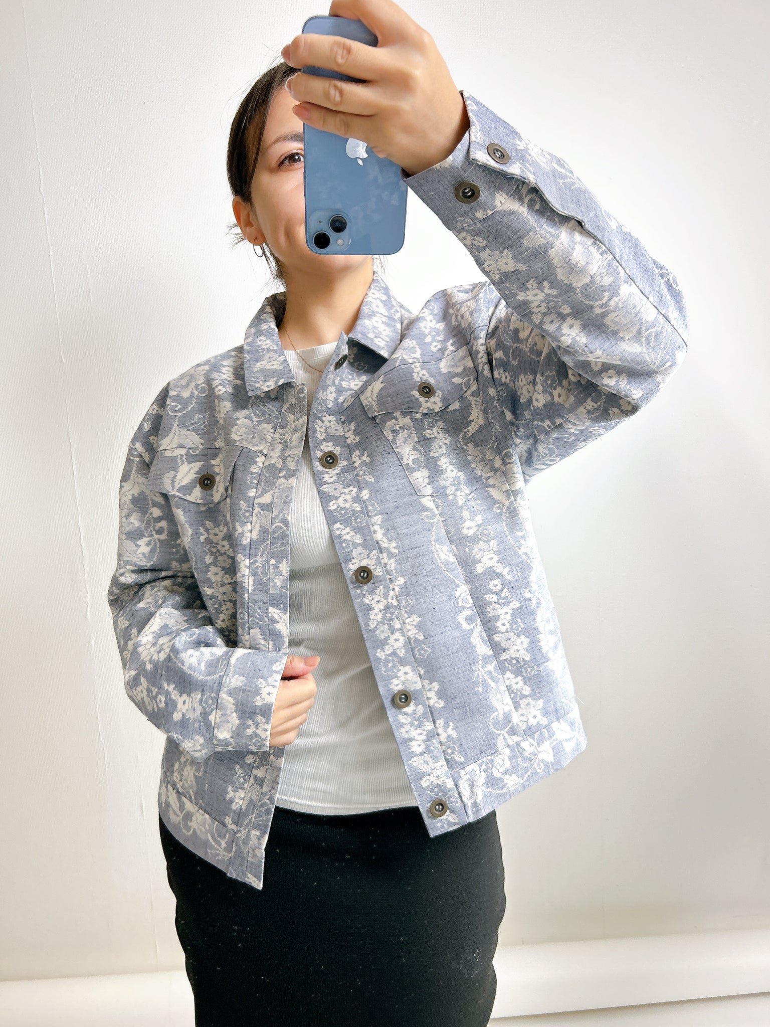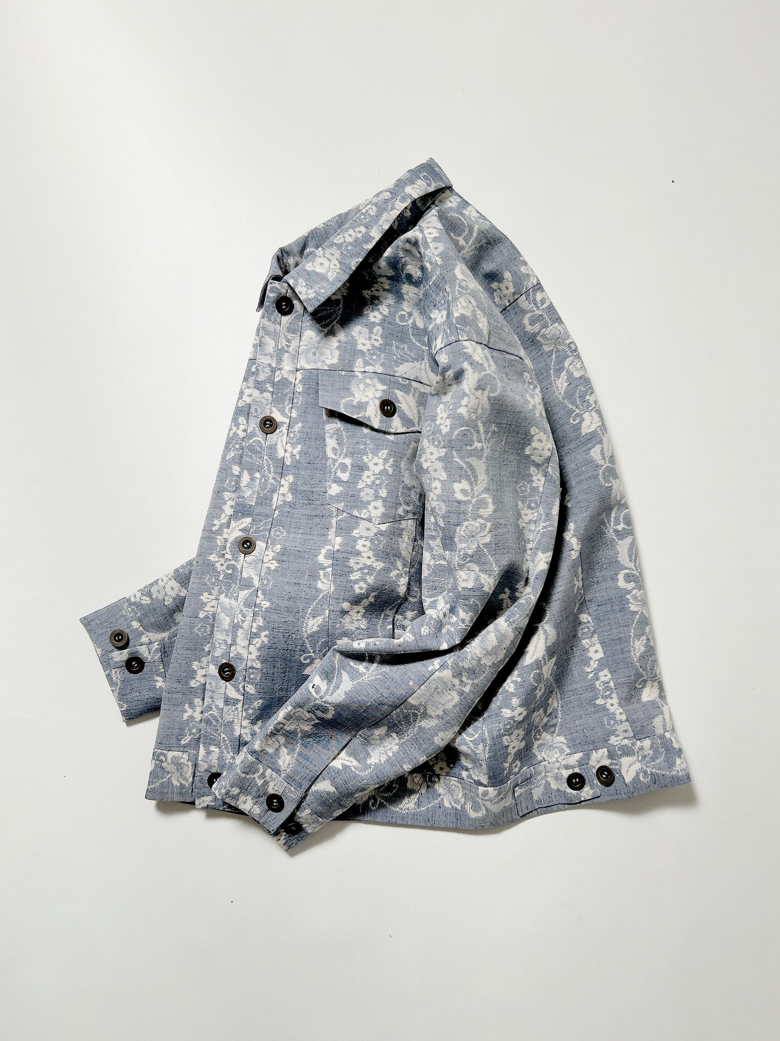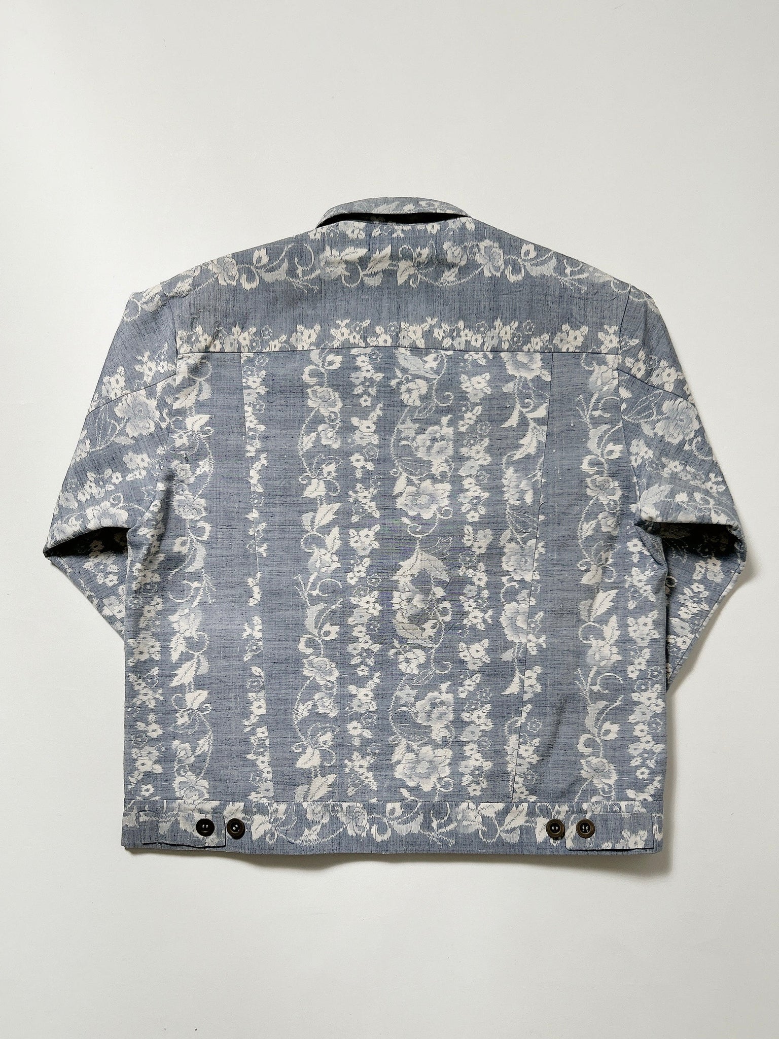 デニムジャケットの3rdモデルをもとに、リアレンジした品でございます。デニム本来の風合いを再現するため、内側全面に布芯を張り、肉厚な質感を生み出しました。これにより、着物地でありながらも、しっかりとした立体感と重厚さを持たせております。