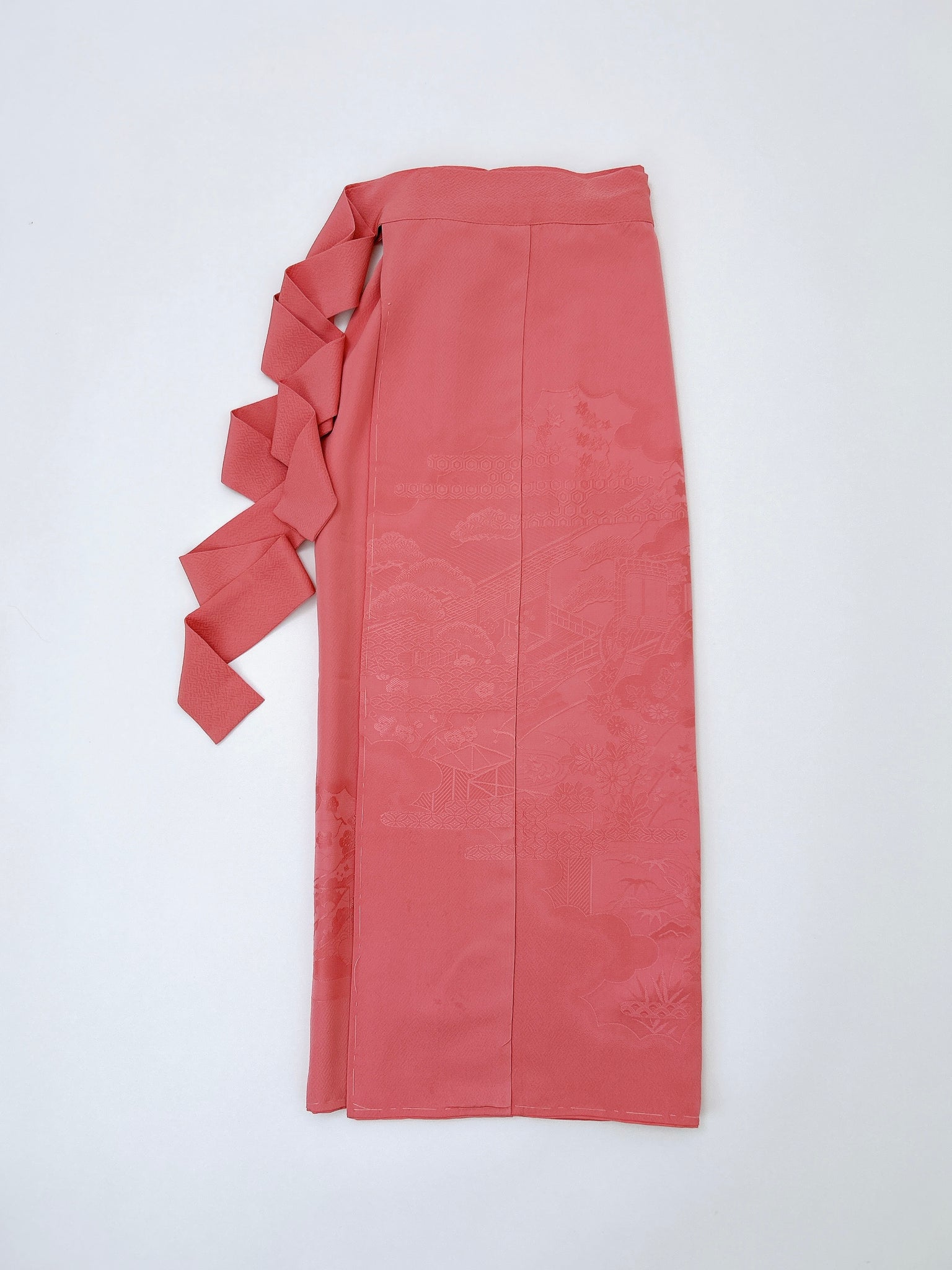 シュッケニは、巻きスカート仕様。からだに馴染むシルエットで着物を着る時と同じ手順で身体に巻きつけていただくと、正面からも横からも後ろ姿までも、まるで一枚の着物を纏ったかのような佇まいに仕上がります。