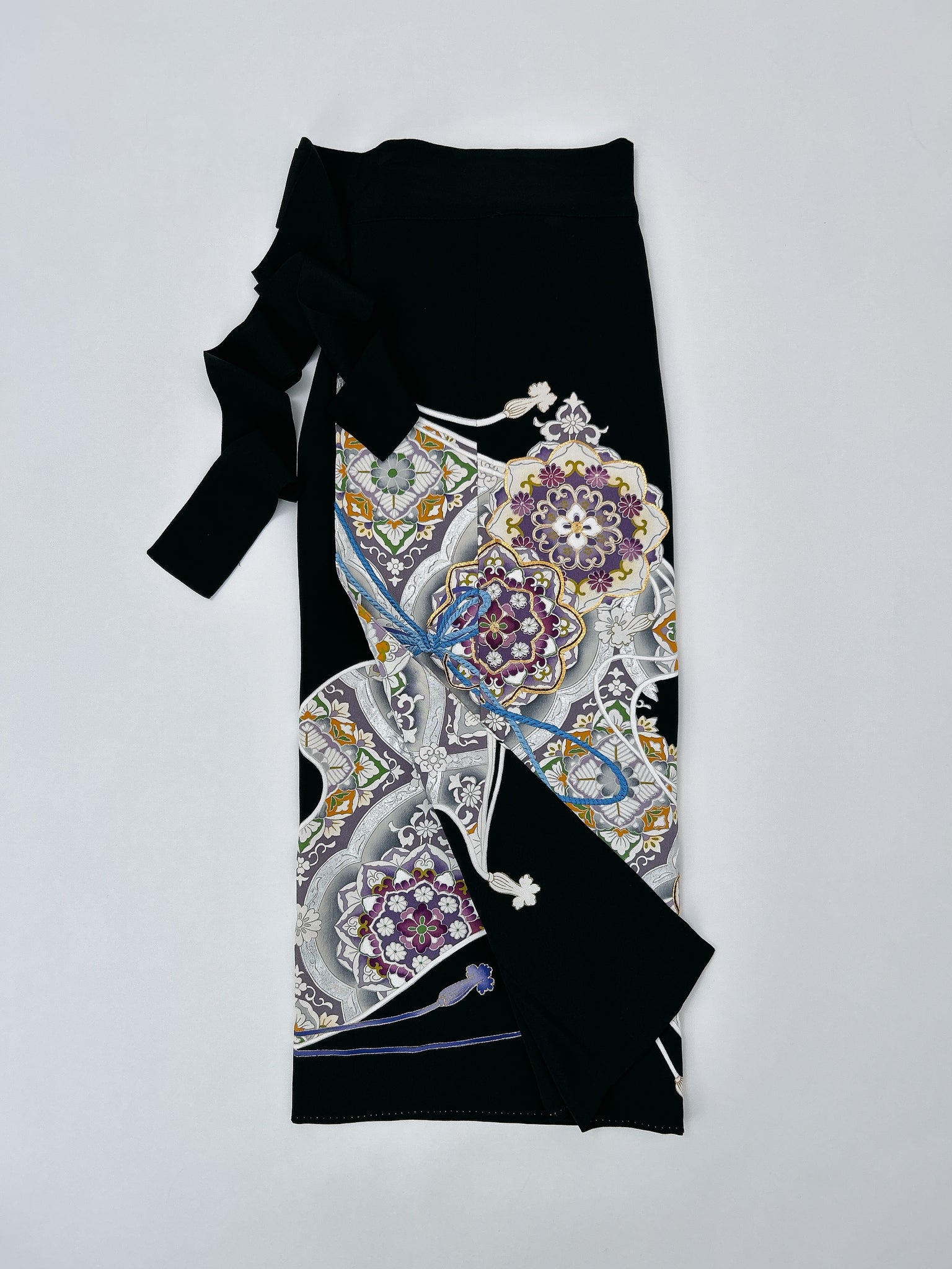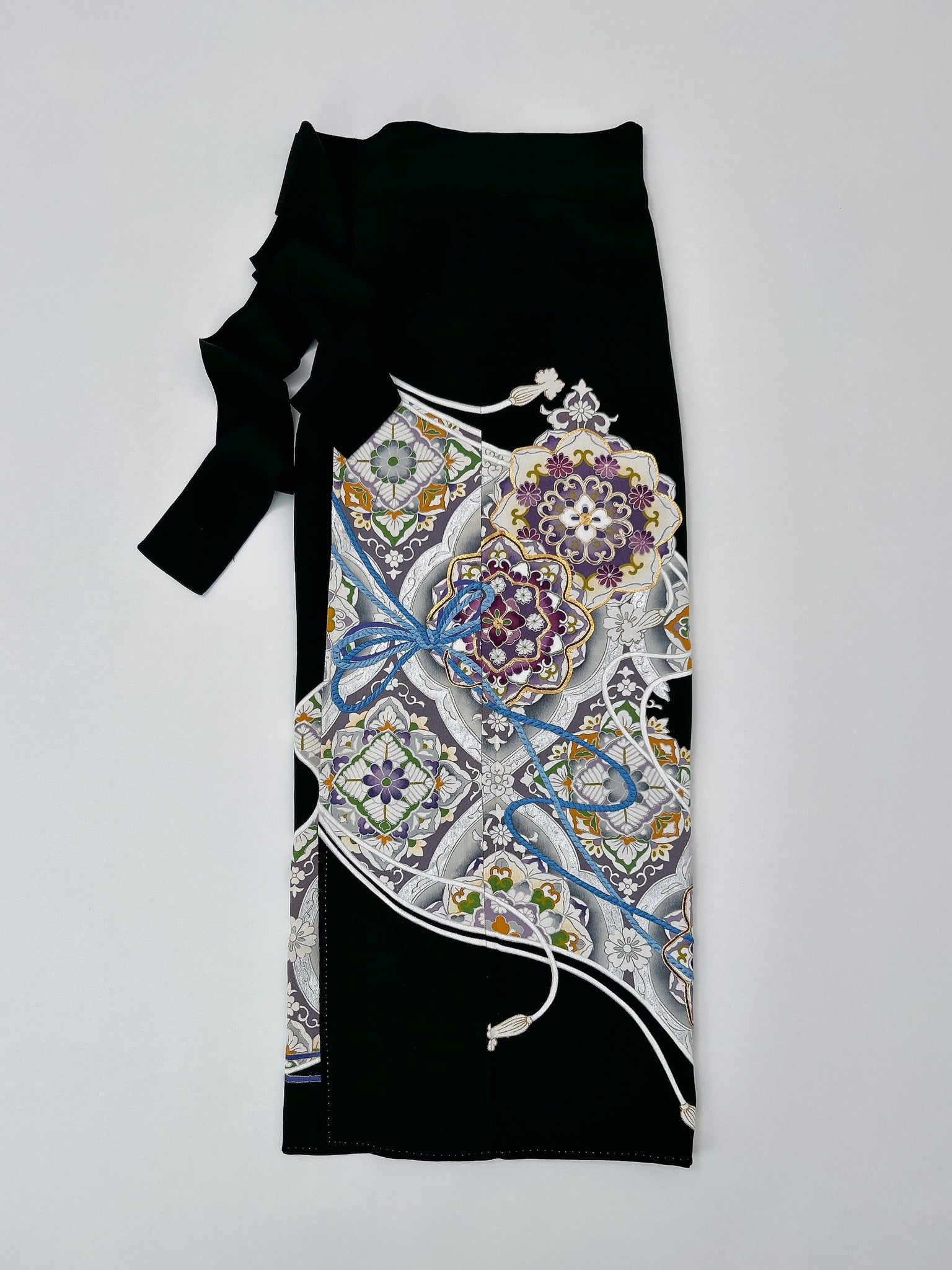 シュッケニは、巻きスカート仕様。からだに馴染むシルエットで着物を着る時と同じ手順で身体に巻きつけていただくと、正面からも横からも後ろ姿までも、まるで一枚の着物を纏ったかのような佇まいに仕上がります。