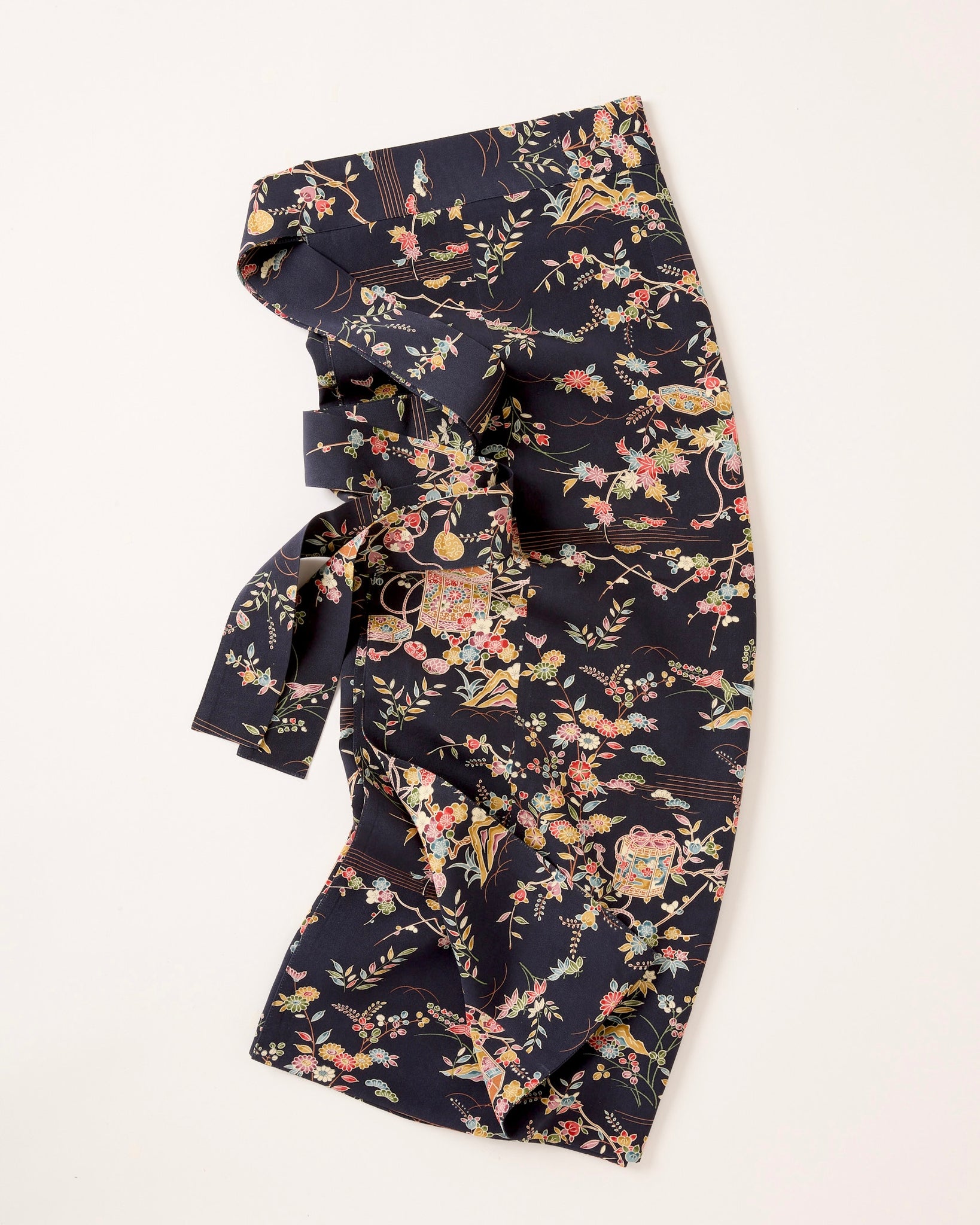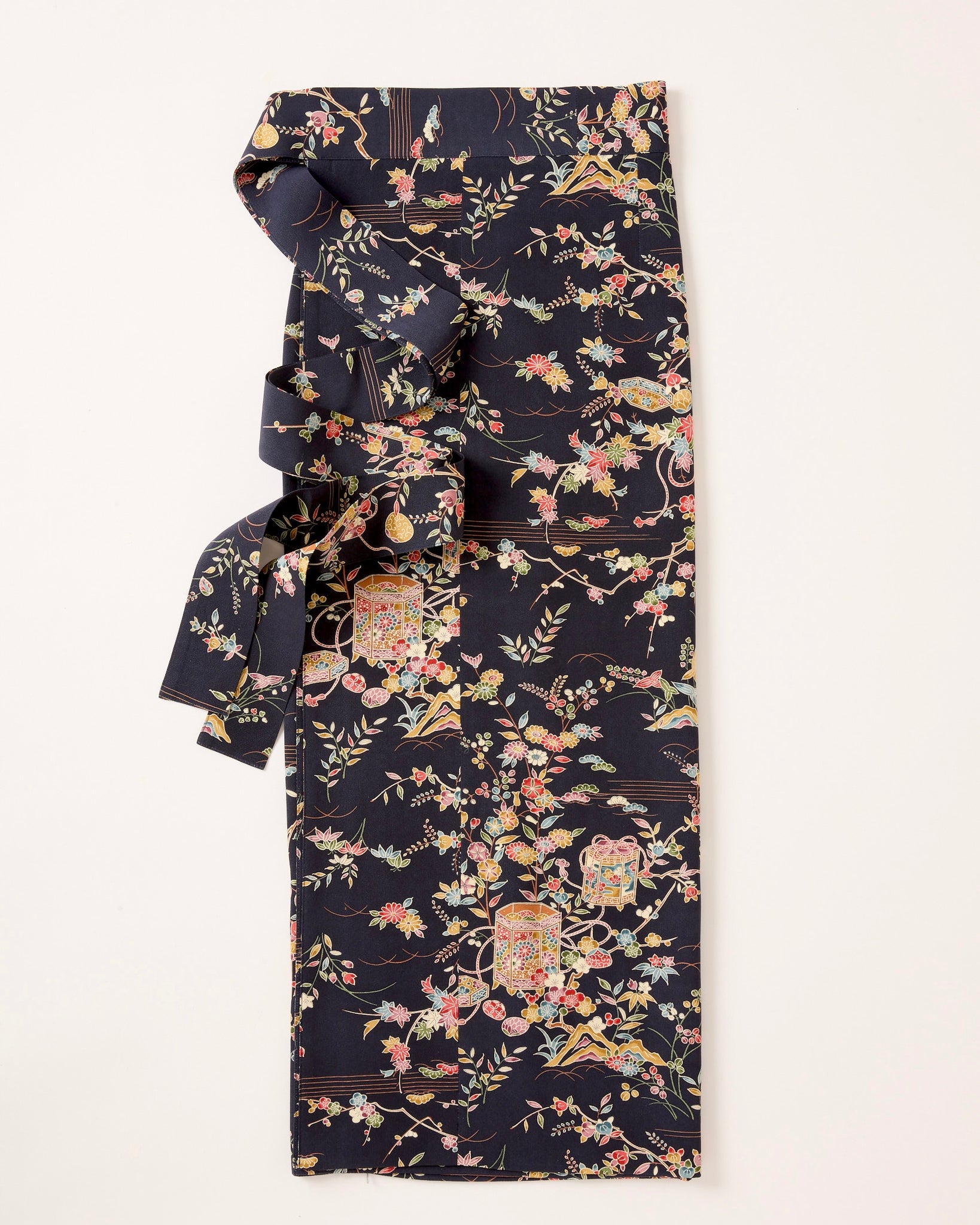 お着物一着一反を余すことなく全て使い、世界でたった一着の巻きスカートをおつくりました。よりお着物に近づけながらタイトになりすぎず身体の線を拾いすぎずほどよく身体に這わせられるよう設計しました。生地も一枚ではなく裏にも表生地を贅沢に使用した2枚合わせのお品です。身体の線を拾いすぎずしっかり歩くことも可能です。