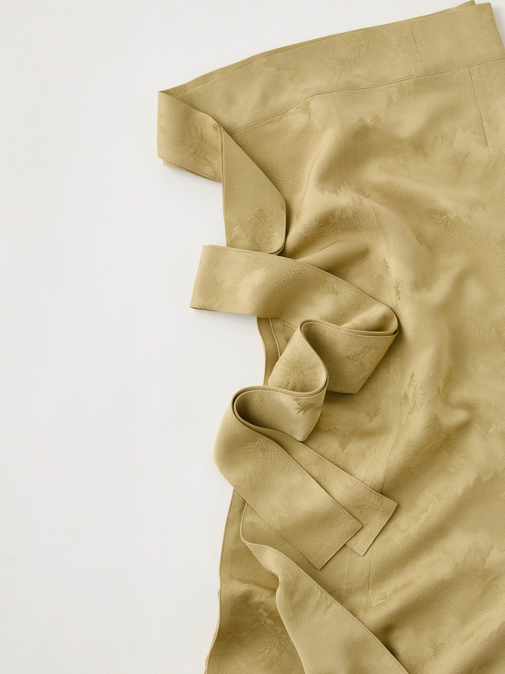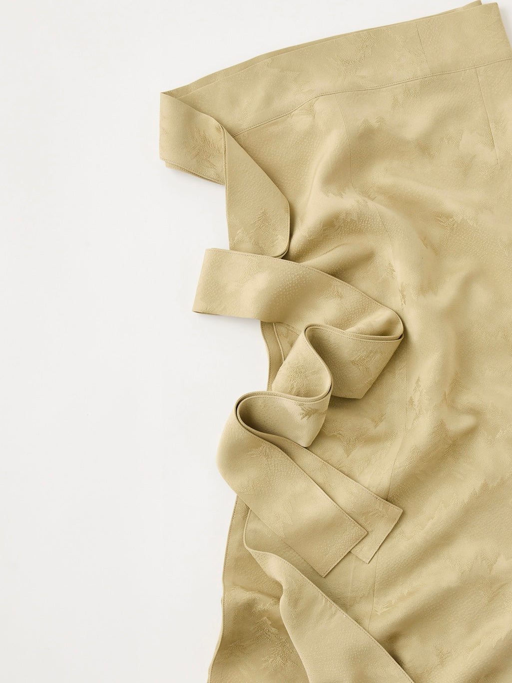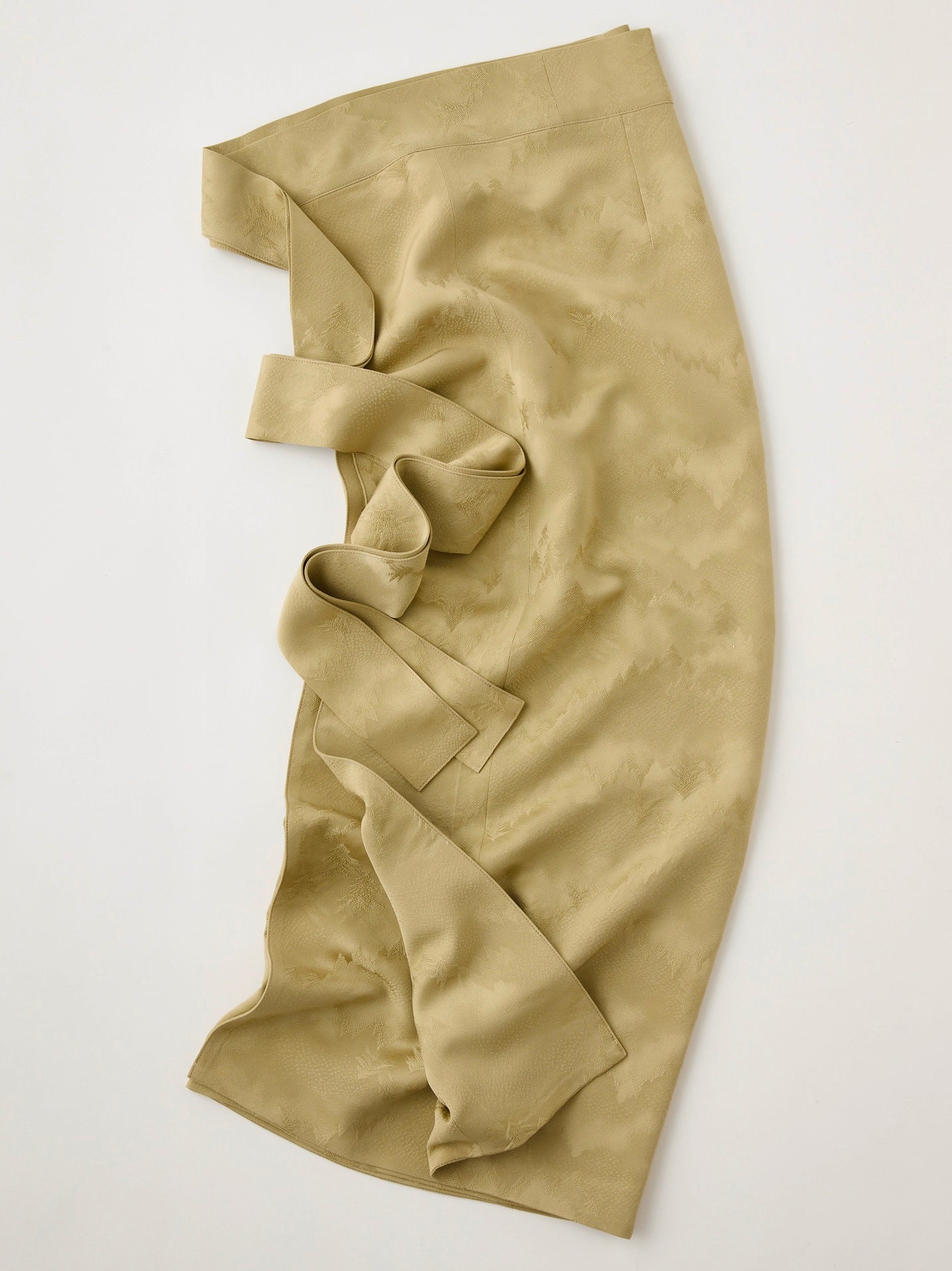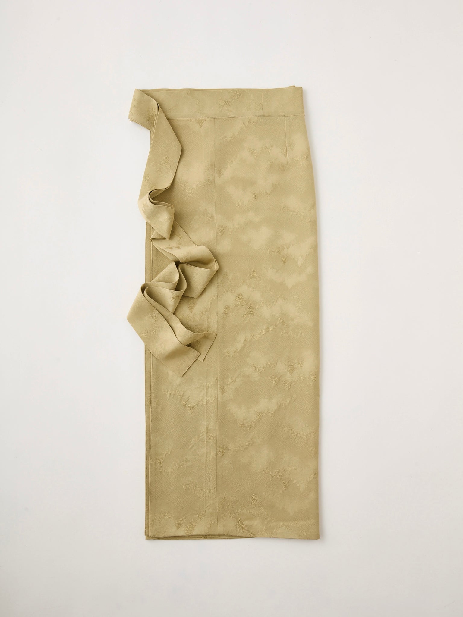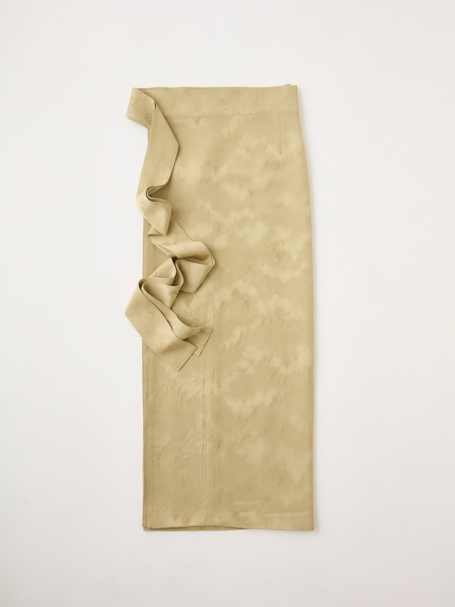 お着物一着一反を余すことなく全て使い、世界でたった一着の巻きスカートをおつくりました。よりお着物に近づけながらタイトになりすぎず身体の線を拾いすぎずほどよく身体に這わせられるよう設計しました。生地も一枚ではなく裏にも表生地を贅沢に使用した2枚合わせのお品です。身体の線を拾いすぎずしっかり歩くことも可能です。