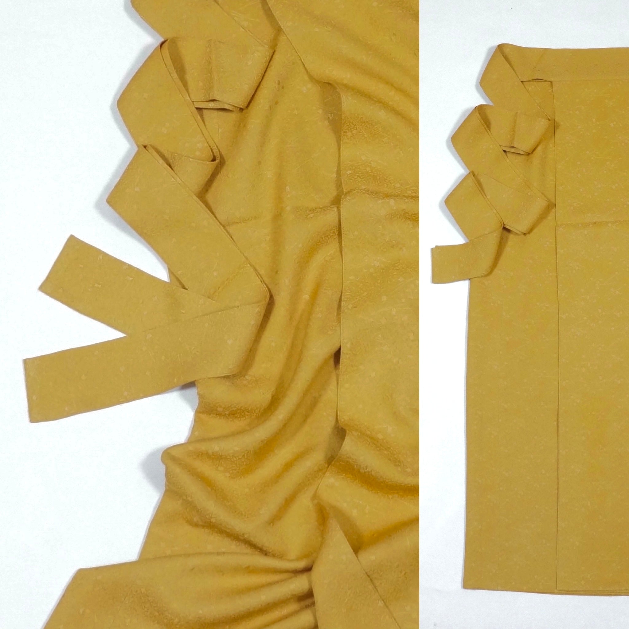 お着物一反から一着のラップスカートをおつくりました。よりお着物に近づけながらタイトになりすぎず身体の線を拾いすぎずほどよく身体に這わせられるよう設計しました。生地も一枚でなく中も表生地を贅沢に使用しました、全て一点限りのお品です。