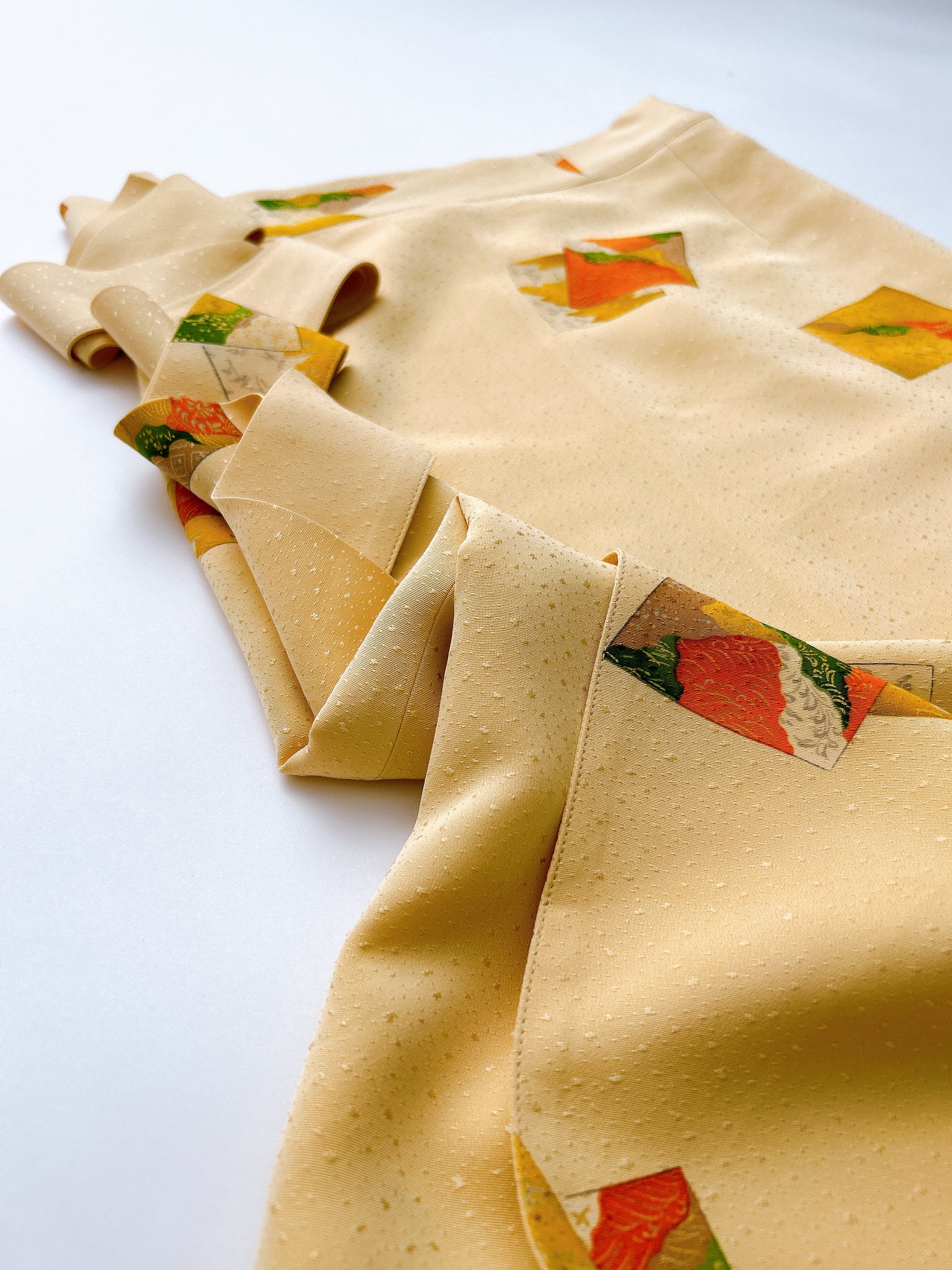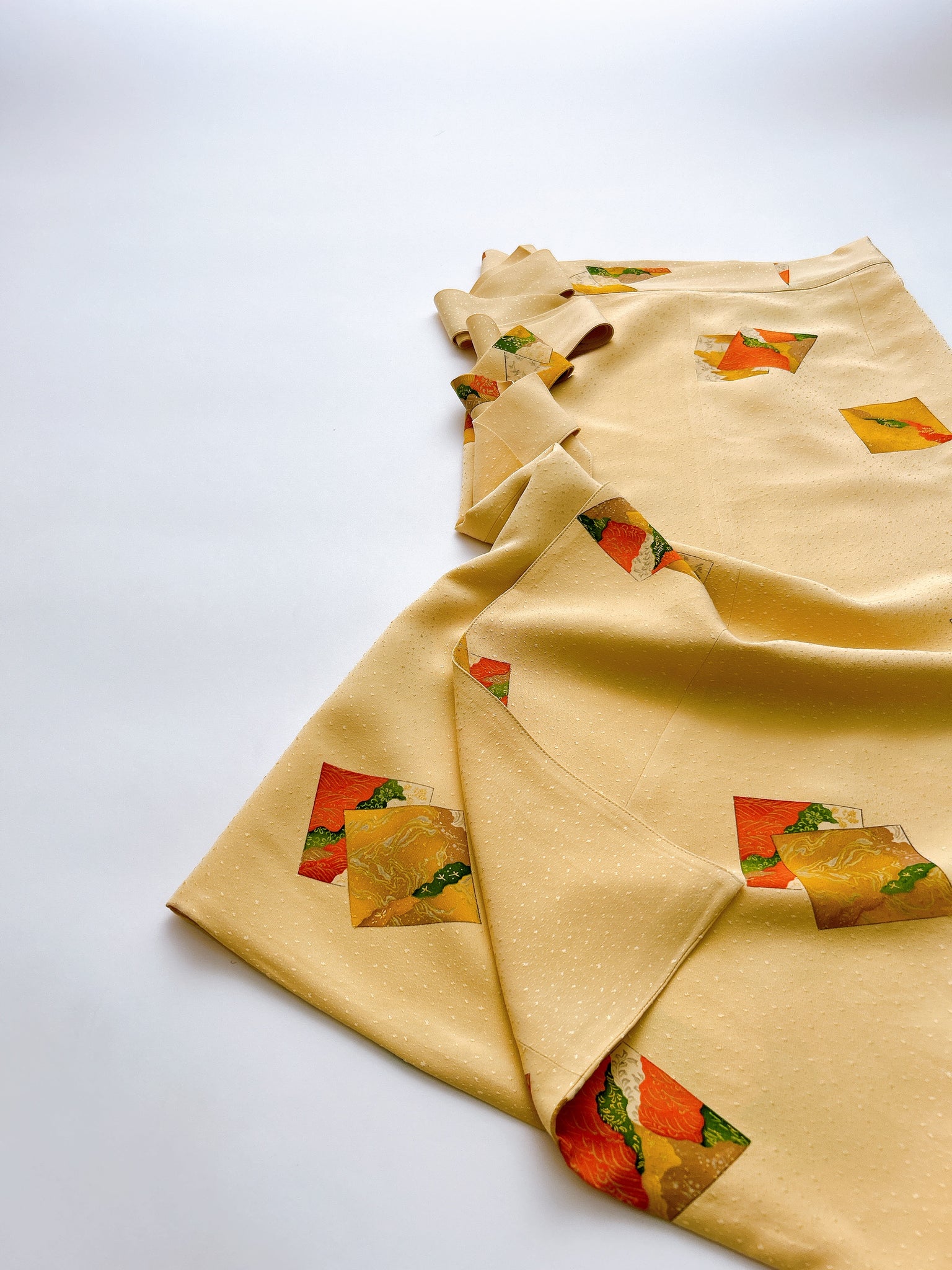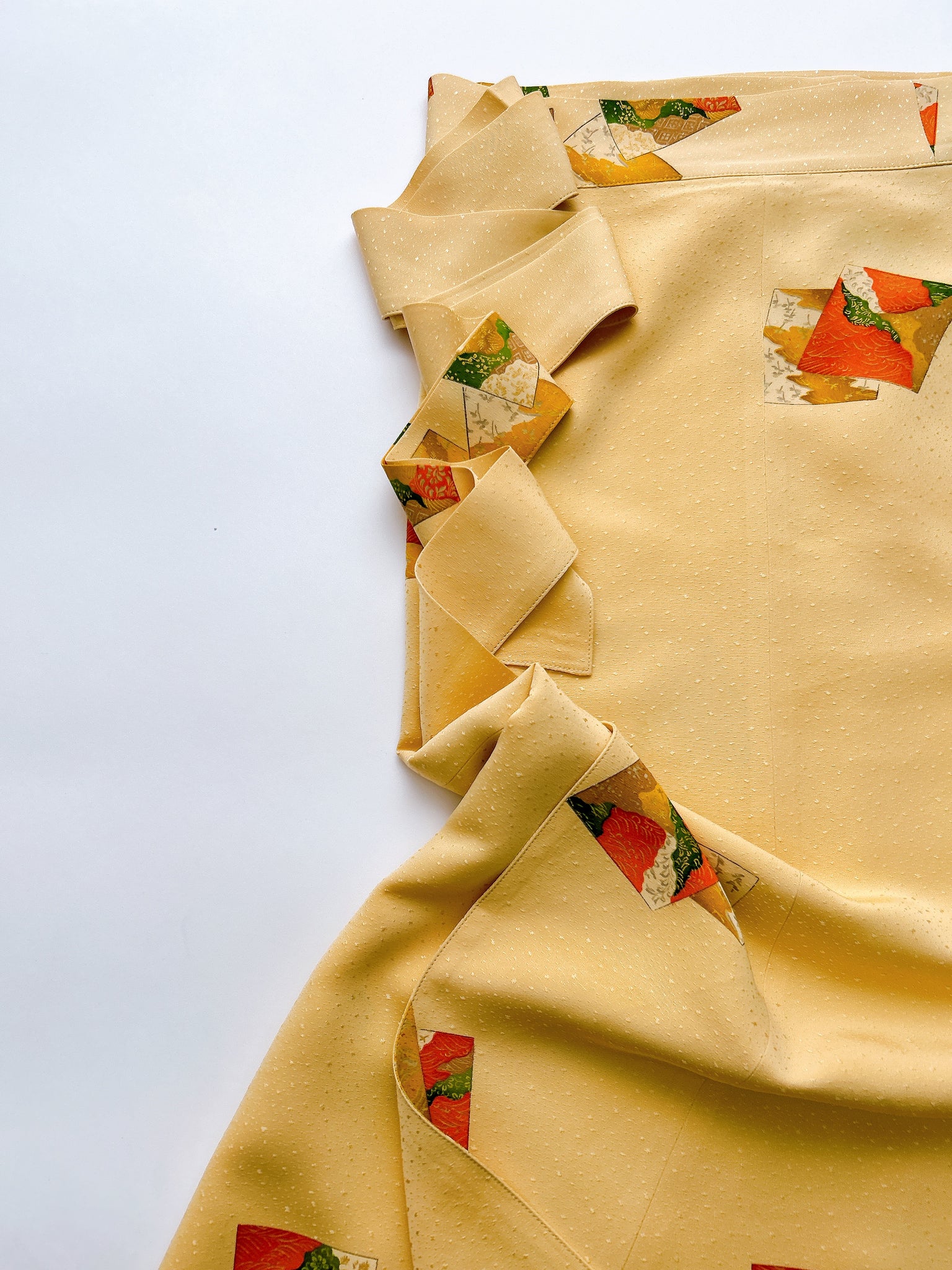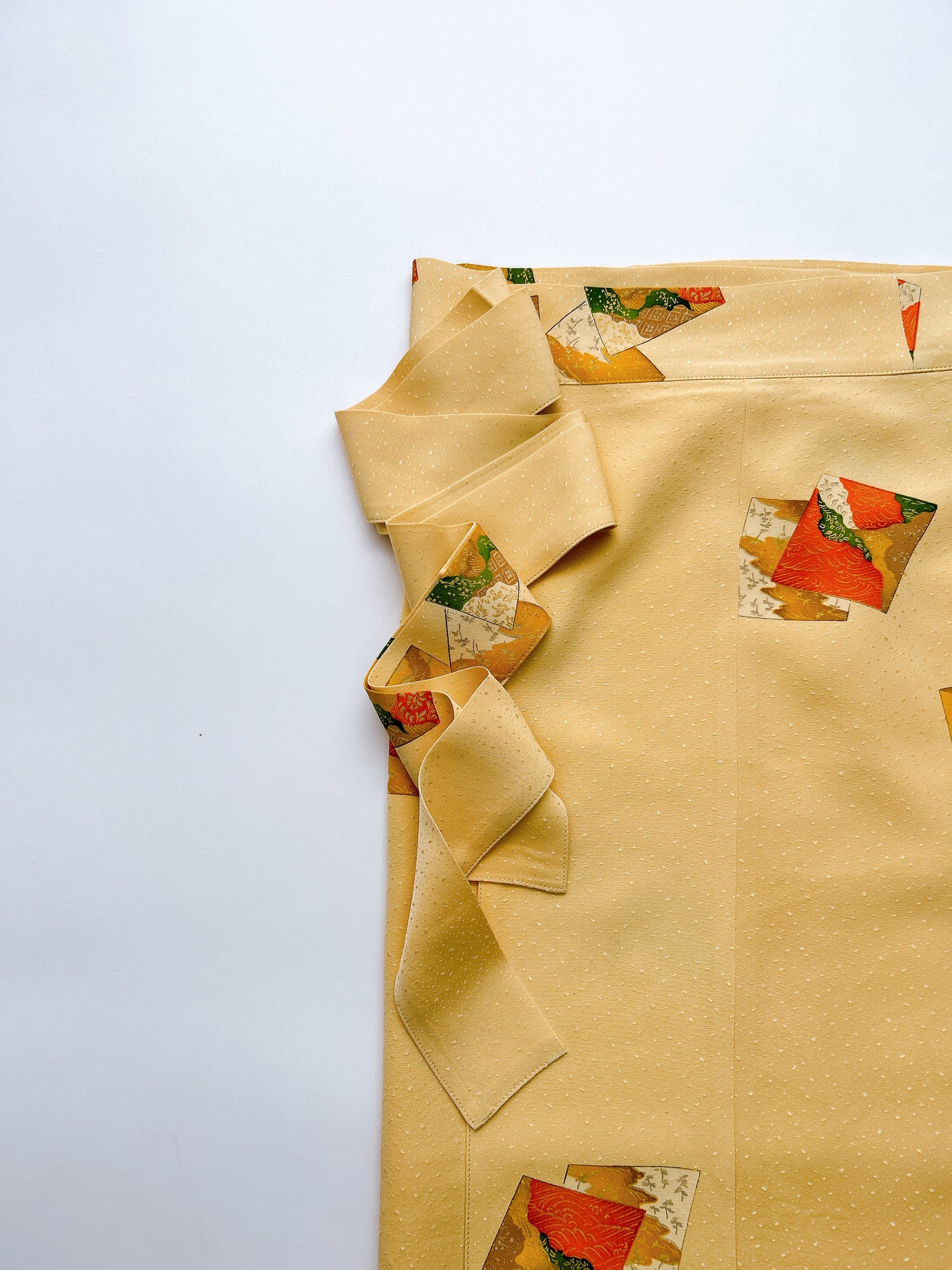 お着物一反から一着の巻きスカートをおつくりました。よりお着物に近づけながらタイトになりすぎず身体の線を拾いすぎずほどよく身体に這わせられるよう設計しした。生地も一枚でなく中も表生地を贅沢に使用しました、