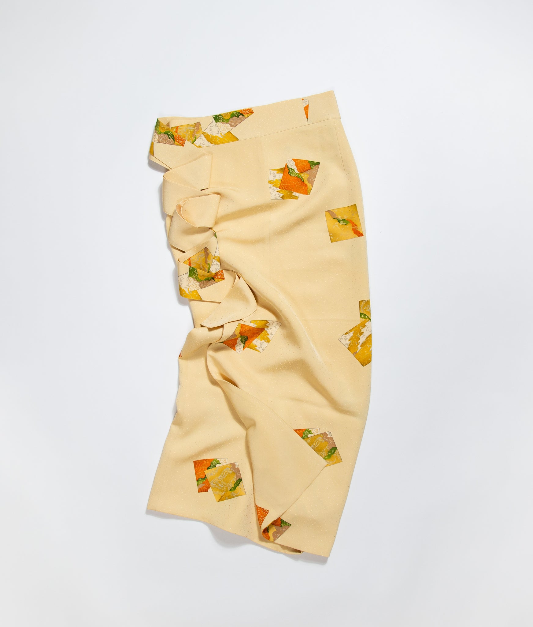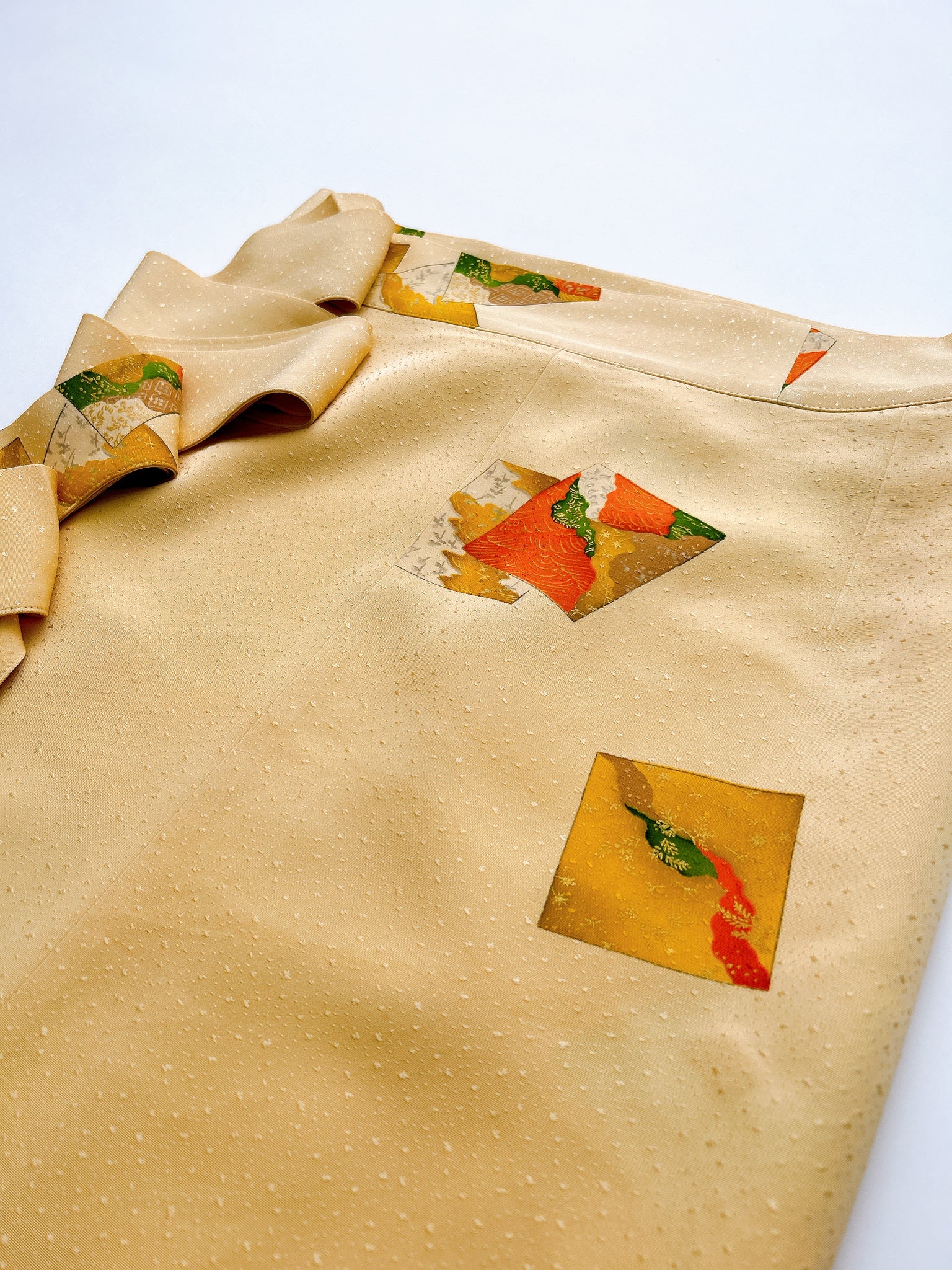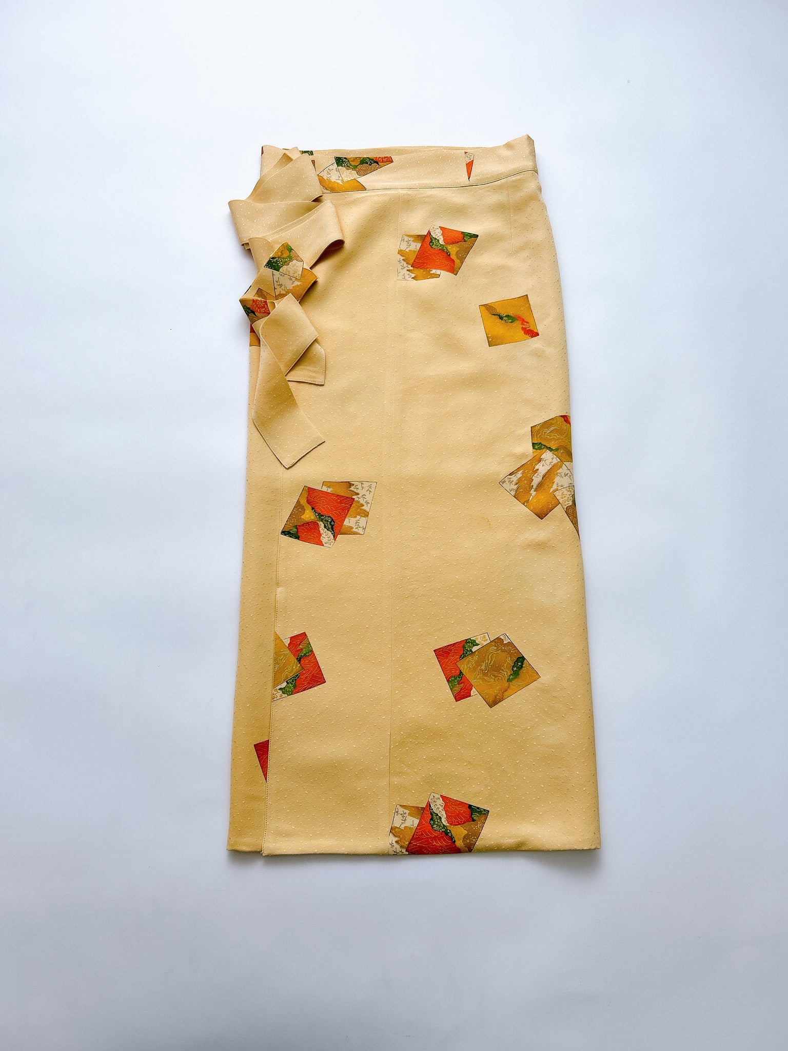 お着物一反から一着の巻きスカートをおつくりました。よりお着物に近づけながらタイトになりすぎず身体の線を拾いすぎずほどよく身体に這わせられるよう設計しした。生地も一枚でなく中も表生地を贅沢に使用しました、