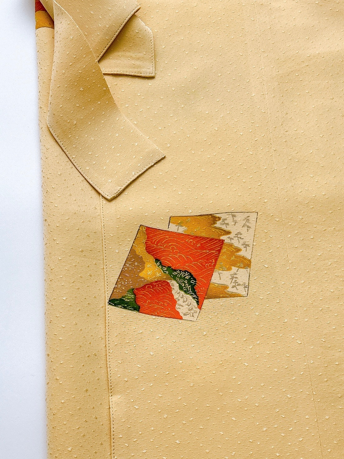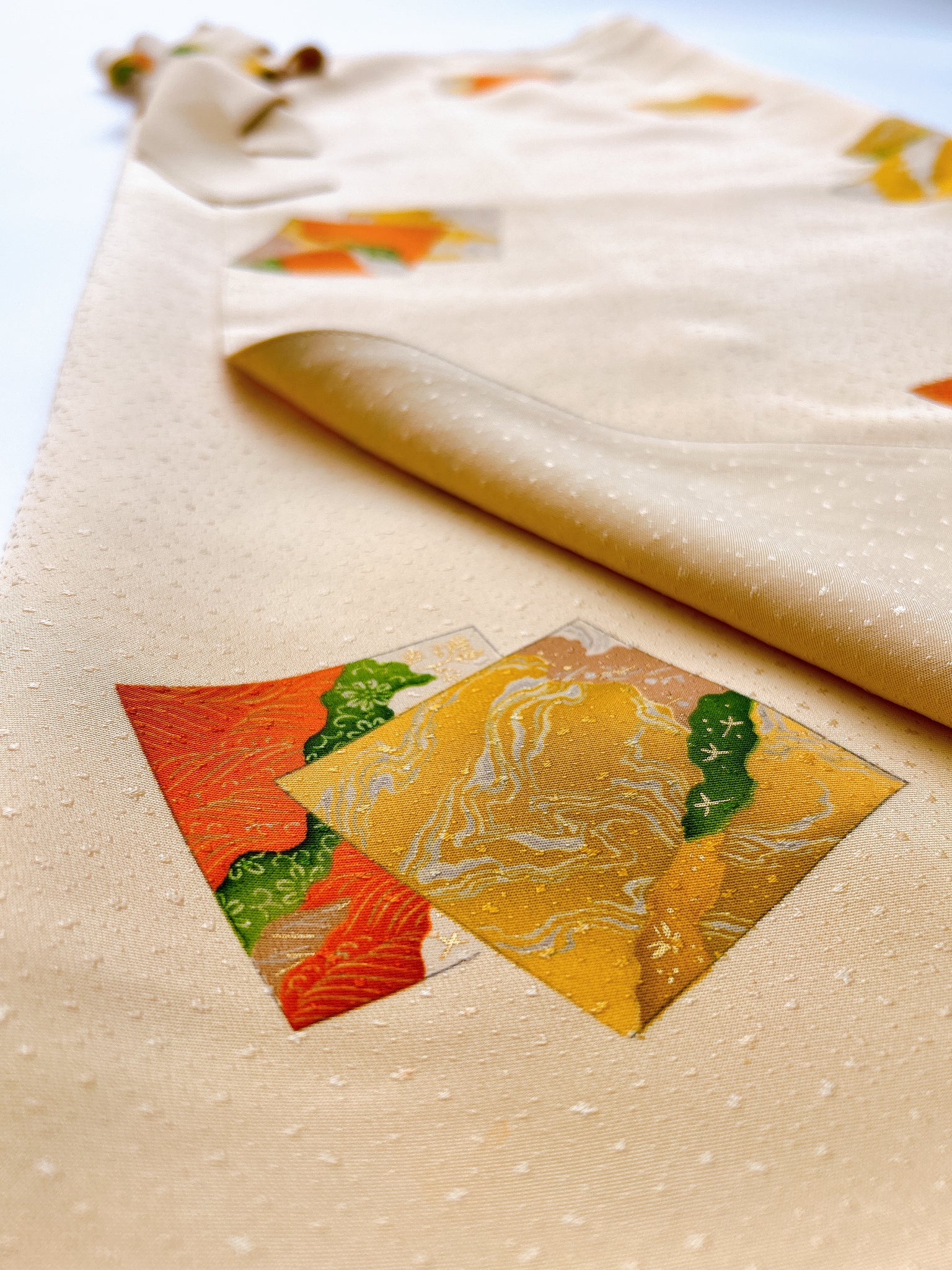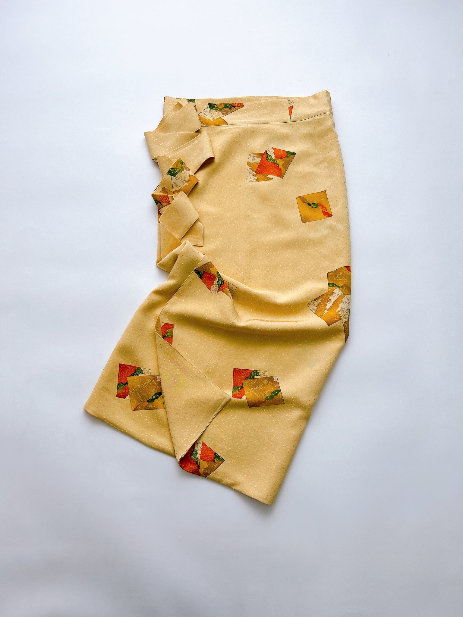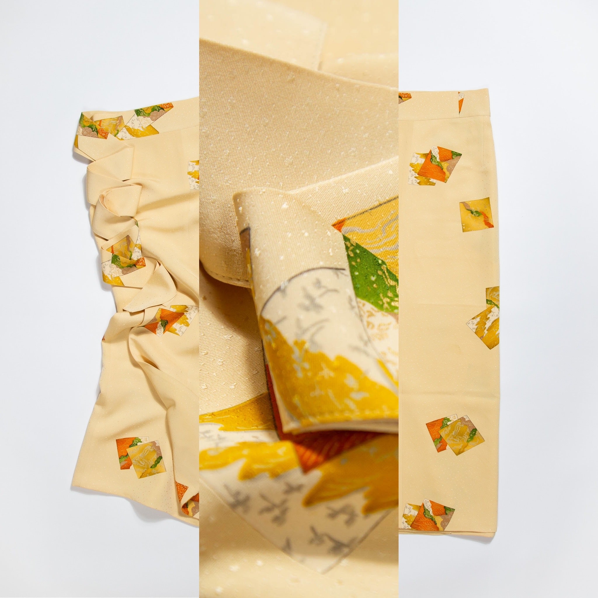 お着物一反から一着の巻きスカートをおつくりました。よりお着物に近づけながらタイトになりすぎず身体の線を拾いすぎずほどよく身体に這わせられるよう設計しした。生地も一枚でなく中も表生地を贅沢に使用しました、