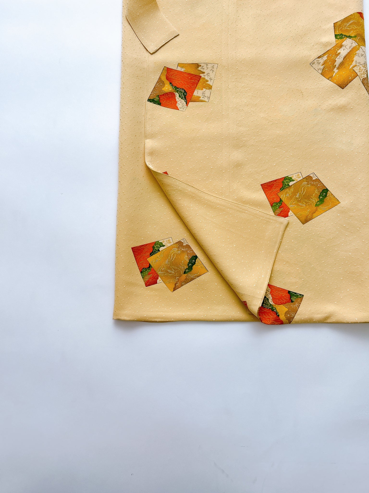 ⁑着物はシミや汚れ破れなどがつきもう着物としては着ることが難しくなったものや、ヴィンテージ、現代着物まで幅広く使用しておりますのでなるべくシミ汚れは逃がして仕立てております。が場合によっては少々アク、シミが付いてるものもございます。古いお着物の時代と時間の経過で現れるものですご理解のほどよろしくお願いもうしあげます。また正絹、化繊共に「防縮加工」をほどこしておりますので家でのお手入れが可能です。