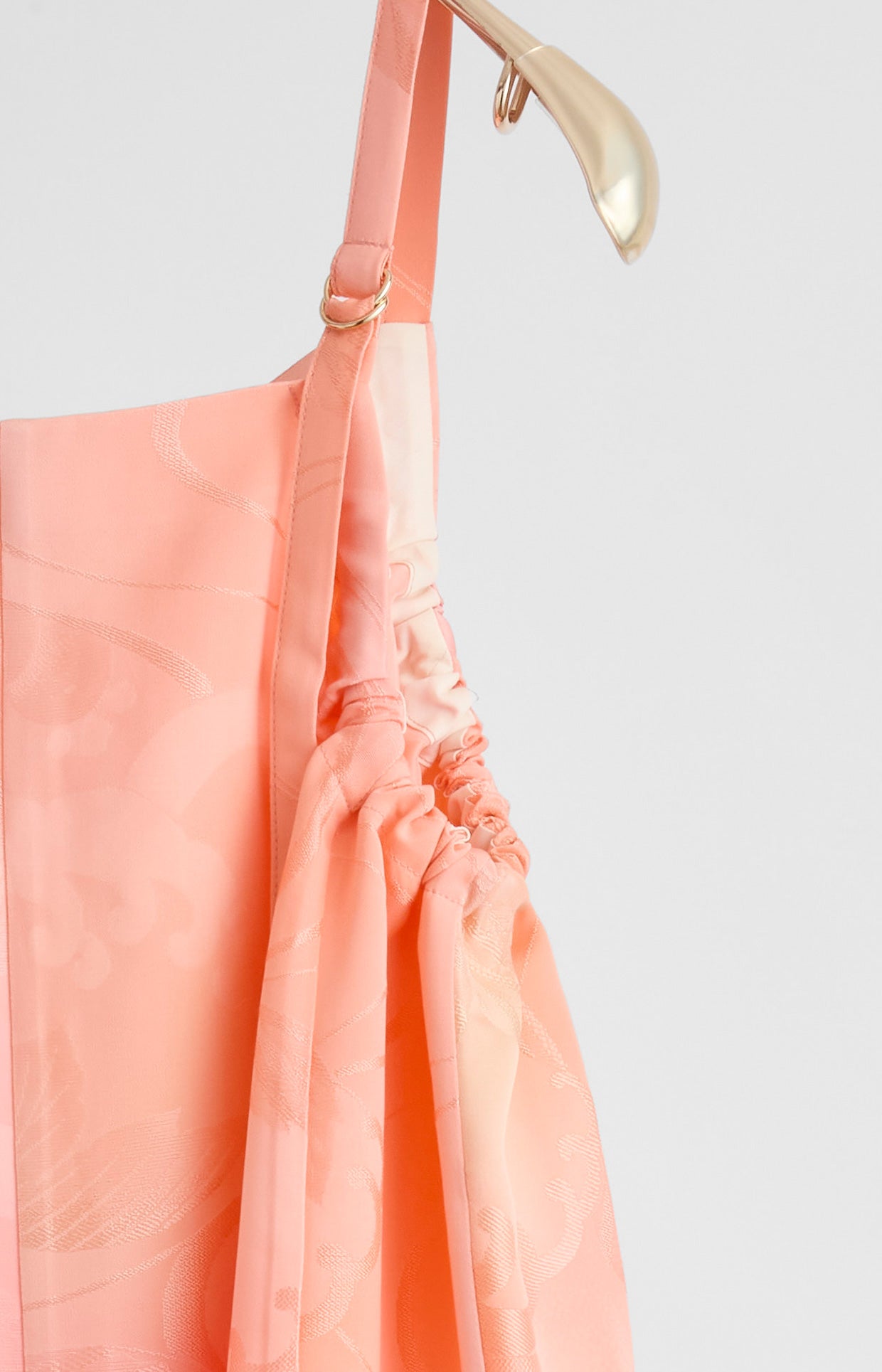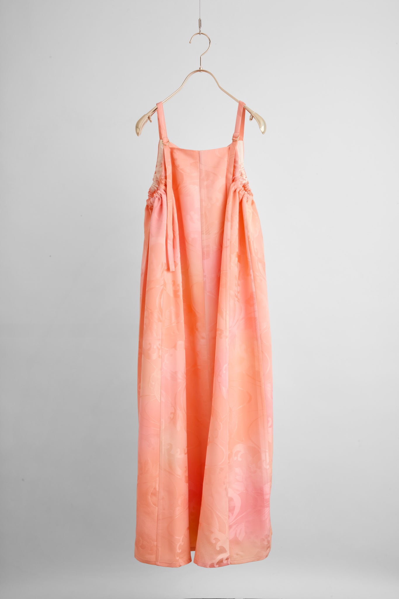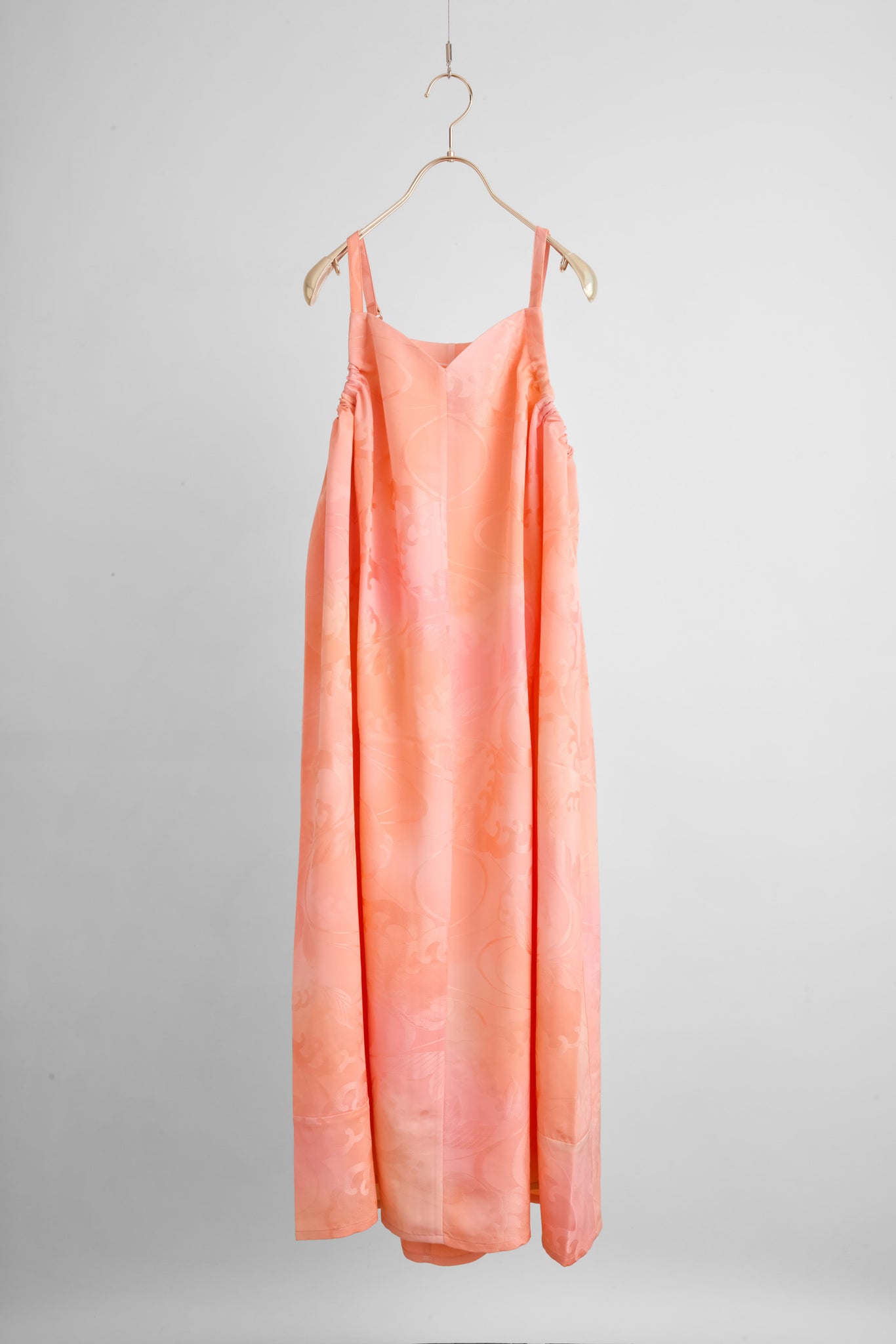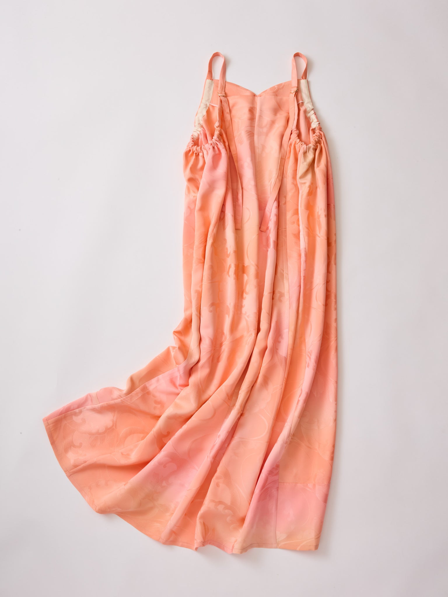 こちらのワンピースは、サイドのギャザーで胸回り、肩紐のリングで丈の両方が自分好みのサイズに長さに調整ができる一品。ほぼ垂直裁ちでおつくりしておりますので着たときしっかり布の重みで落ち感がつくれるようにしました。