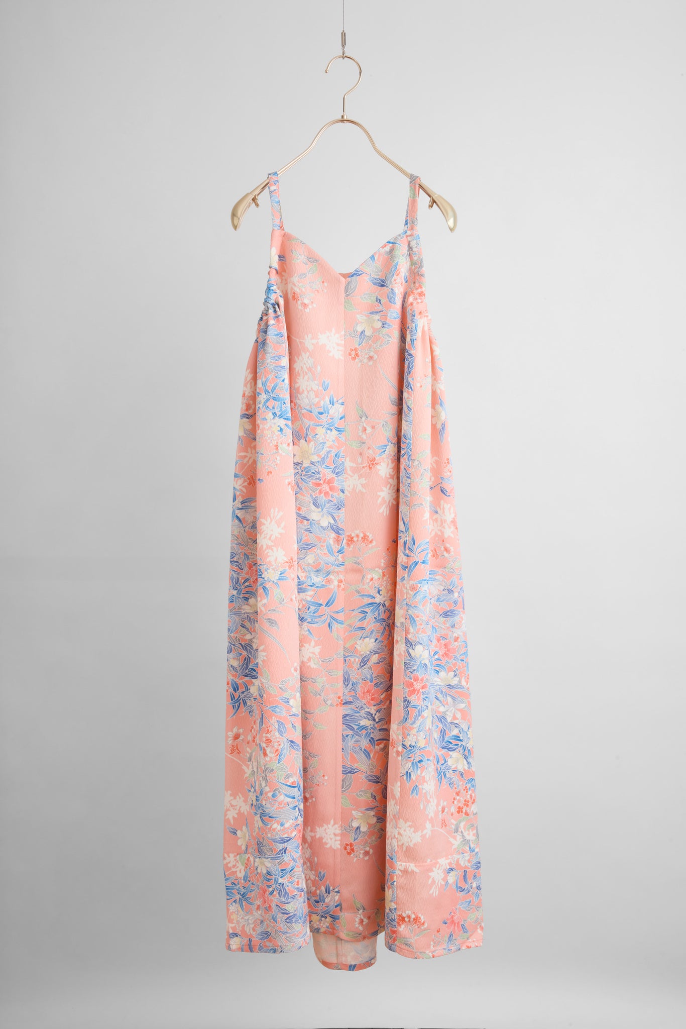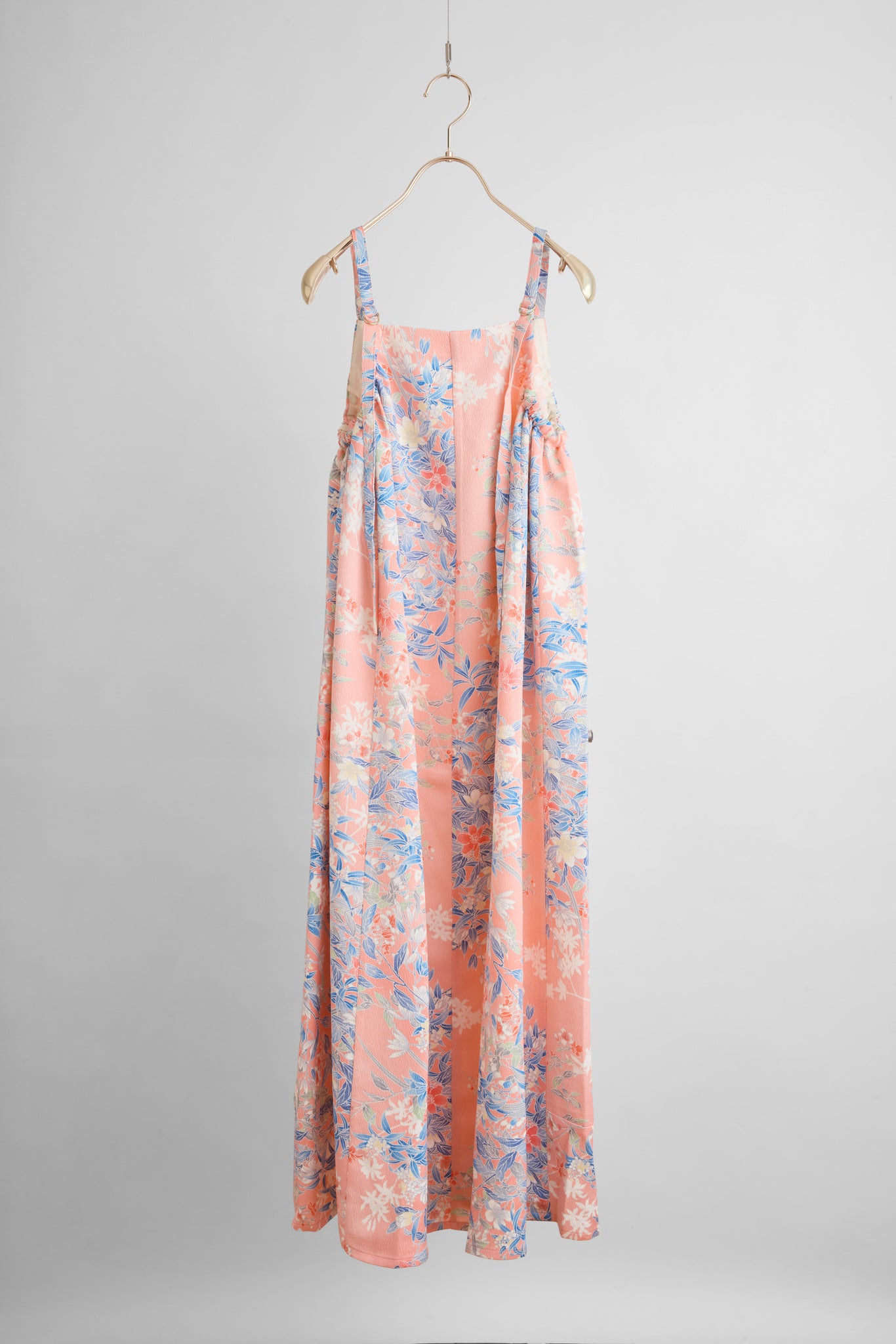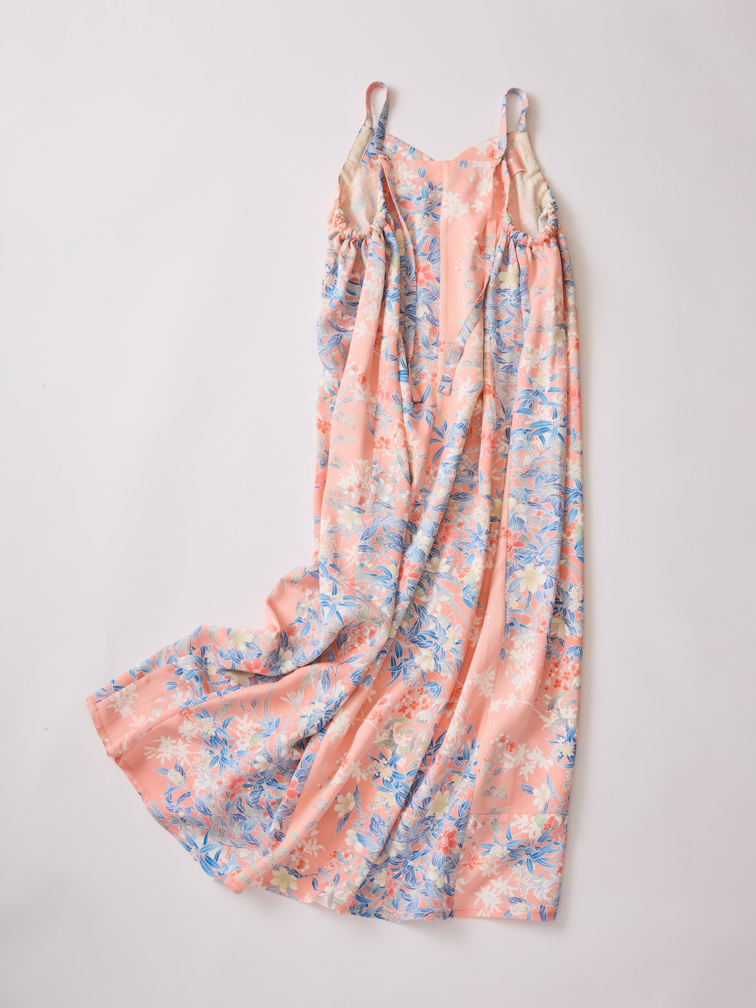 こちらのワンピースは、サイドのギャザーで胸回り、肩紐のリングで丈の両方が自分好みのサイズに長さに調整ができる一品。ほぼ垂直裁ちでおつくりしておりますので着たときしっかり布の重みで落ち感がつくれるようにしました。