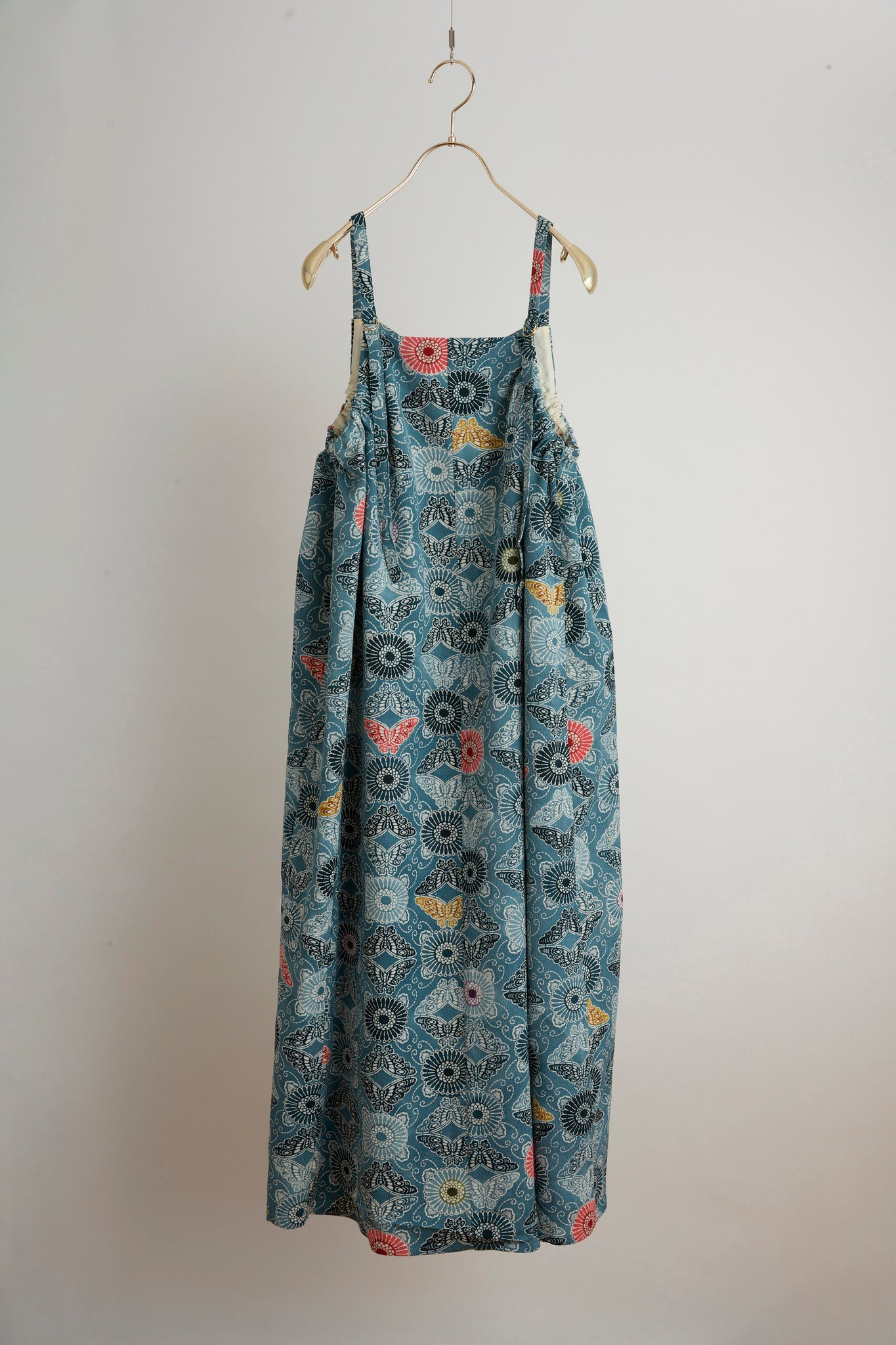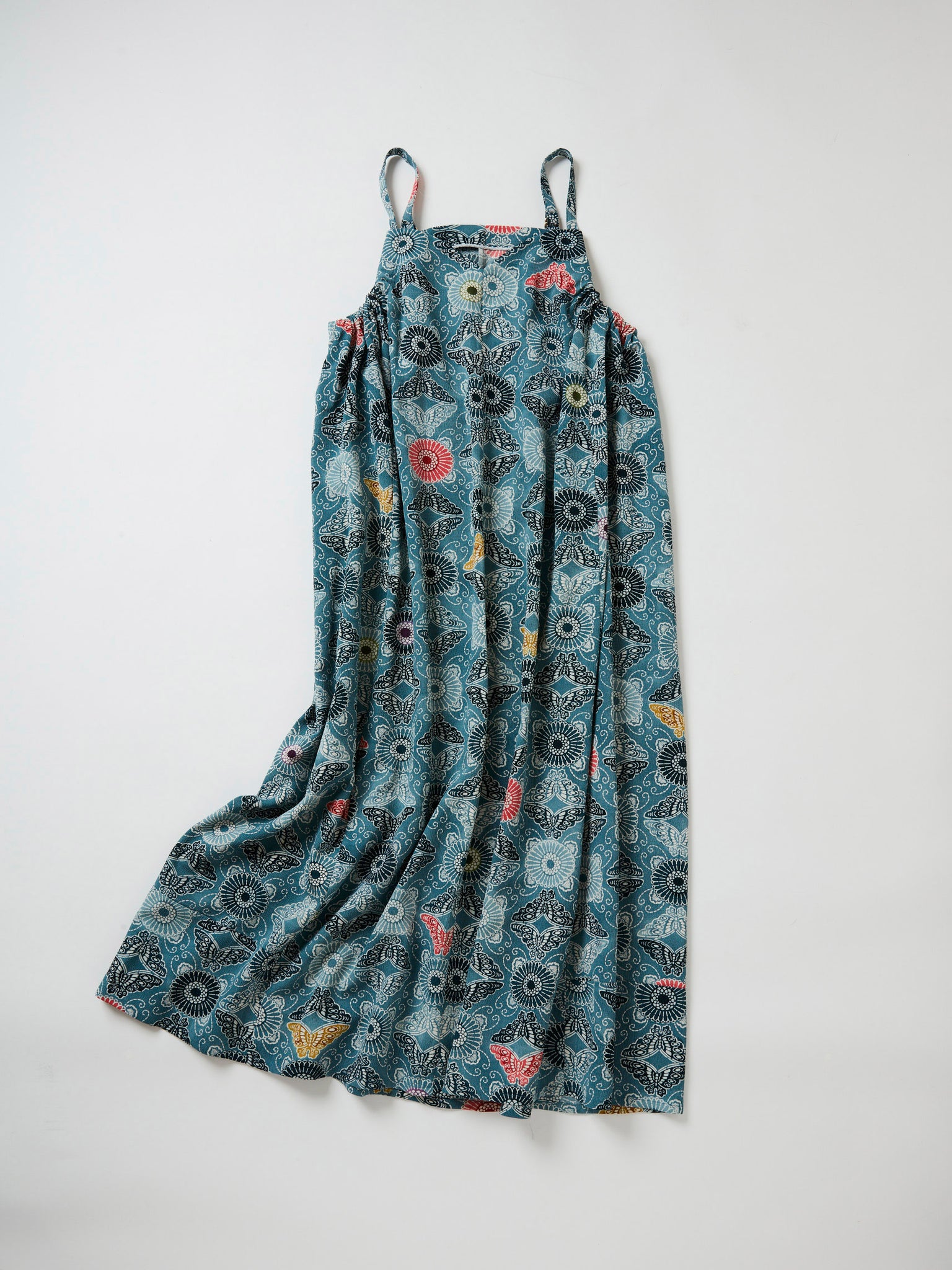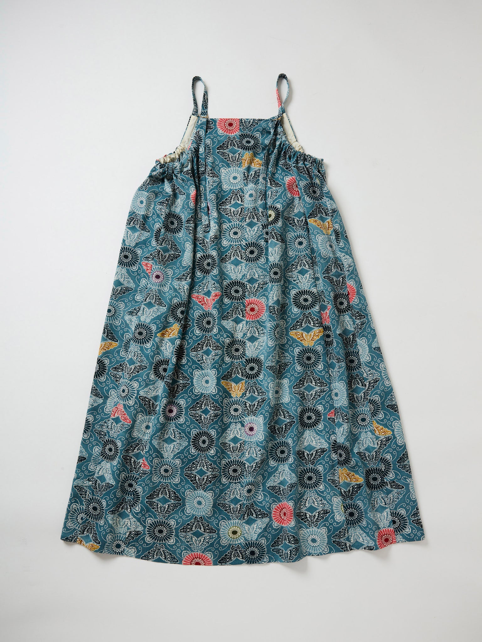 こちらのワンピースは、サイドのギャザーの寄せ具合で胸回り、肩紐のリングで丈の長さ、両方が好みのサイズに調整ができる一品。ほぼ垂直裁ちでおつくりしておりますので着たときしっかり布の重みで落ち感がつくれるようになっております