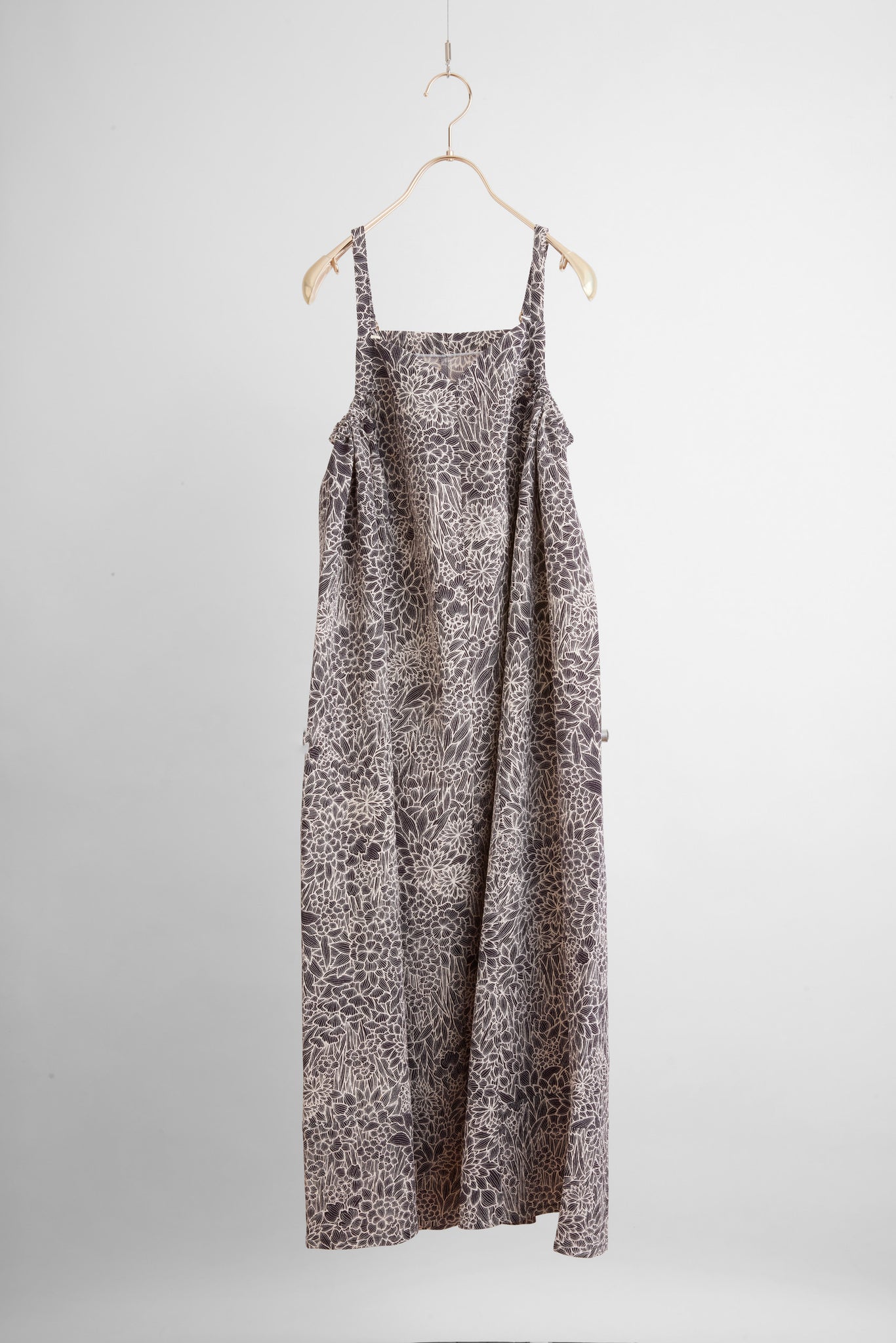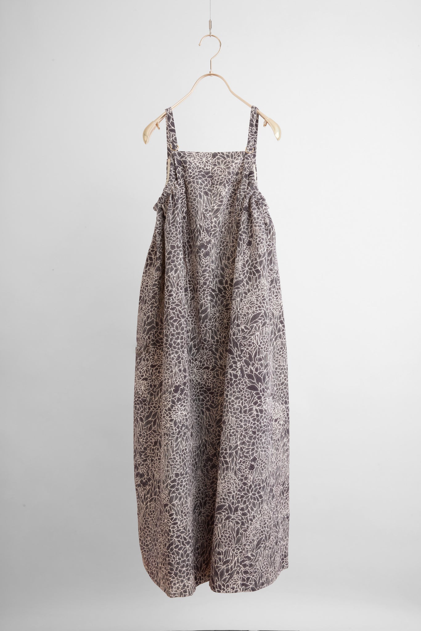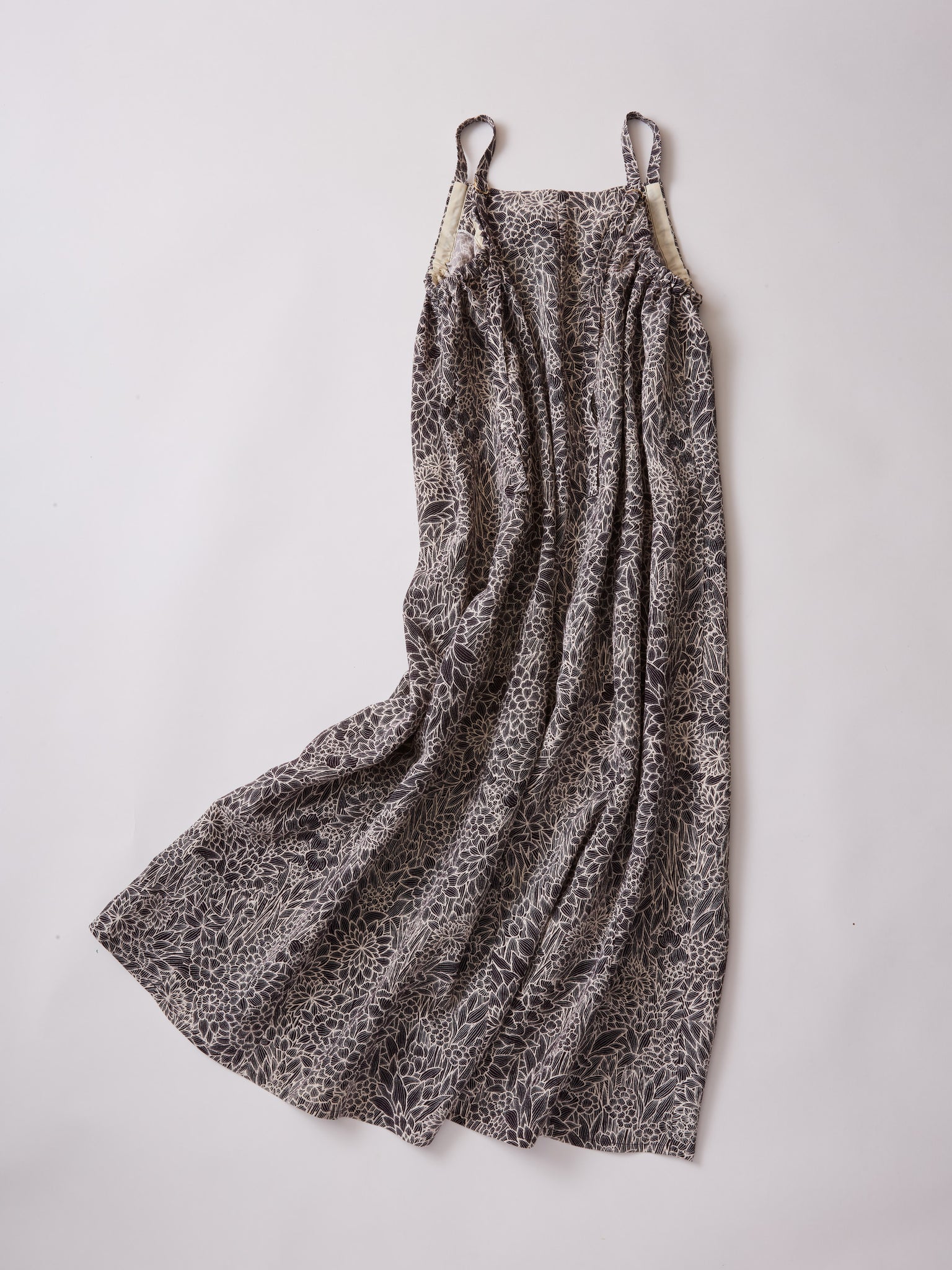 こちらのワンピースは、サイドのギャザーで胸回り、肩紐のリングで丈の両方が自分好みのサイズに長さに調整ができる一品。ほぼ垂直裁ちでおつくりしておりますので着たときしっかり布の重みで落ち感がつくれるようにしました。