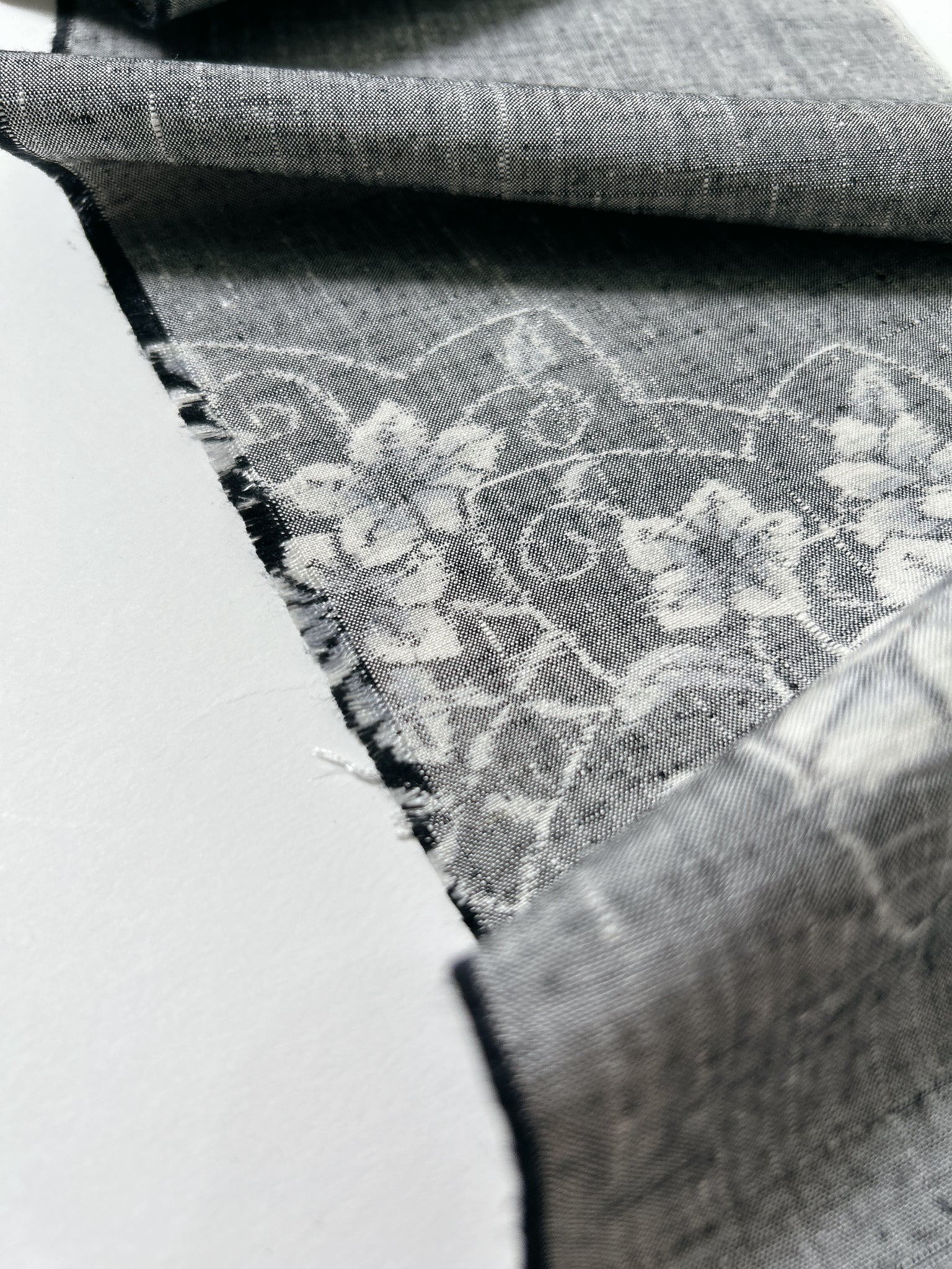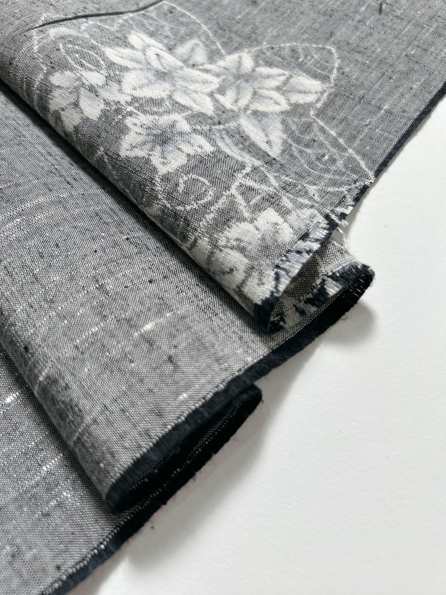 デニムジャケットの3rdモデルをもとに、リアレンジした品でございます。デニム本来の風合いを再現するため、内側全面に布芯を張り、肉厚な質感を生み出しました。これにより、着物地でありながらも、しっかりとした立体感と重厚さを持たせております。