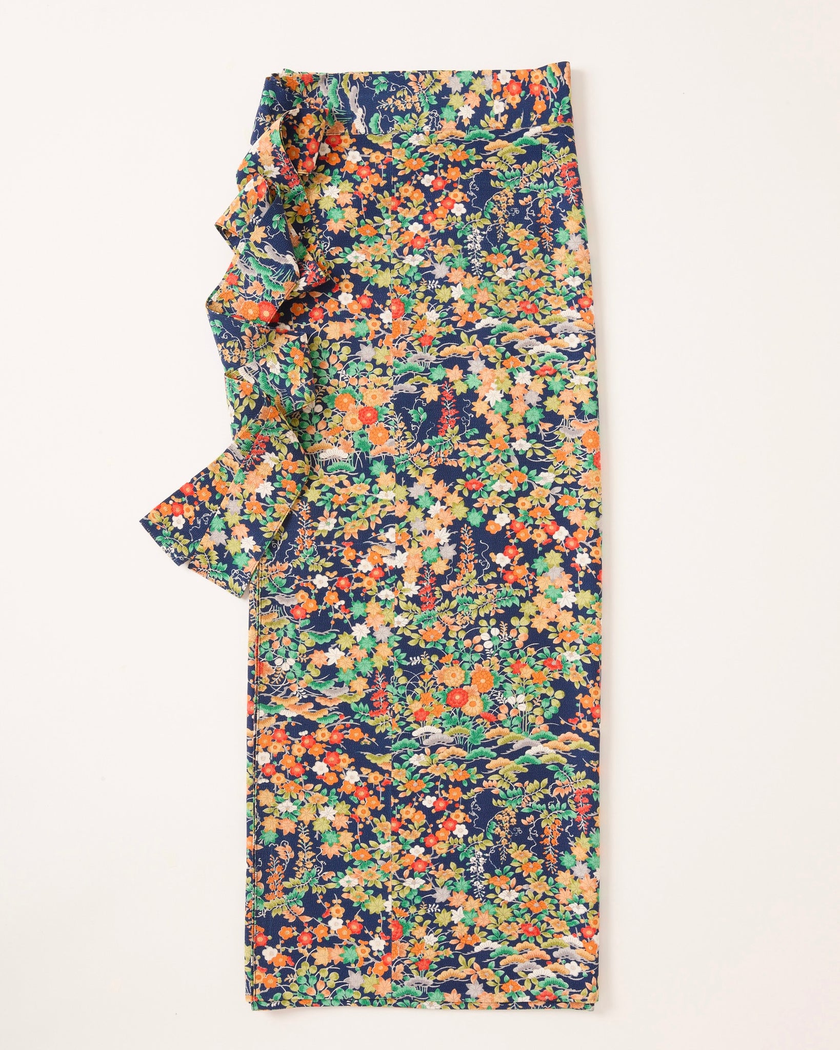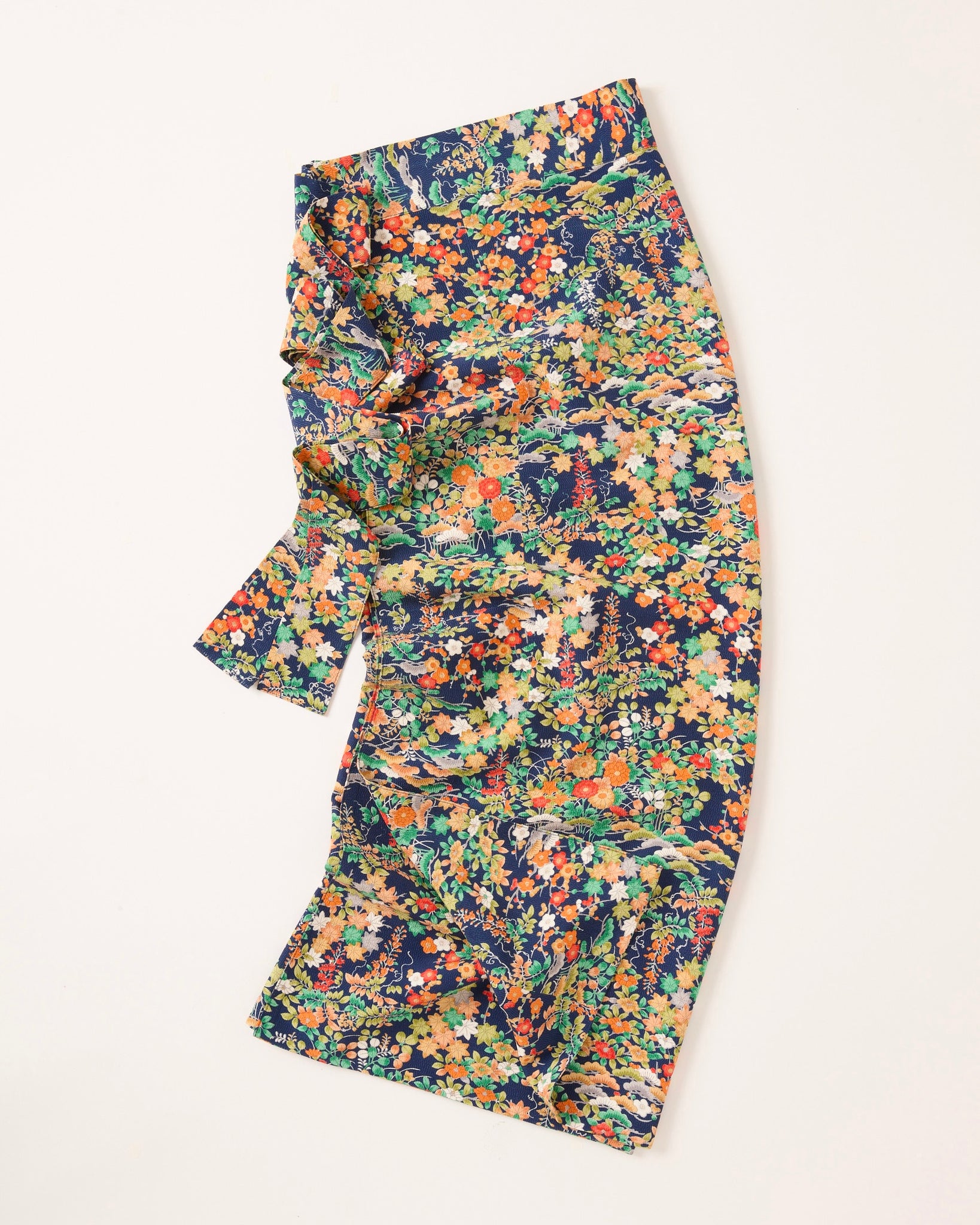 お着物一着一反を余すことなく全て使い、世界でたった一着の巻きスカートをおつくりました。よりお着物に近づけながらタイトになりすぎず身体の線を拾いすぎずほどよく身体に這わせられるよう設計しました。生地も一枚ではなく裏にも表生地を贅沢に使用した2枚合わせのお品です。身体の線を拾いすぎずしっかり歩くことも可能です。