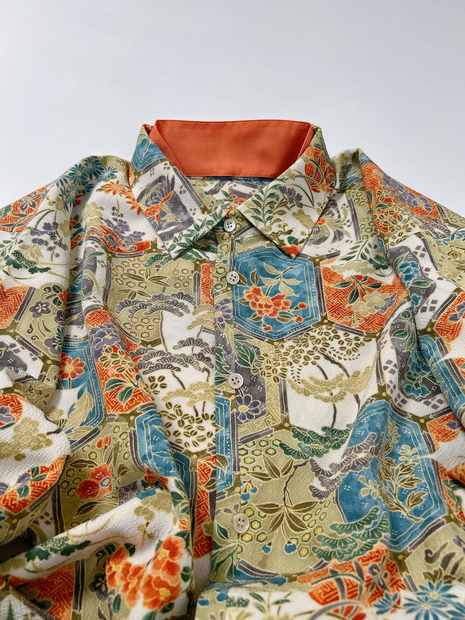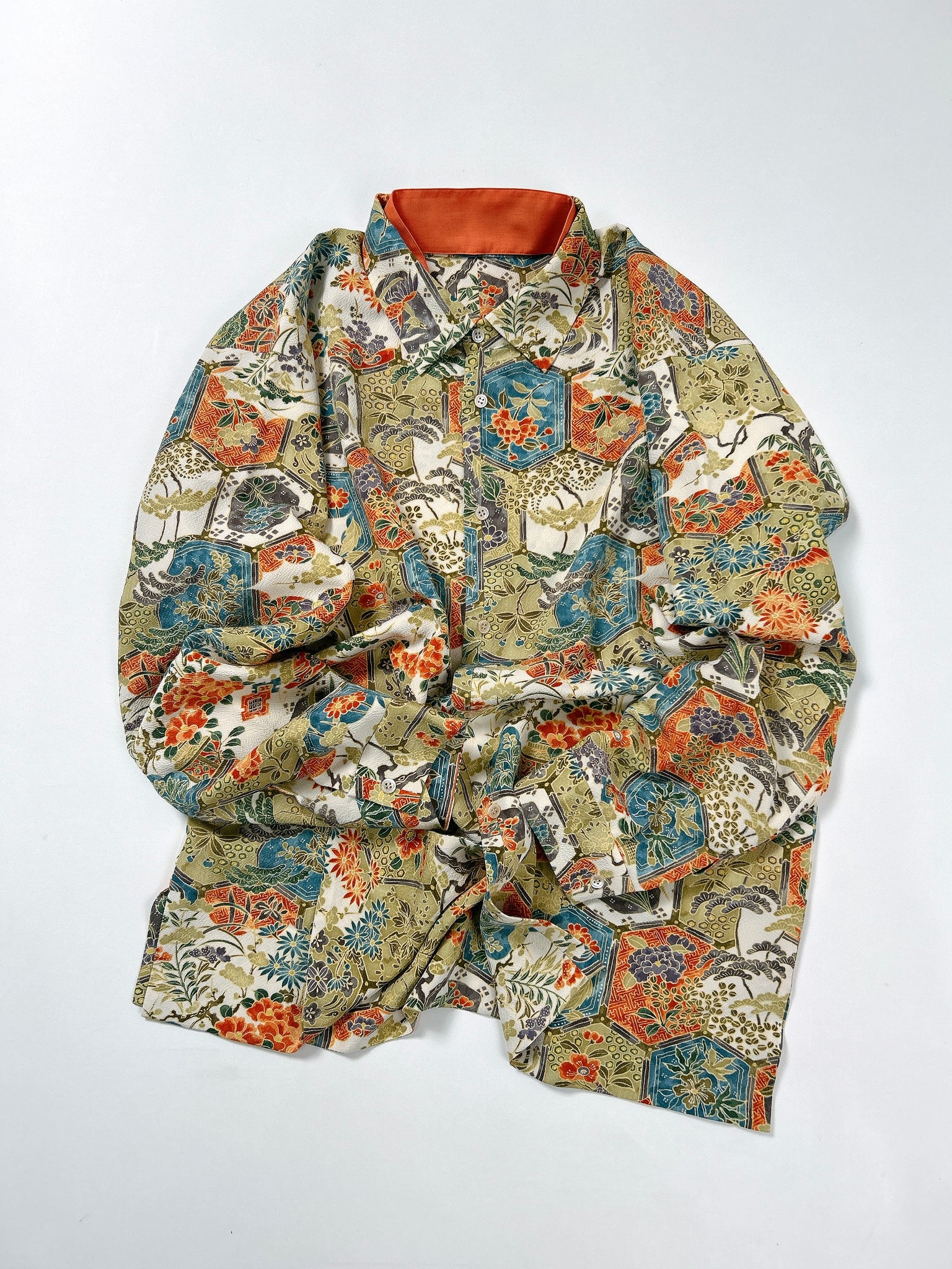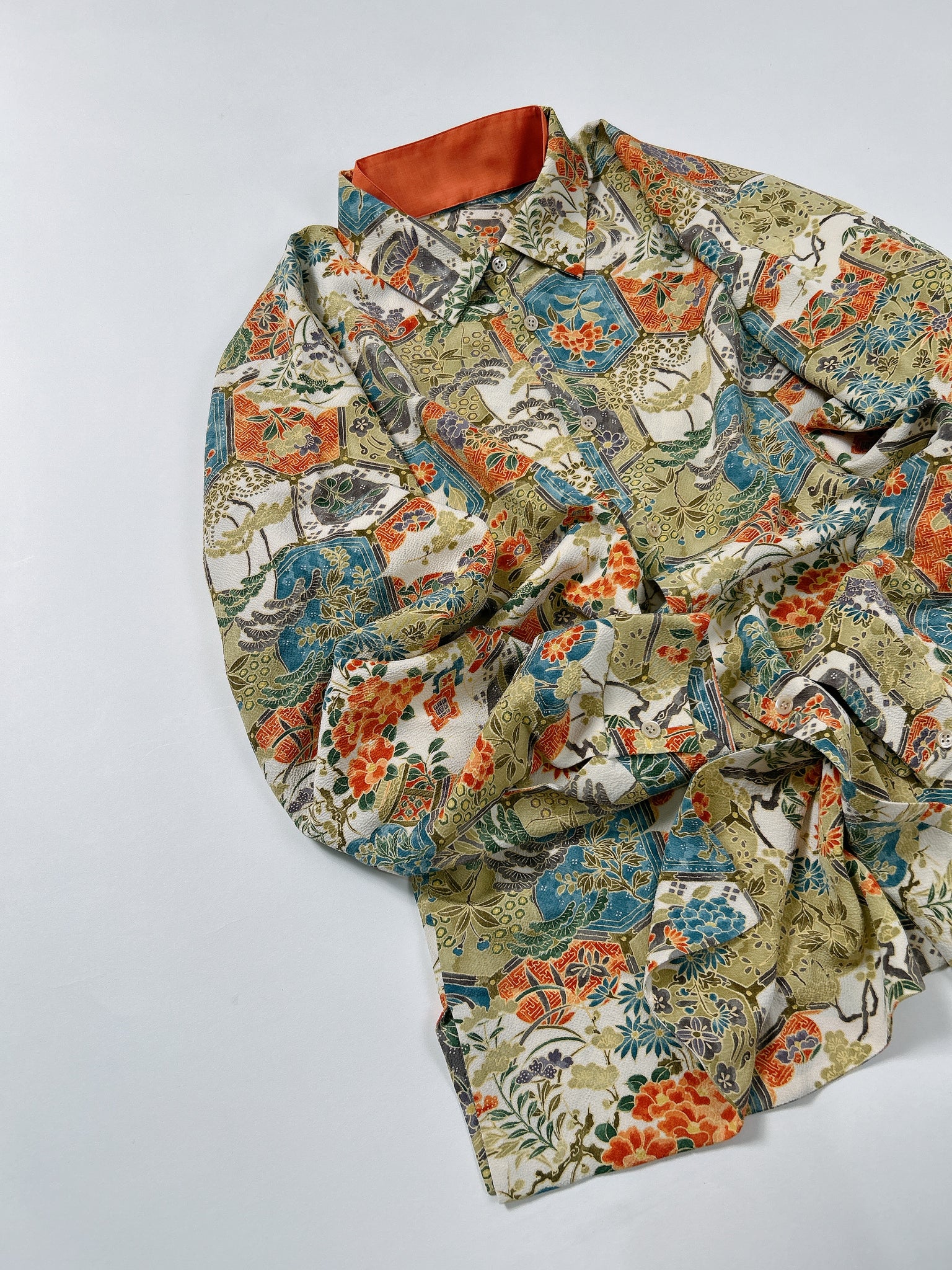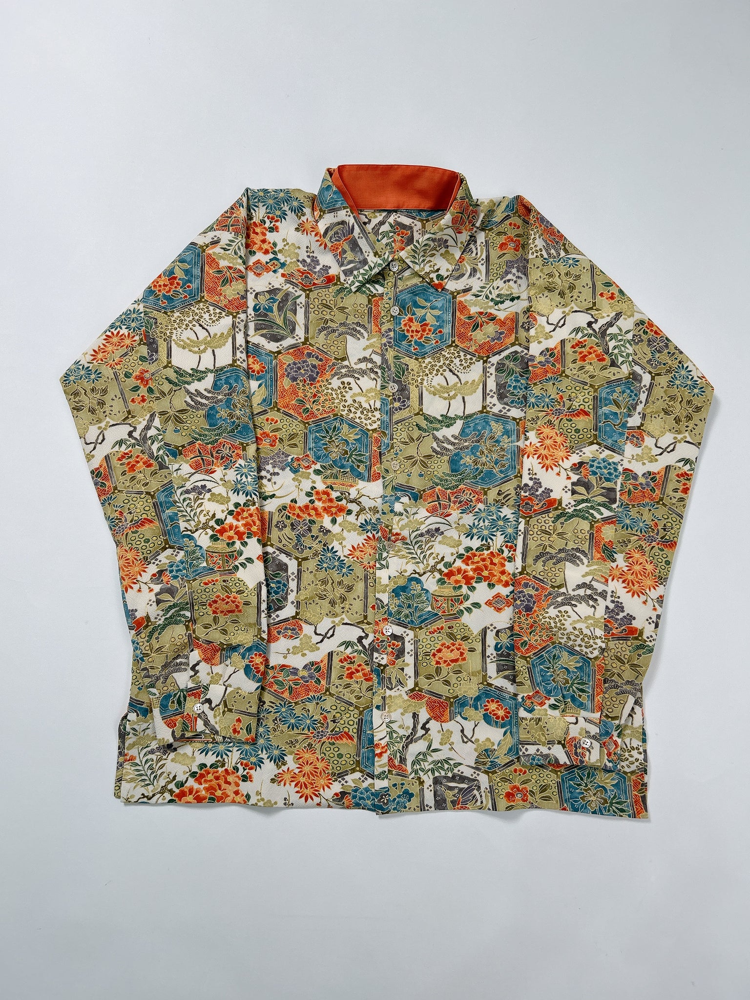 これまでと変わらず、ケニシャツは一反(約12メートル)のお着物生地を余すことなく使用し、総裏仕立ての二枚合わせにてお作りしております。そのため、程よい厚みと重みがあり、お着物一反から一点のみお作りできる、貴重なお品です。