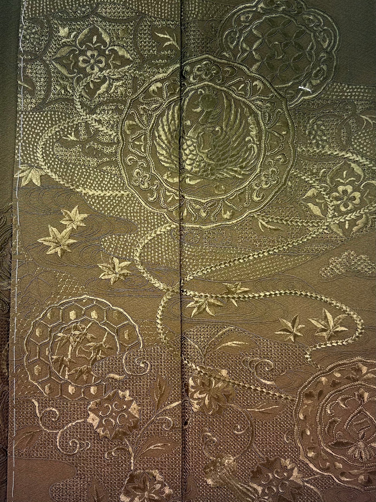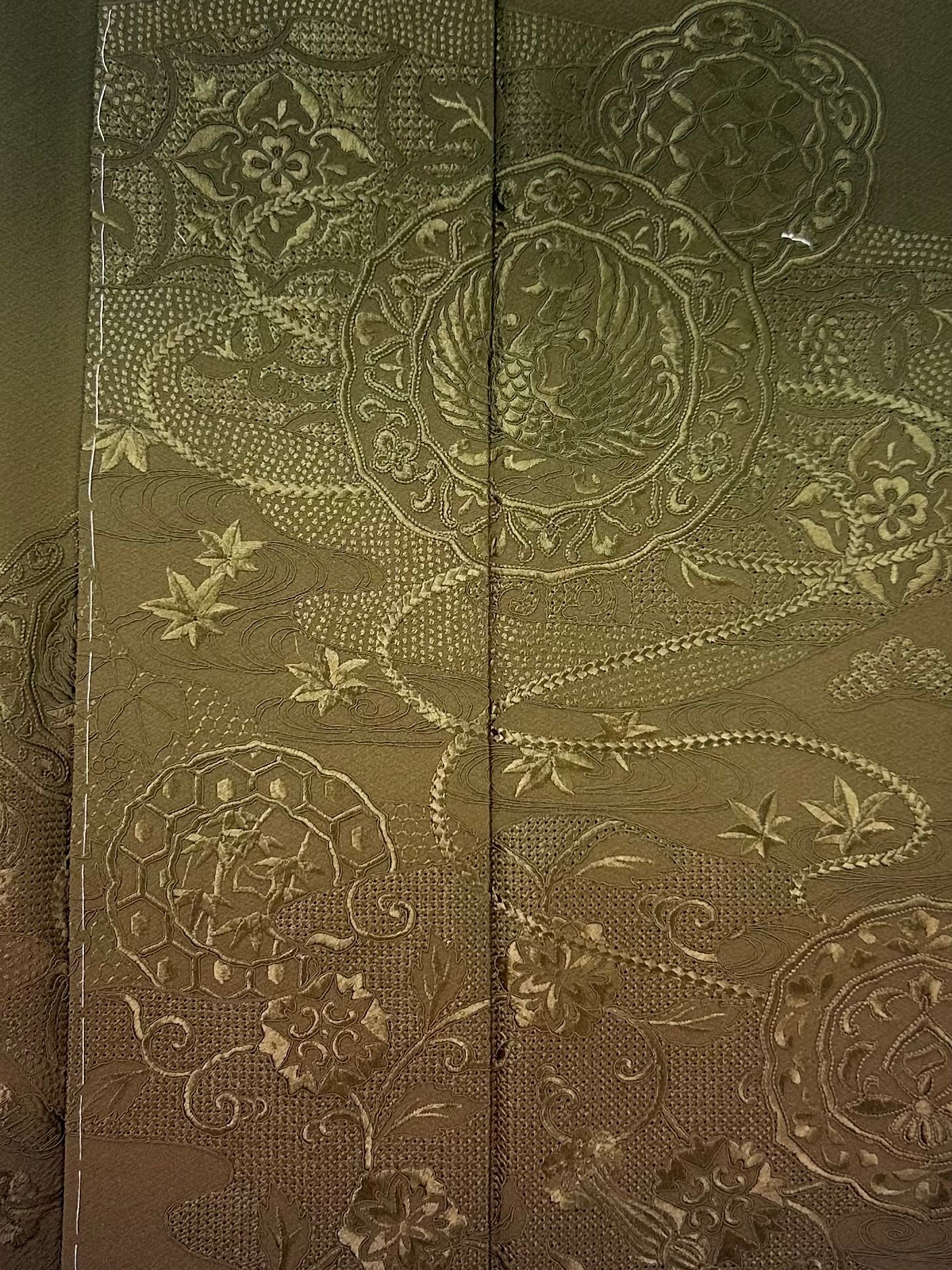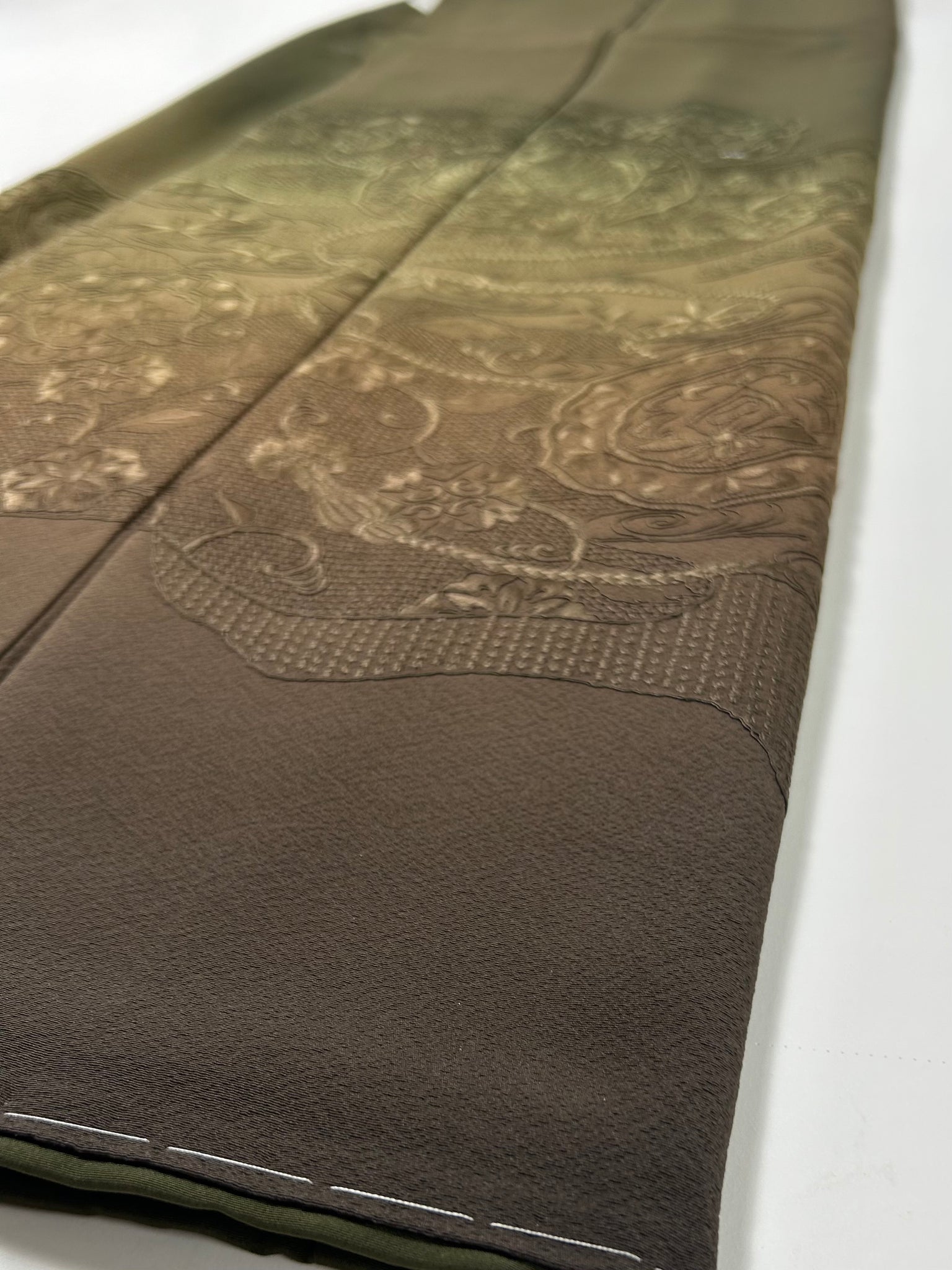 訪問着や付け下げは箔加工や刺繍、模様絵付けが特殊です。また胴裏、八掛がついておりますため水洗い厳禁。水に濡れると色移りする可能性がございます。お手入れはドライクリーニングにてお願い申し上げます。