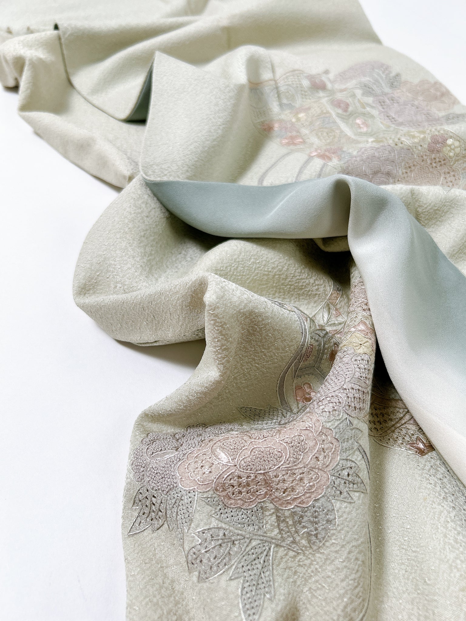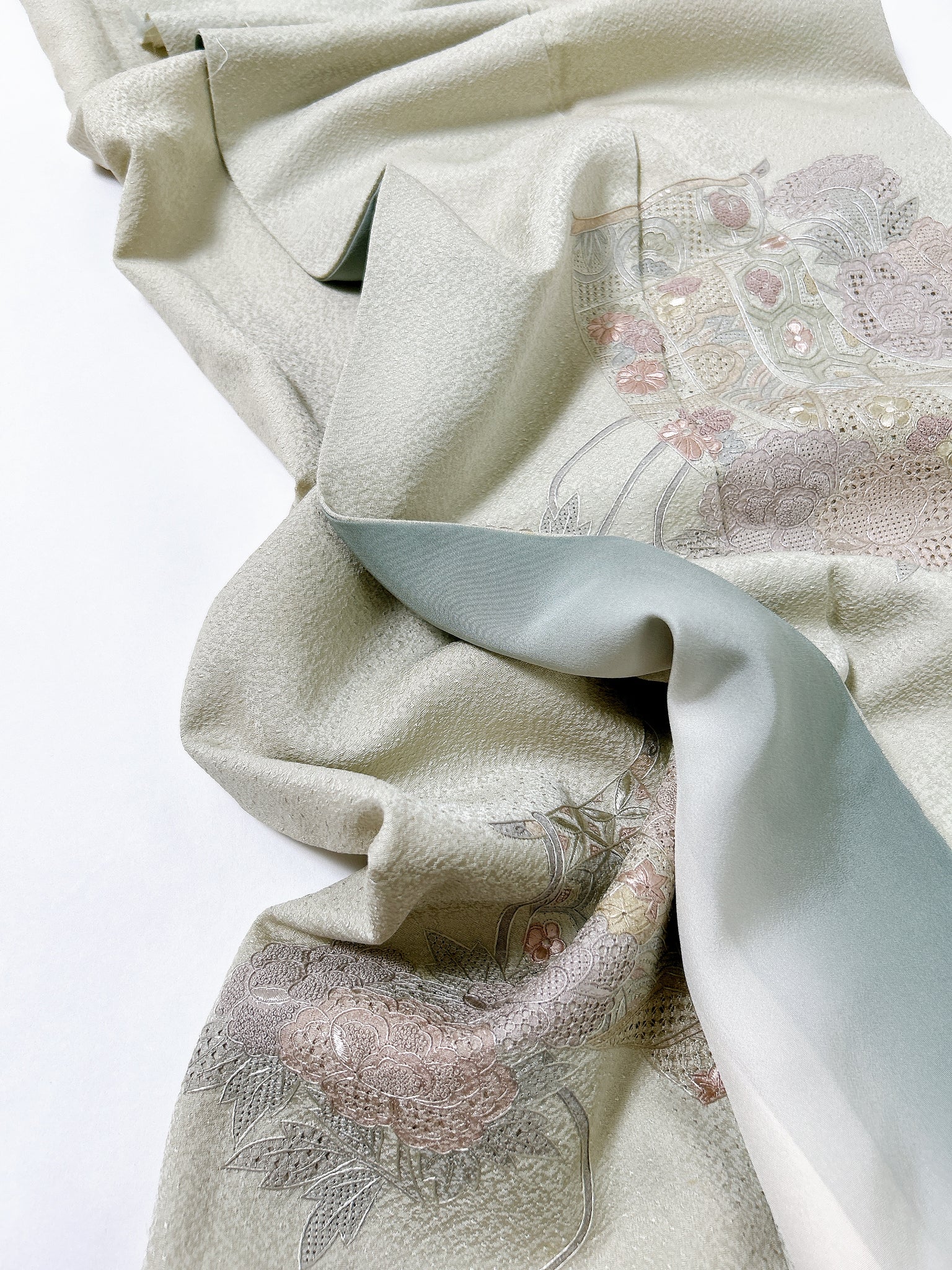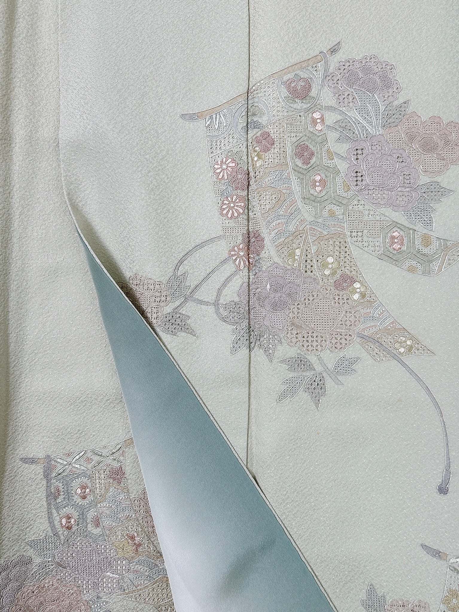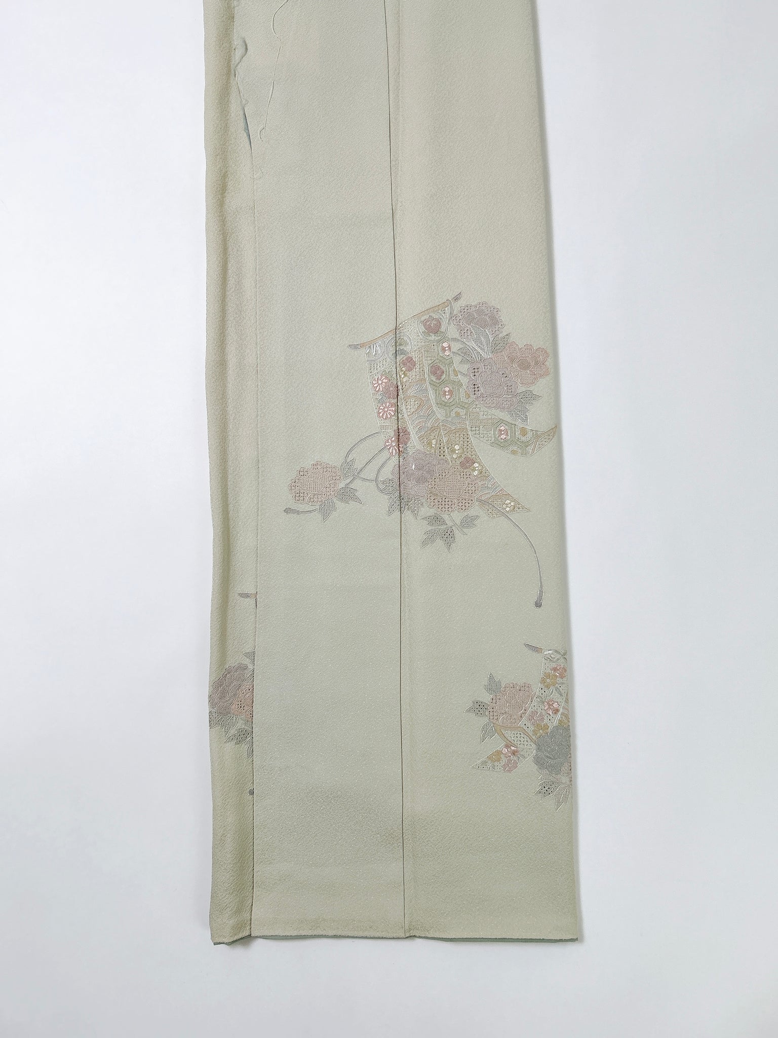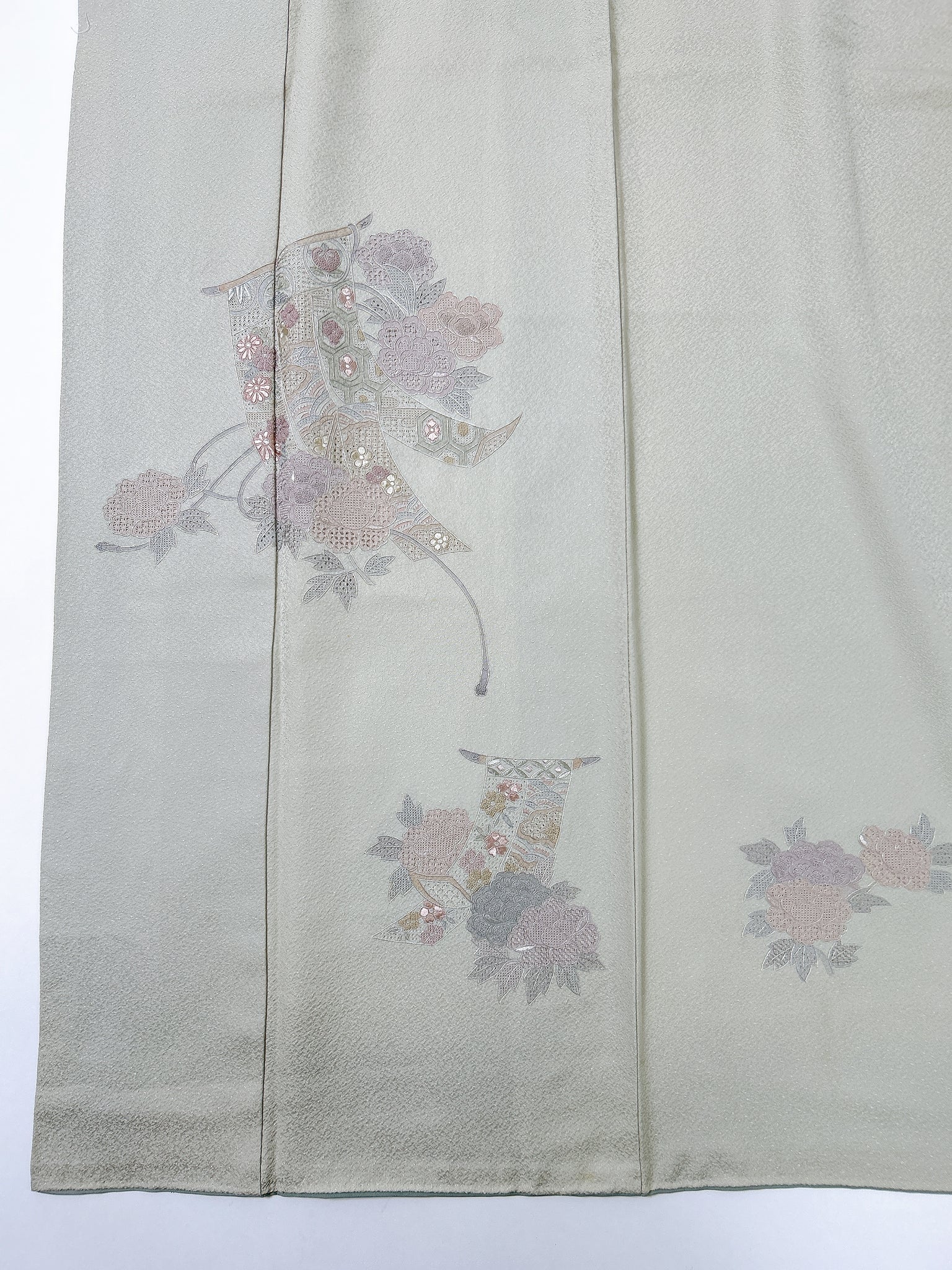 訪問着や付け下げは箔加工や刺繍、模様絵付けが特殊です。また胴裏、八掛がついておりますため水洗い厳禁。水に濡れると色移りする可能性がございます。お手入れはドライクリーニングにてお願い申し上げます。