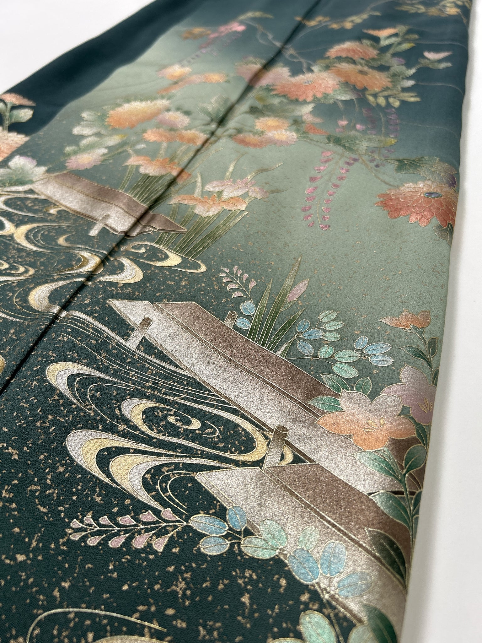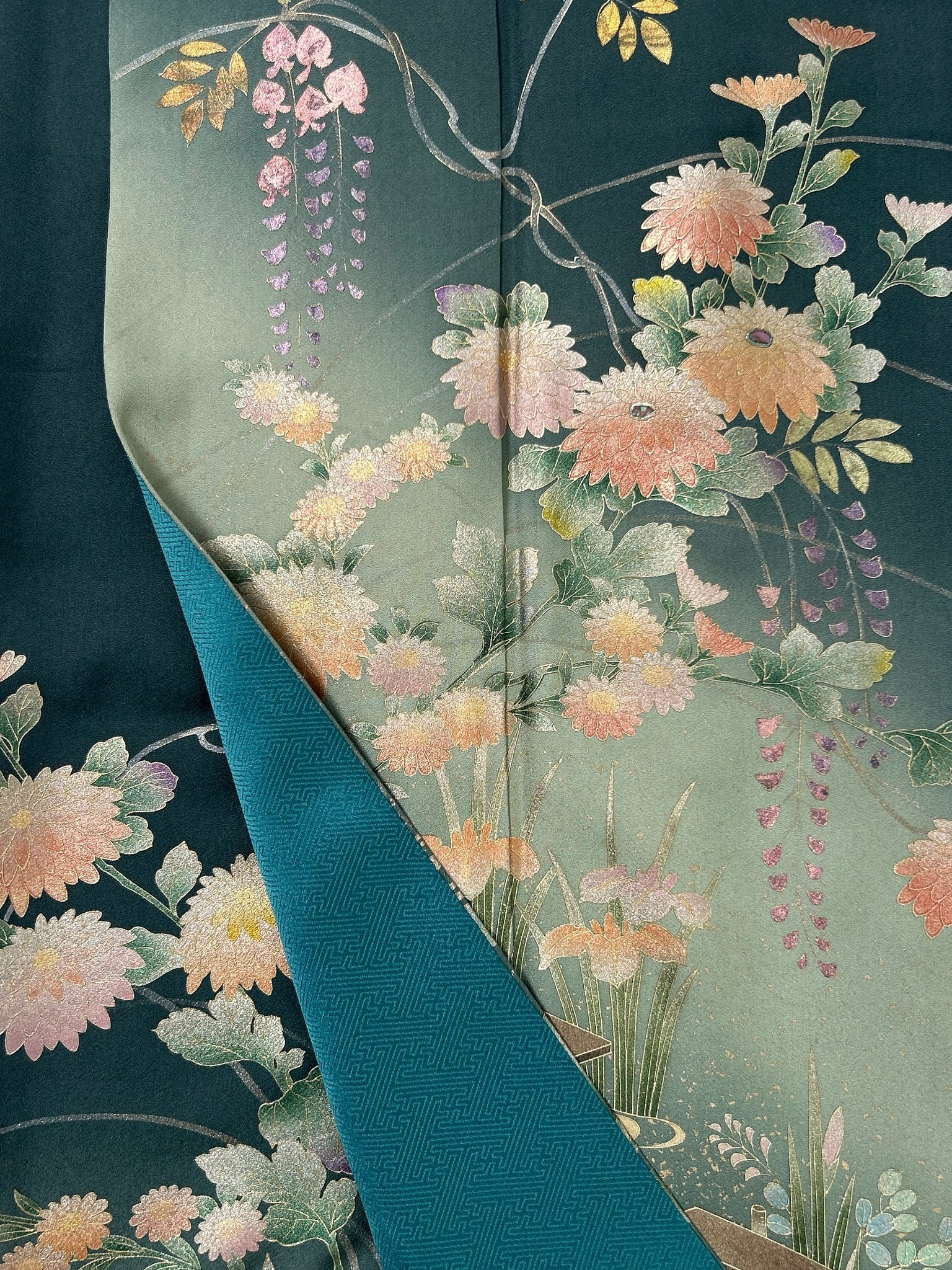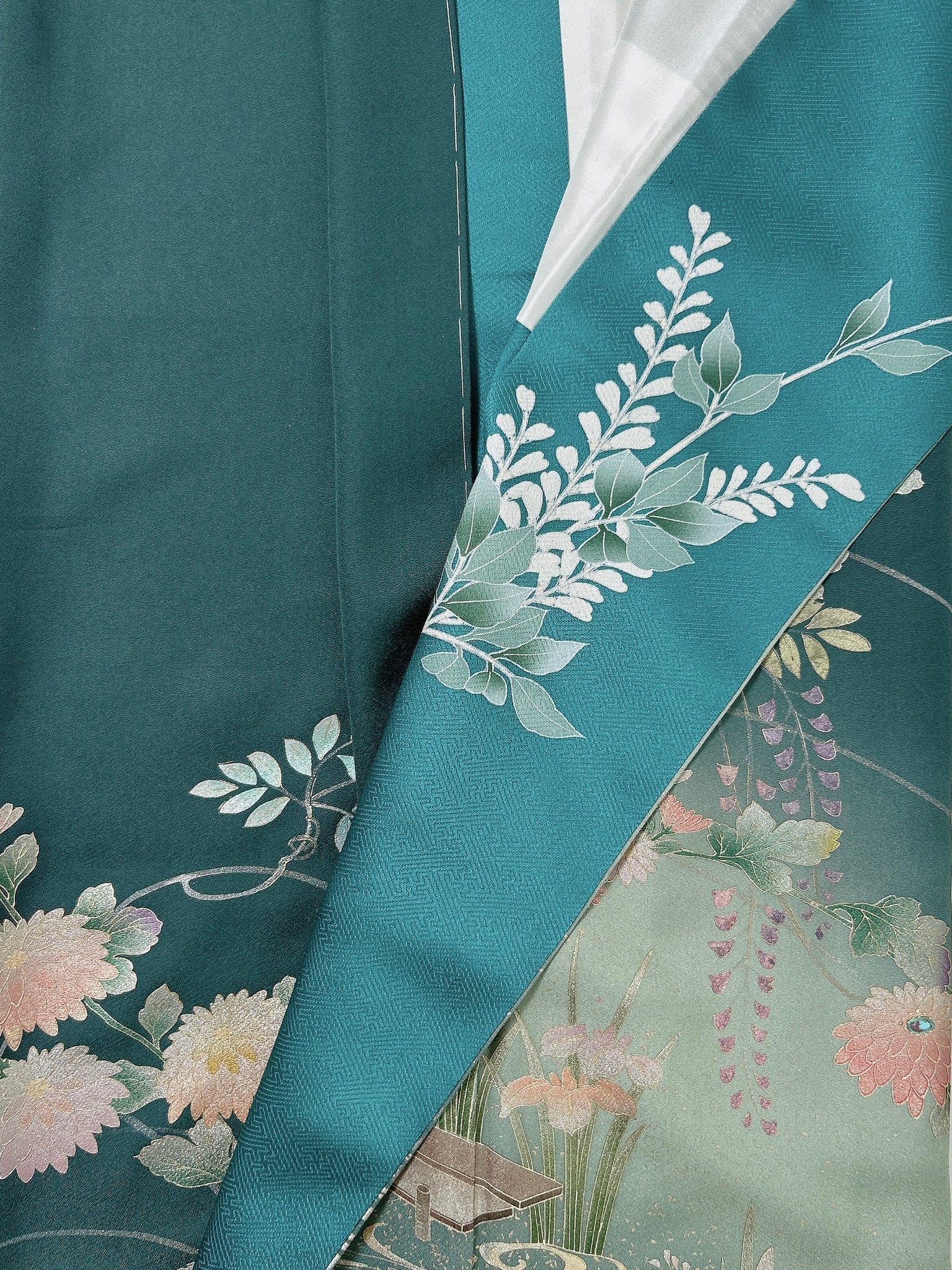 訪問着や付け下げは箔加工や刺繍、模様絵付けが特殊です。また胴裏、八掛がついておりますため水洗い厳禁。水に濡れると色移りする可能性がございます。お手入れはドライクリーニングにてお願い申し上げます。