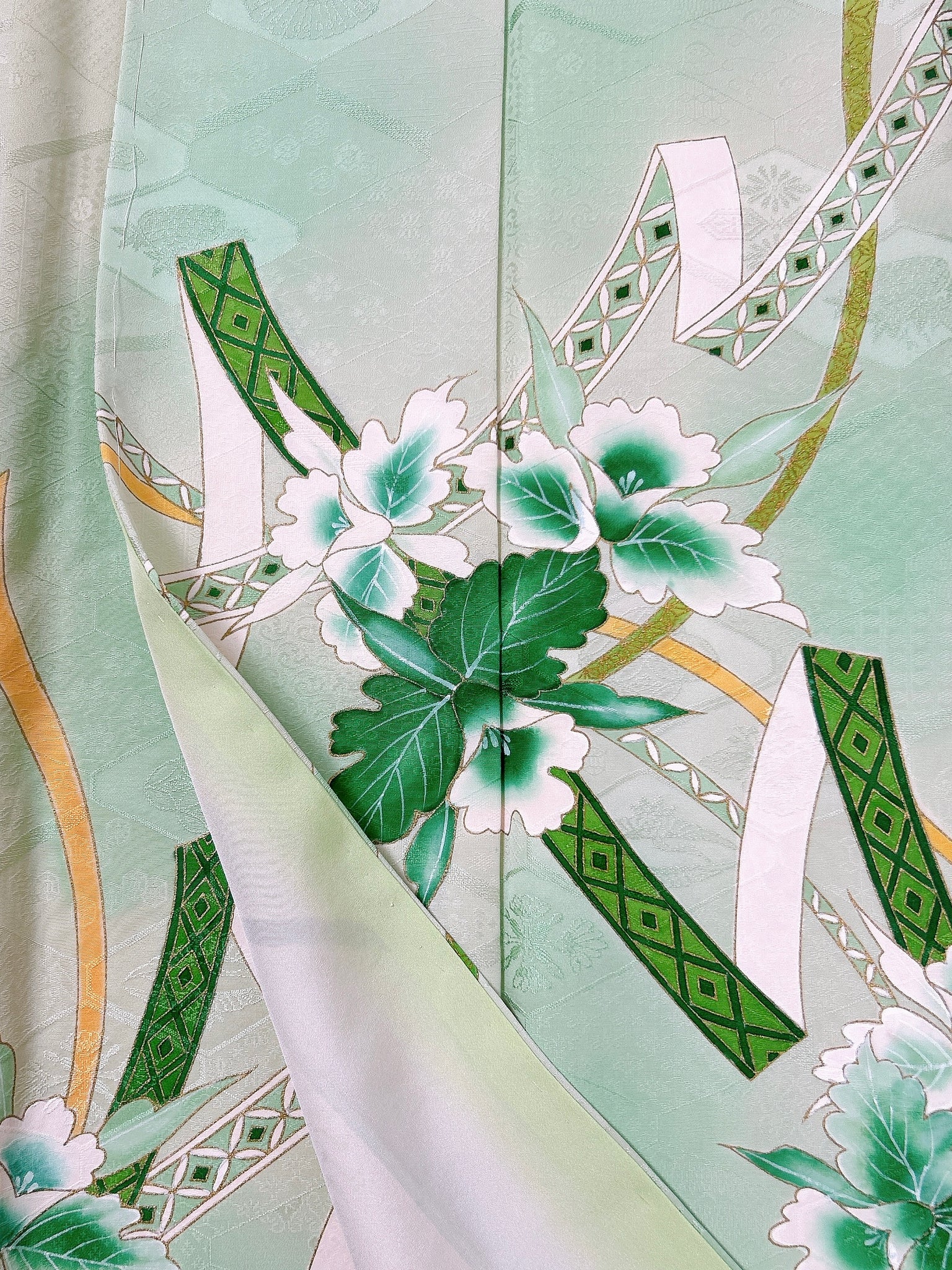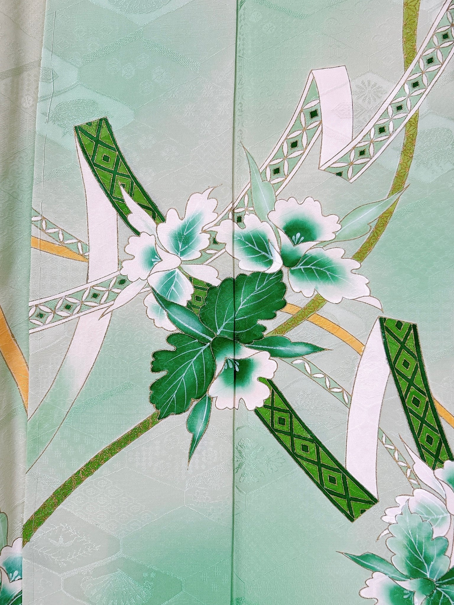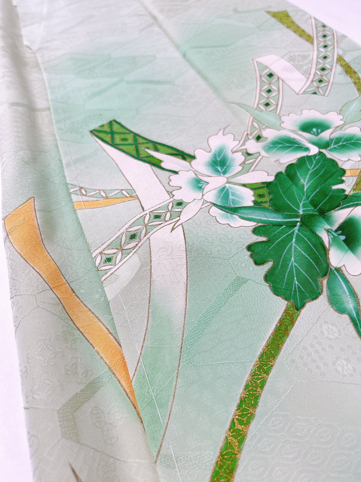訪問着や付け下げは箔加工や刺繍、模様絵付けが特殊です。また胴裏、八掛がついておりますため水洗い厳禁。水に濡れると色移りする可能性がございます。お手入れはドライクリーニングにてお願い申し上げます。
