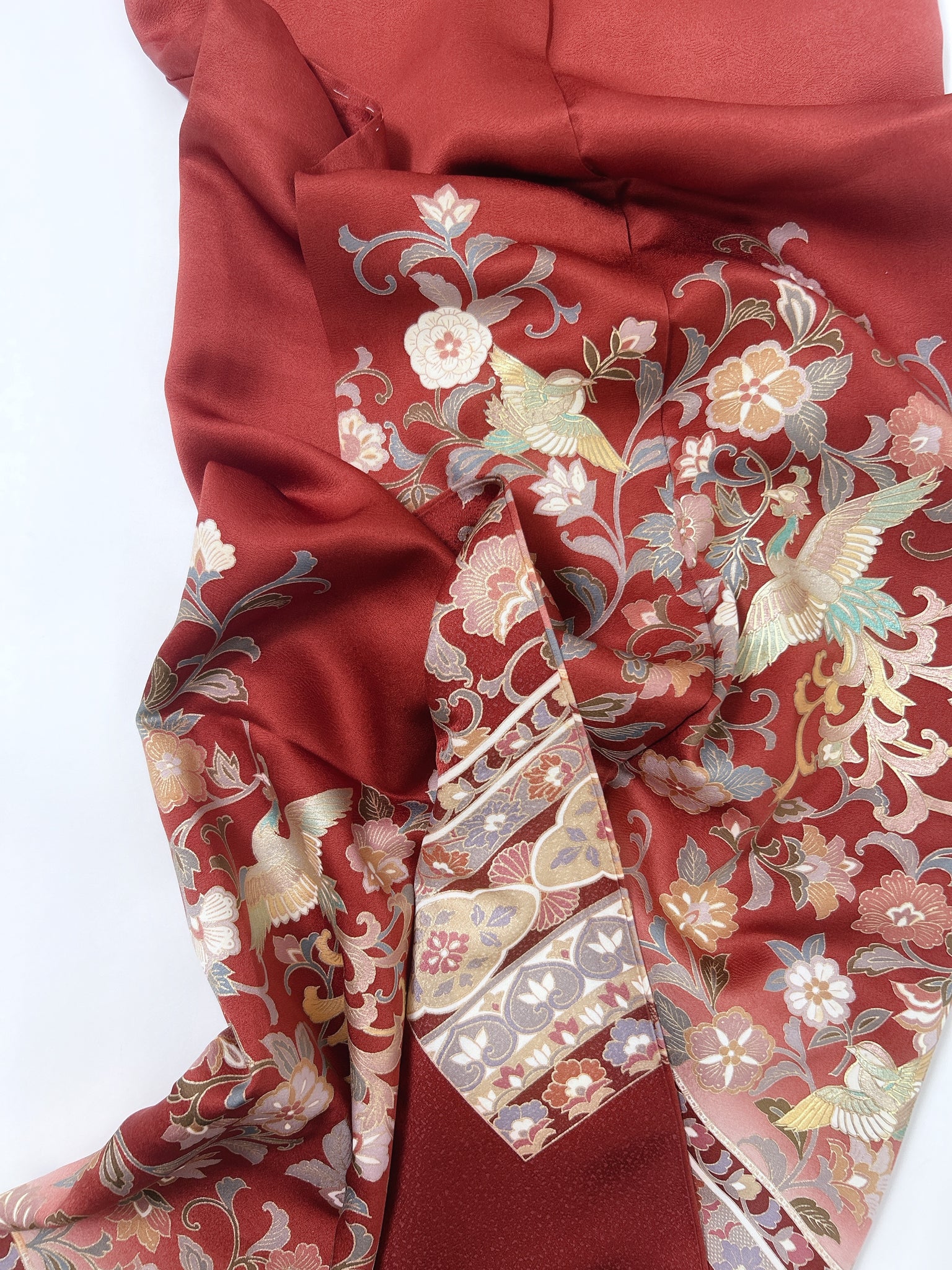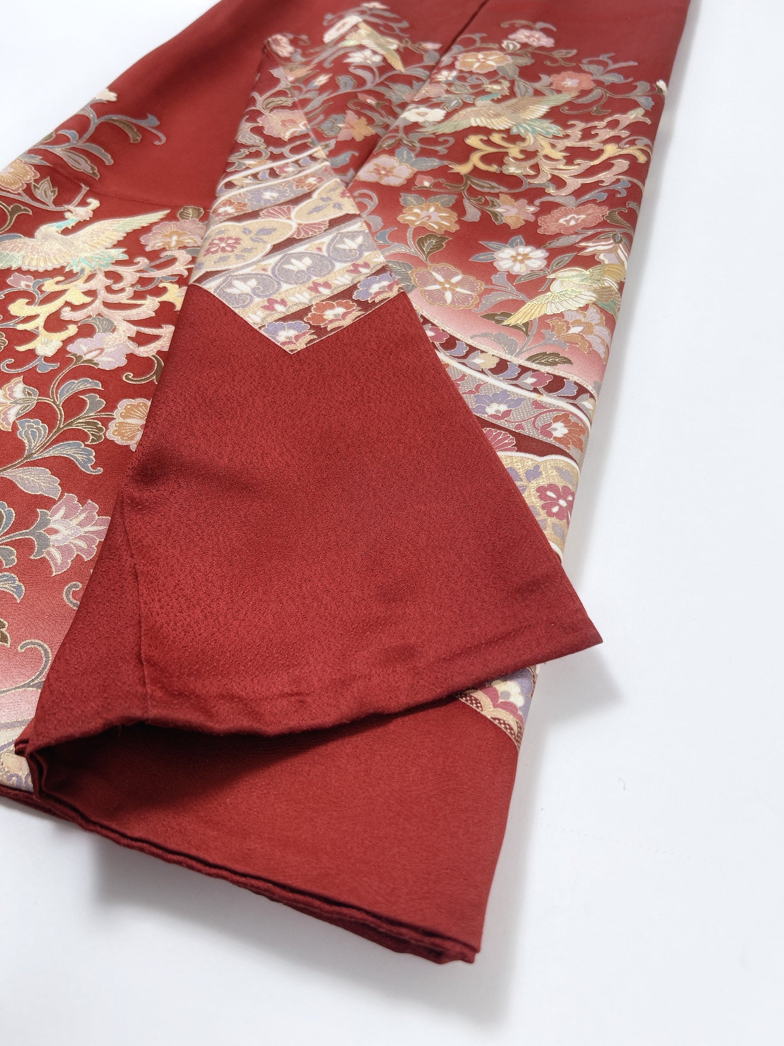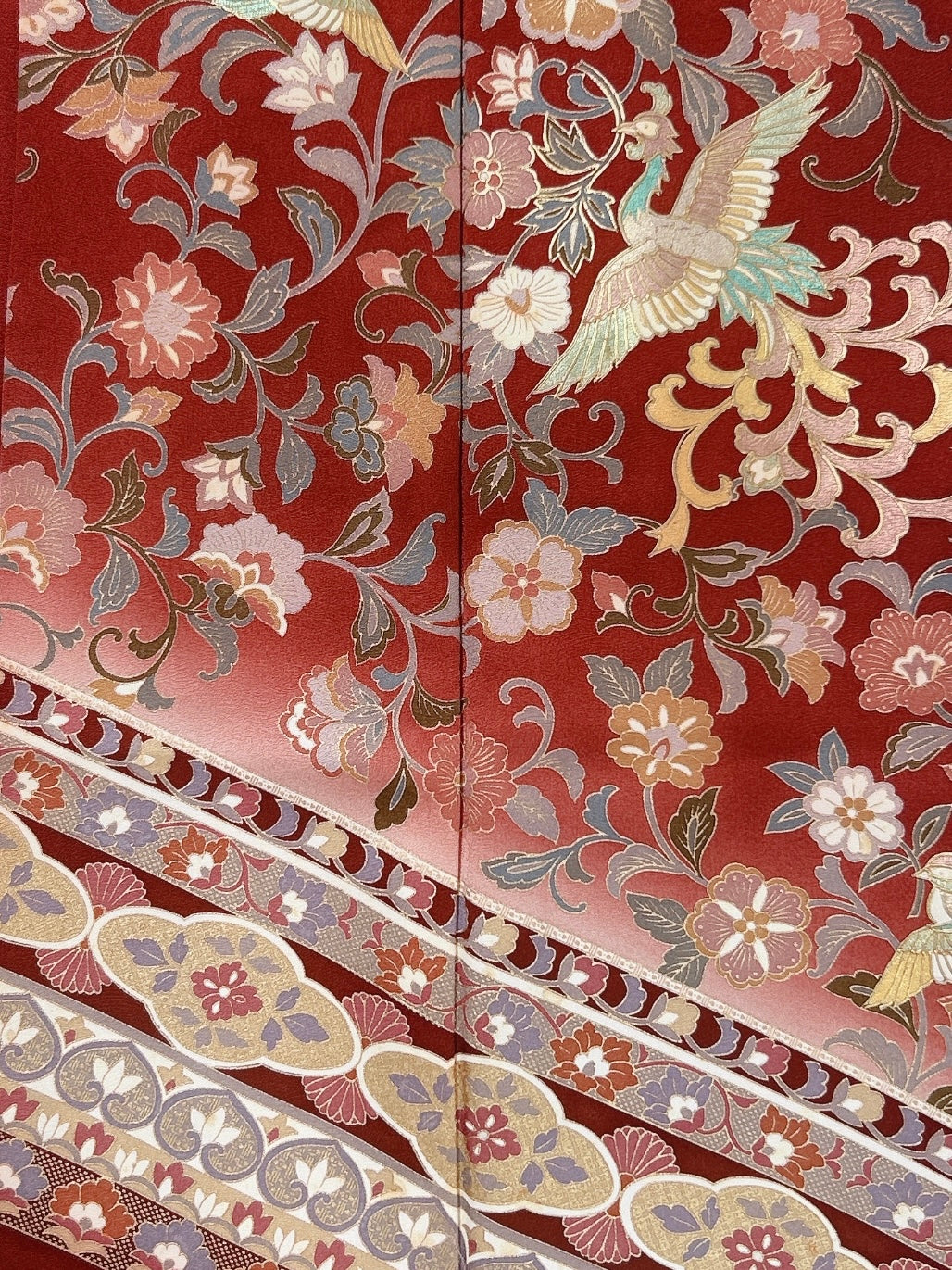 訪問着や付け下げは箔加工や刺繍、模様絵付けが特殊です。また胴裏、八掛がついておりますため水洗い厳禁。水に濡れると色移りする可能性がございます。お手入れはドライクリーニングにてお願い申し上げます。