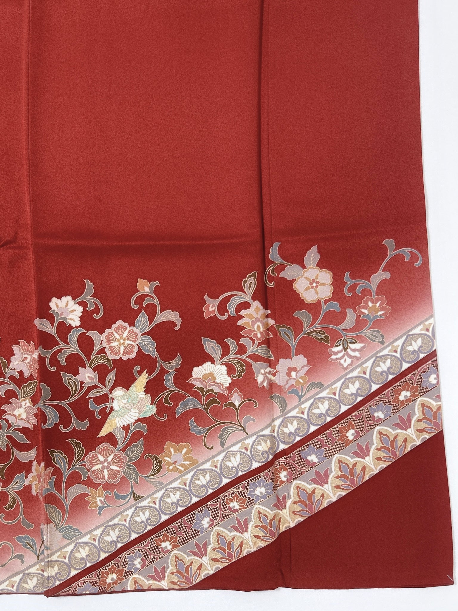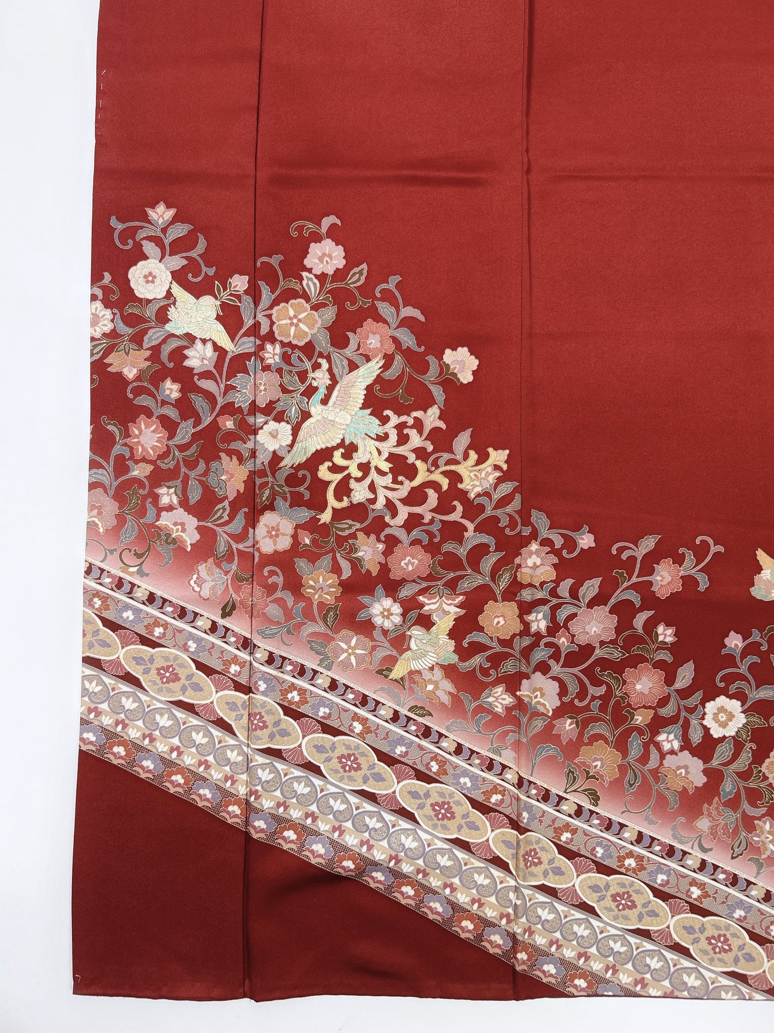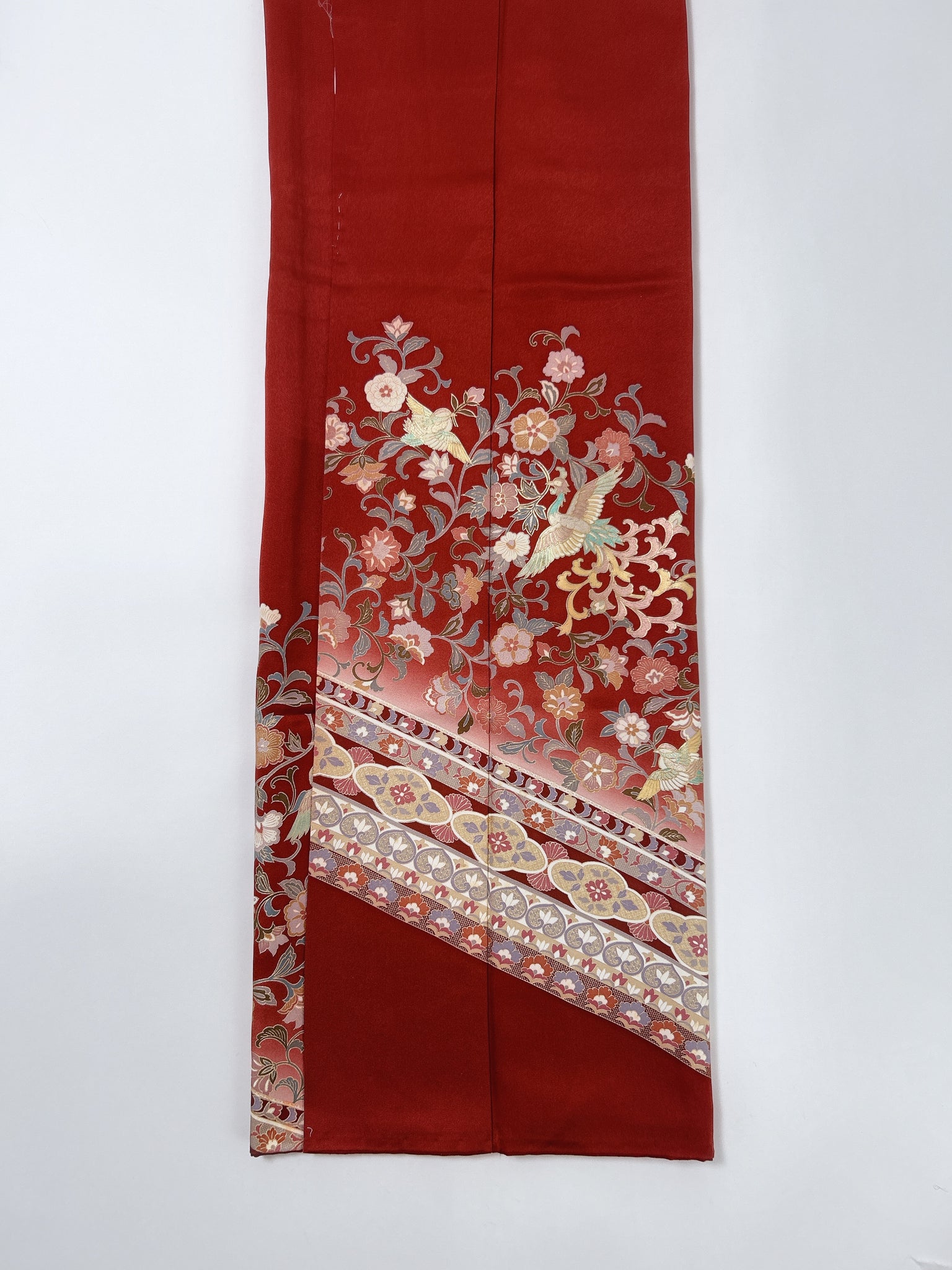 訪問着や付け下げは箔加工や刺繍、模様絵付けが特殊です。また胴裏、八掛がついておりますため水洗い厳禁。水に濡れると色移りする可能性がございます。お手入れはドライクリーニングにてお願い申し上げます。