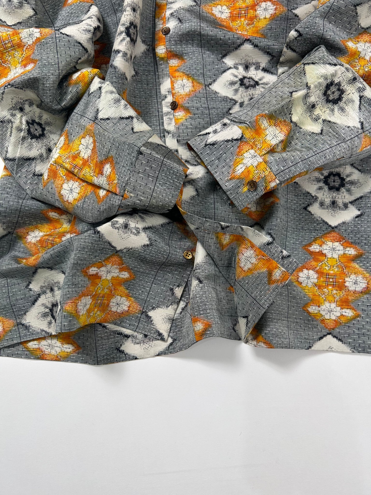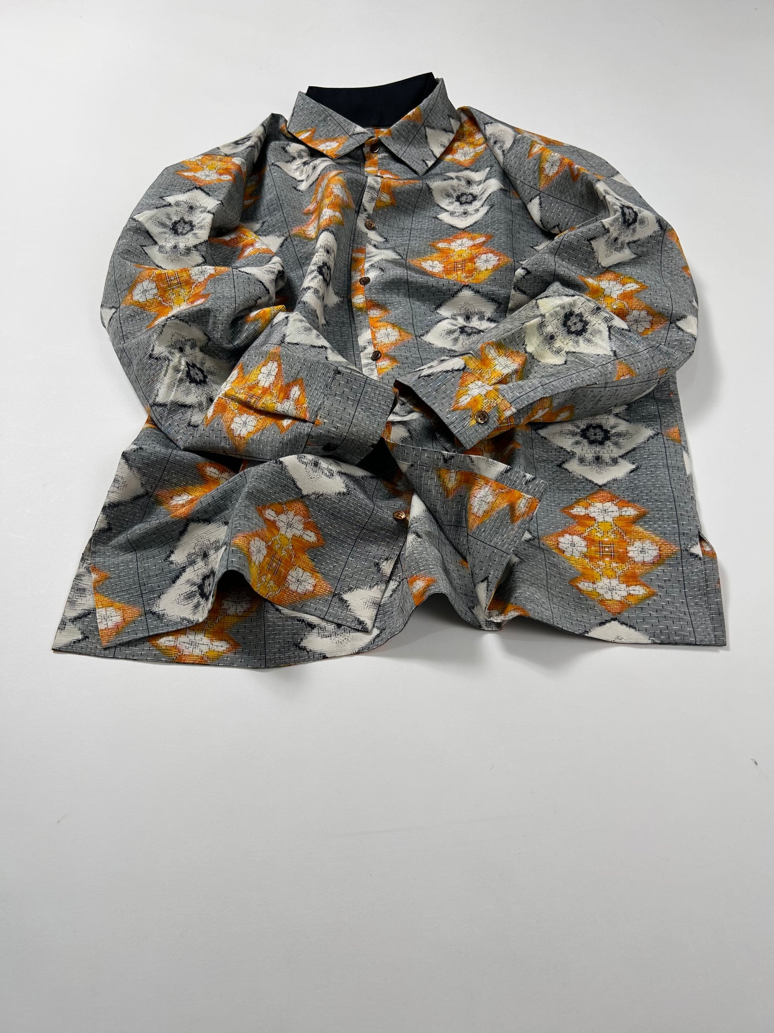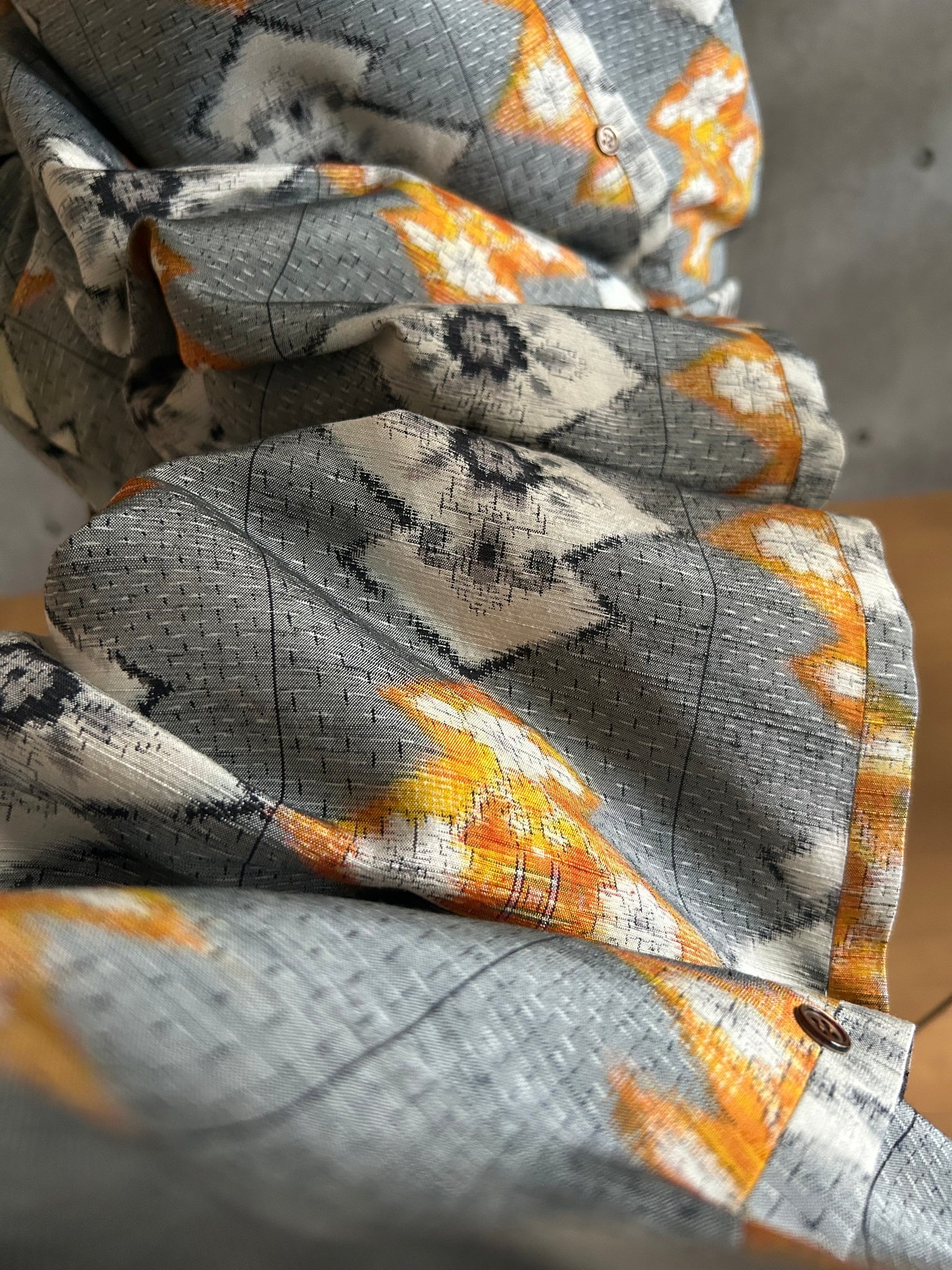 これまでと変わらず、ケニシャツは一反(約12メートル)のお着物生地を余すことなく使用し、総裏仕立ての二枚合わせにてお作りしております。そのため、程よい厚みと重みがあり、お着物一反から一点のみお作りできる、貴重なお品です。
