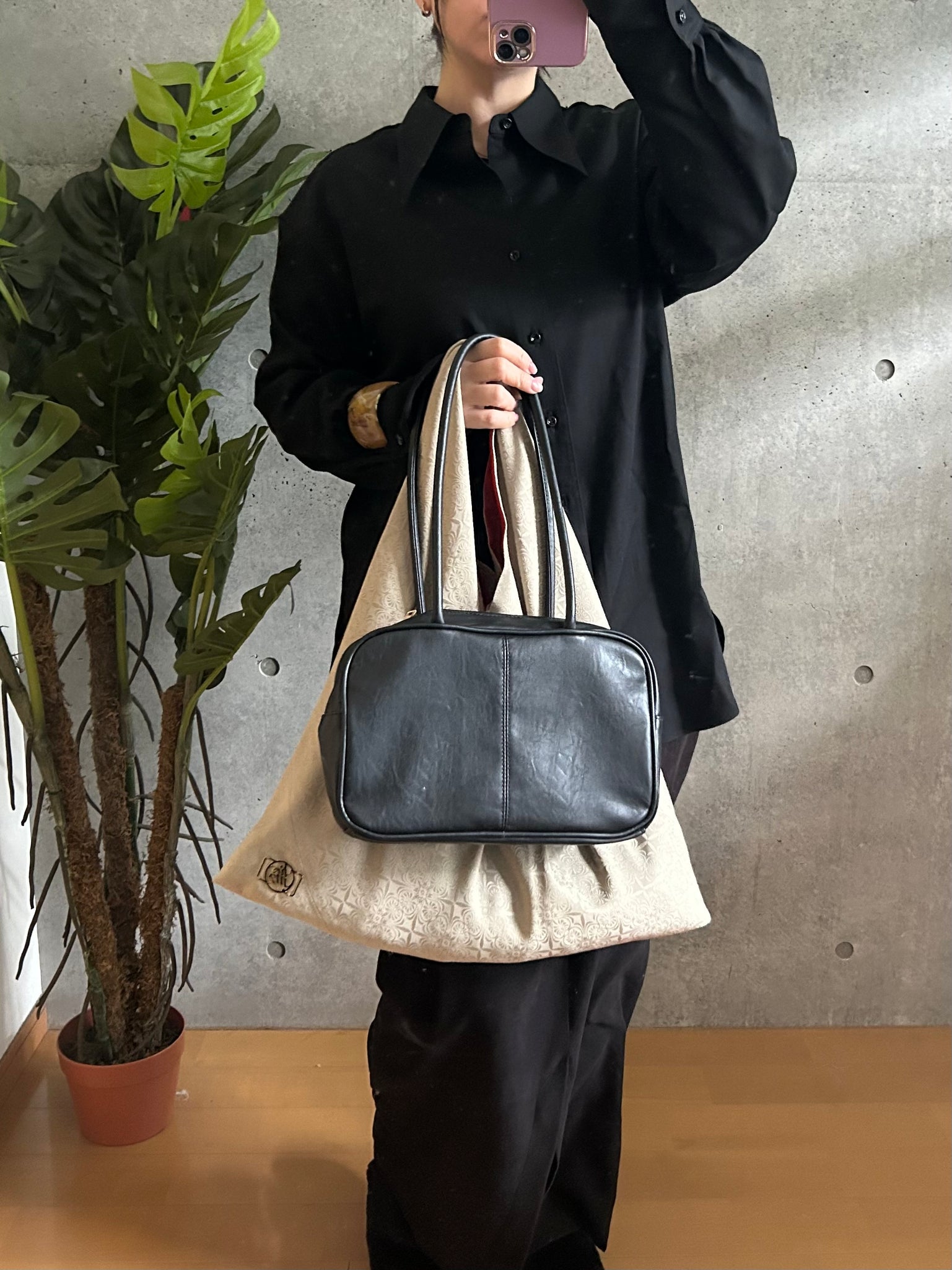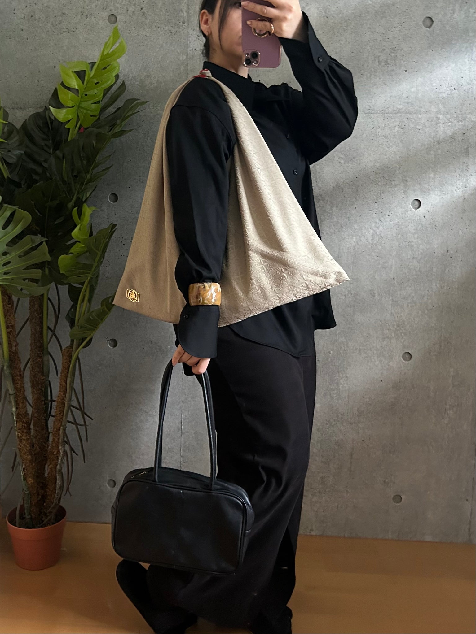 ・手持ちの角がシワになりましたらアイロンで綺麗にお戻しができます。必ず当て布をして裏地のポリエステルの面からアイロンをあててください。