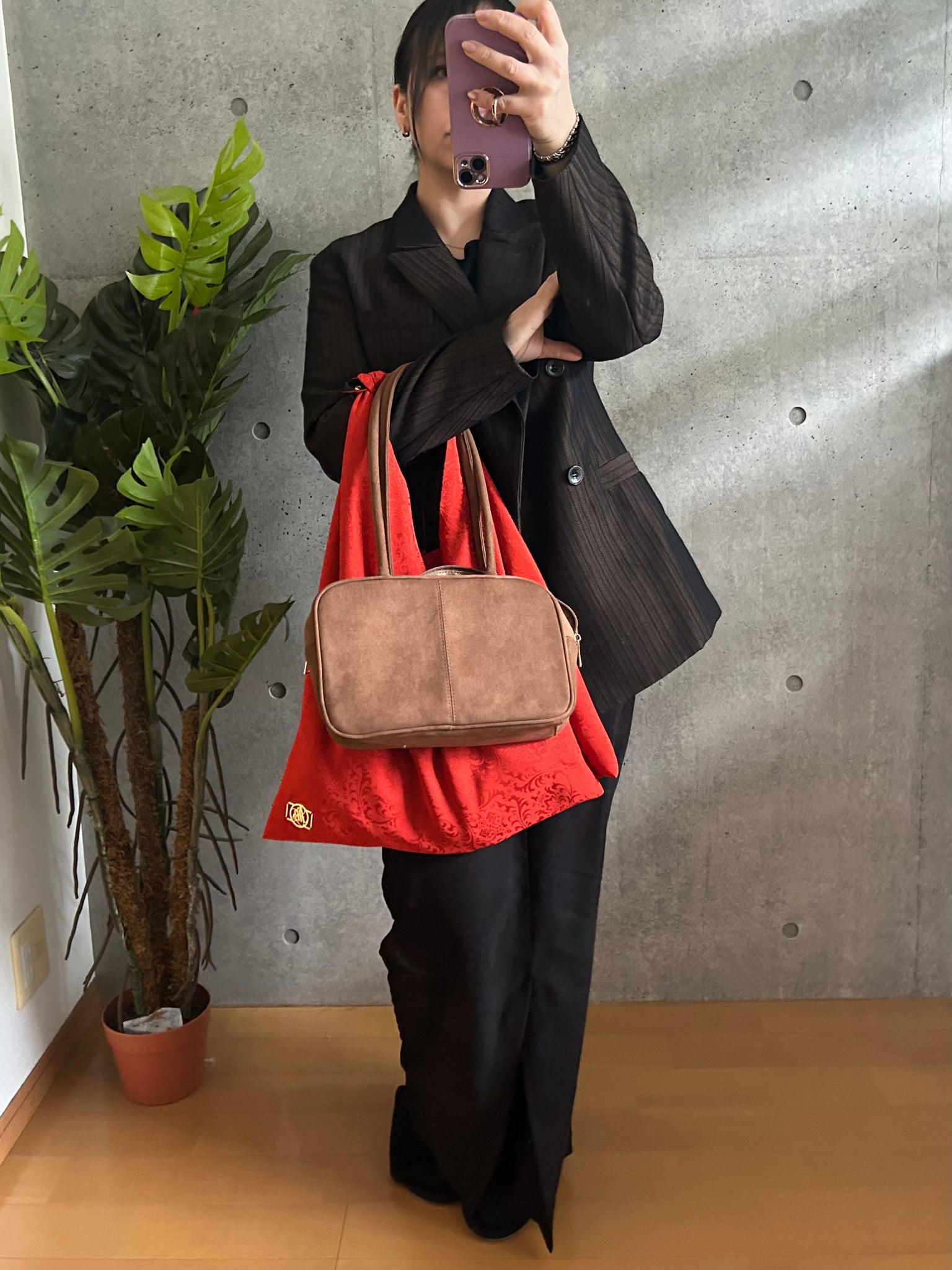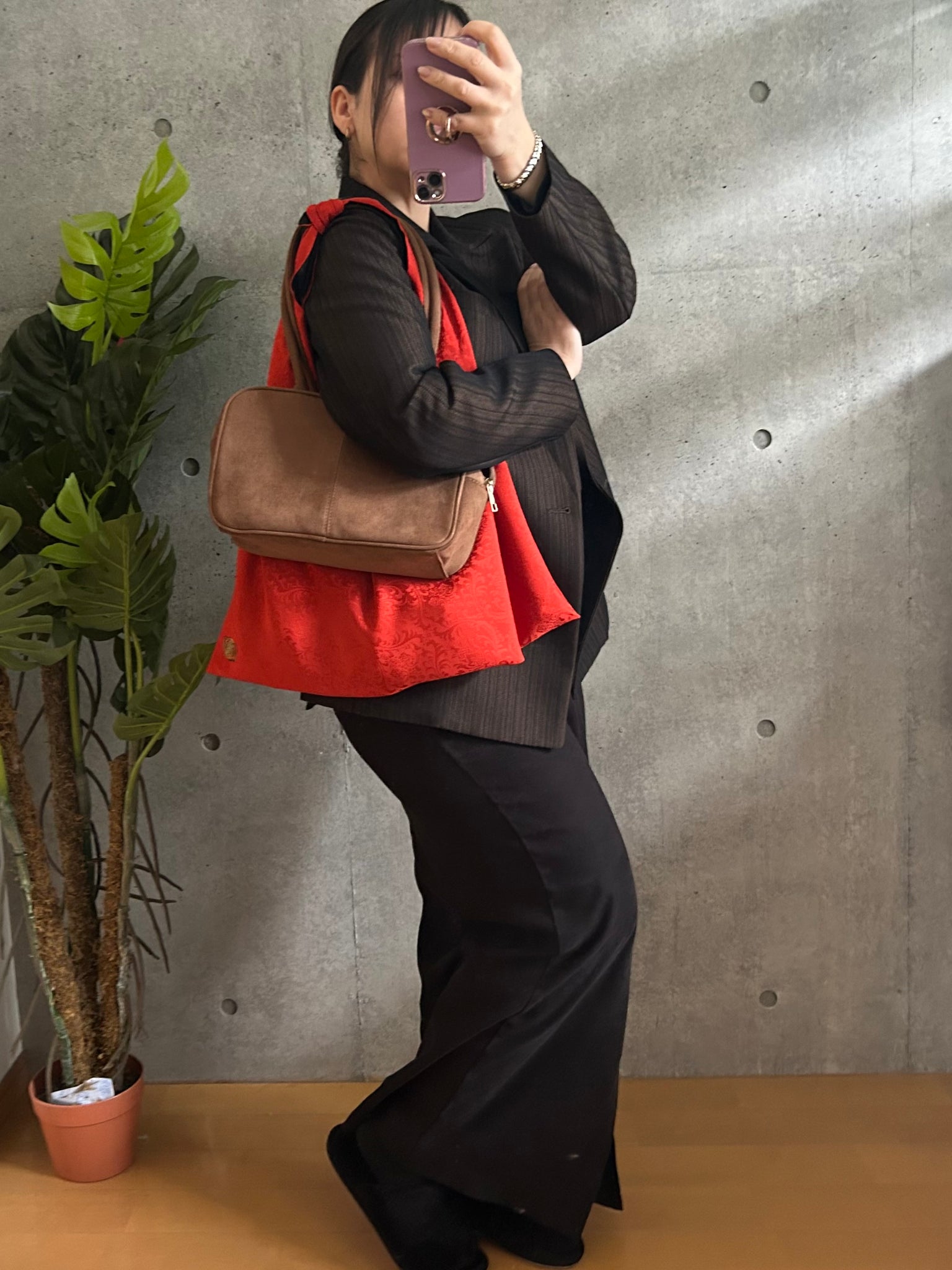 ・手持ちの角がシワになりましたらアイロンで綺麗にお戻しができます。必ず当て布をして裏地のポリエステルの面からアイロンをあててください。