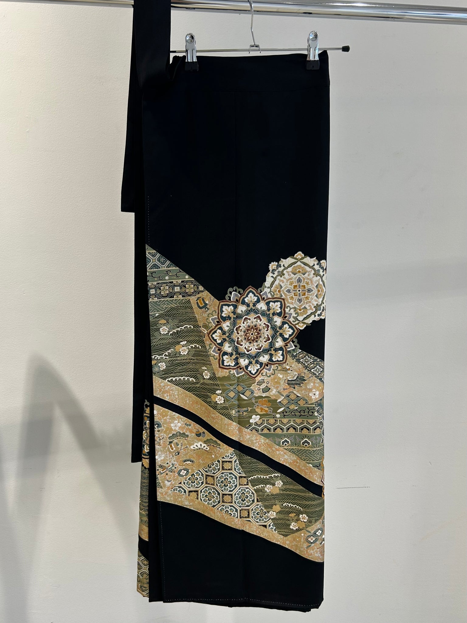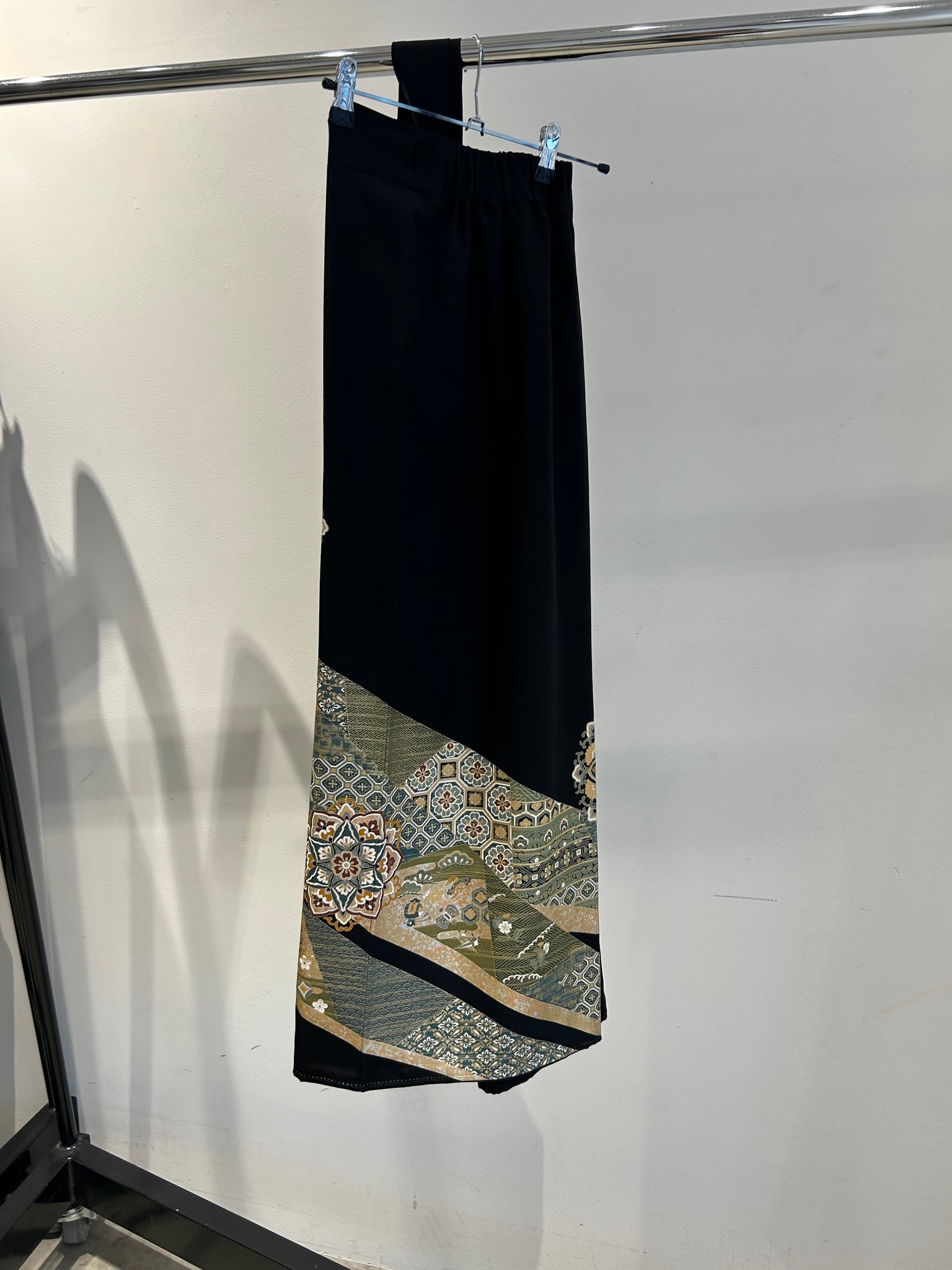 シュッケニは、巻きスカート仕様。からだに馴染むシルエットで着物を着る時と同じ手順で身体に巻きつけていただくと、正面からも横からも後ろ姿までも、まるで一枚の着物を纏ったかのような佇まいに仕上がります。