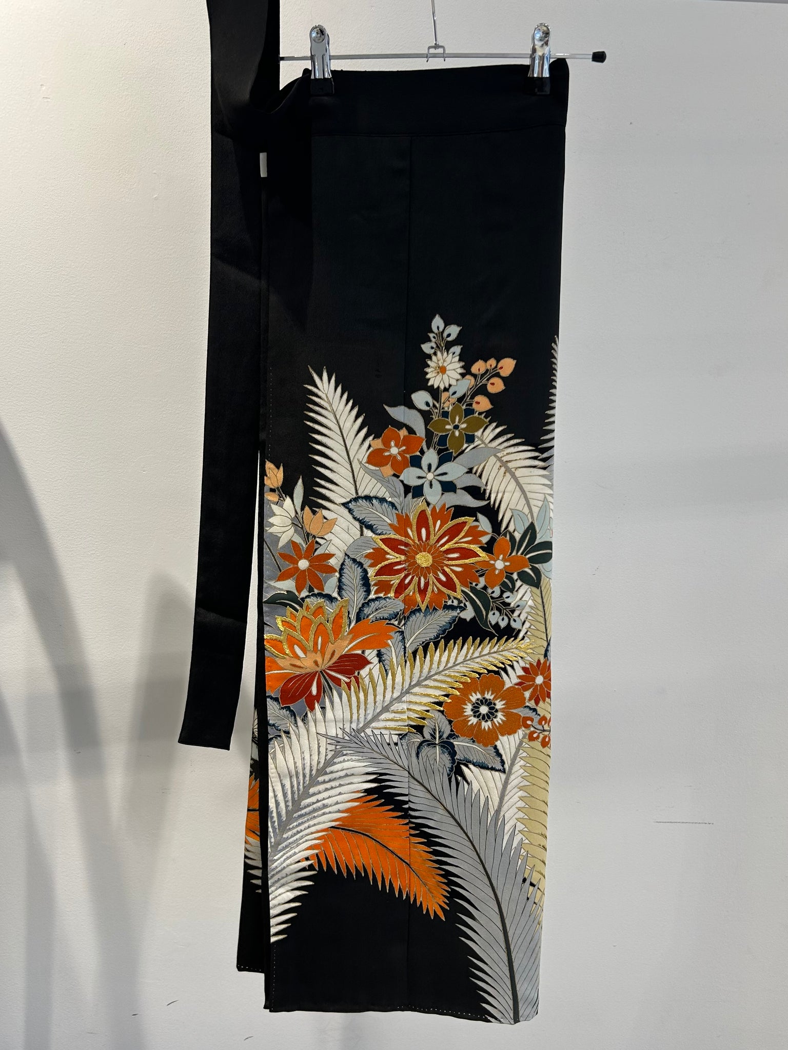 シュッケニは、巻きスカート仕様。からだに馴染むシルエットで着物を着る時と同じ手順で身体に巻きつけていただくと、正面からも横からも後ろ姿までも、まるで一枚の着物を纏ったかのような佇まいに仕上がります。
