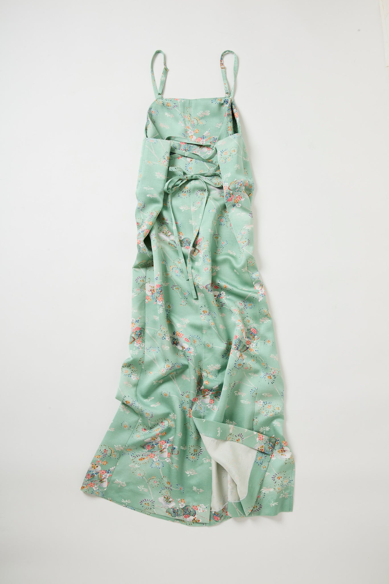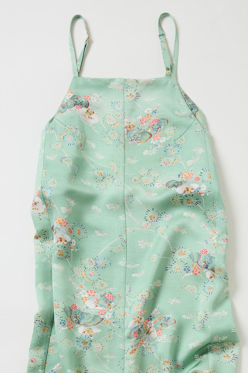 背中に脇下からウエストまで紐があり、胸回りウエストはご自身のサイズに調整ができます。ゆったり着ることもぴったり着ることも可能で、ひもは取り外し可能ですインナーに長袖を着たり、ニットをあわせたり一年中お召いただけ、反物の素材が全面に生きるようにシンプルなワンピースをおつくりしました。