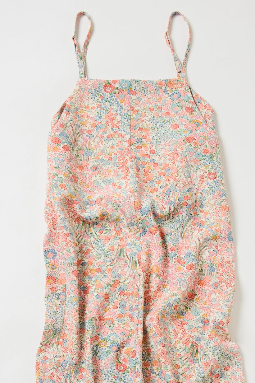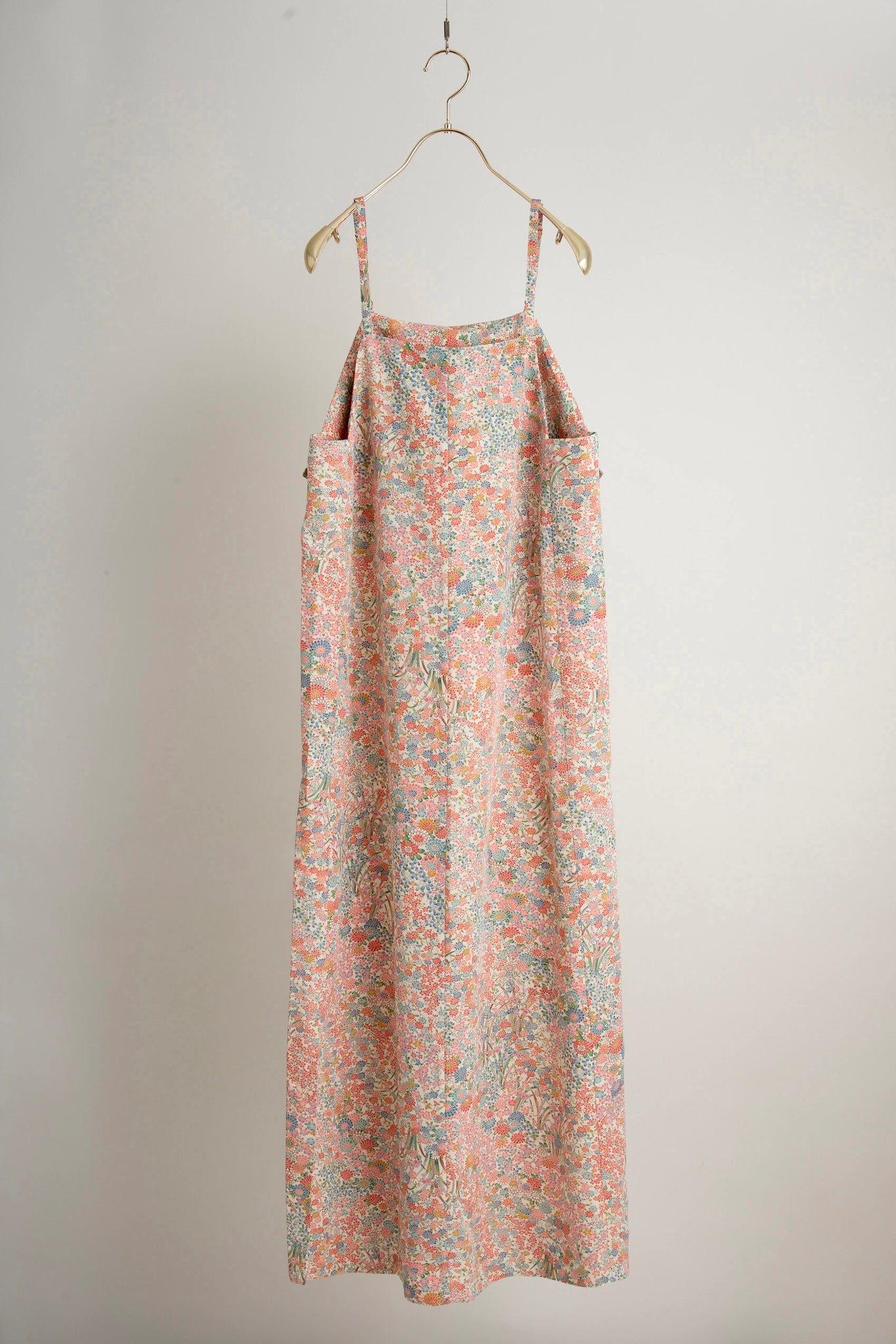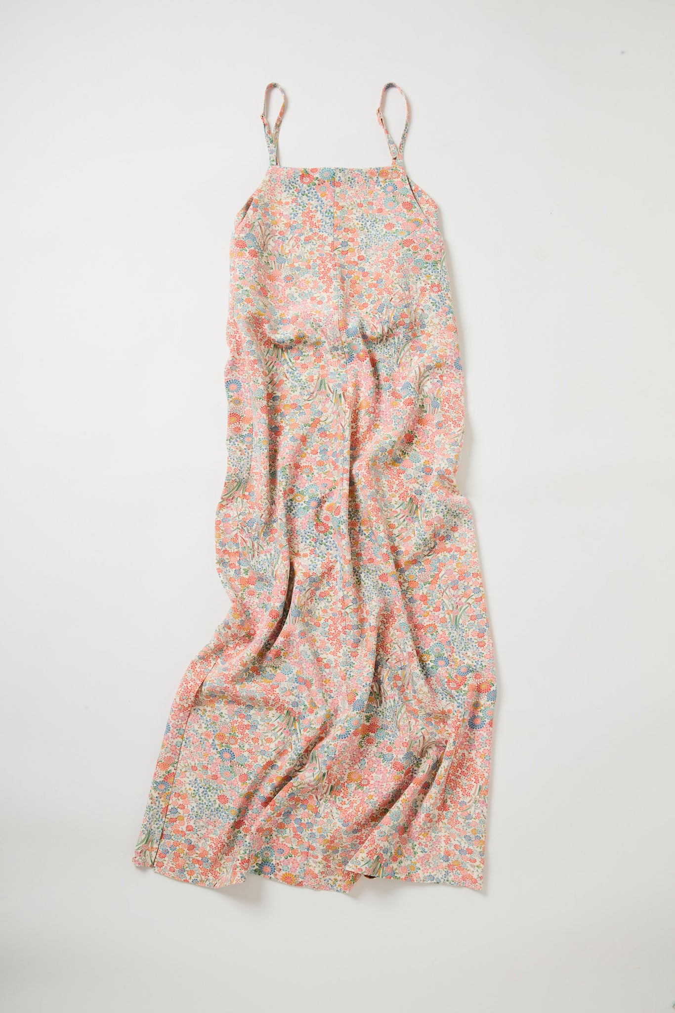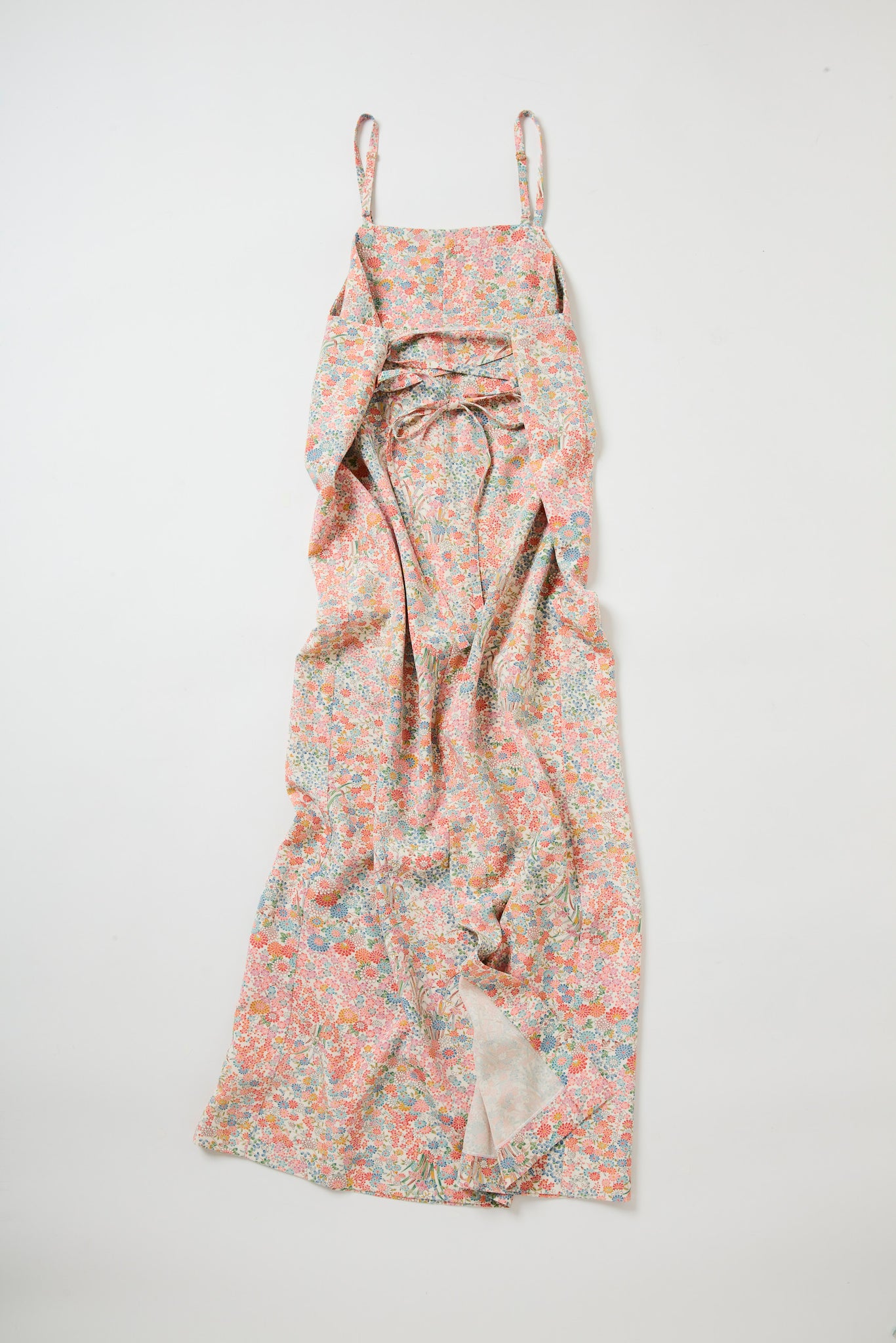 背中に脇下からウエストまで紐があり、胸回りウエストはご自身のサイズに調整ができます。ゆったり着ることもぴったり着ることも可能で、ひもは取り外し可能ですインナーに長袖を着たり、ニットをあわせたり一年中お召いただけ、反物の素材が全面に生きるようにシンプルなワンピースをおつくりしました。