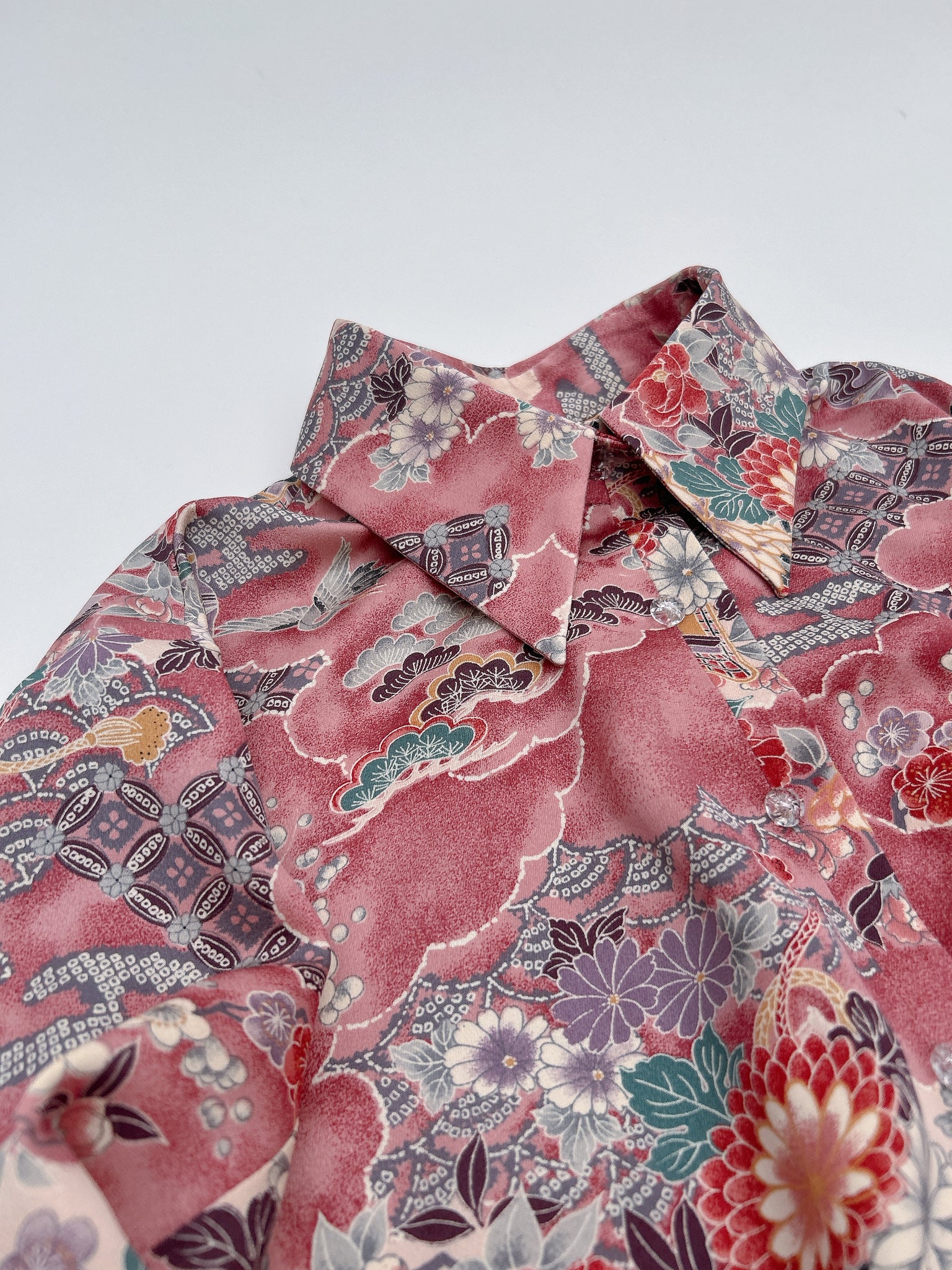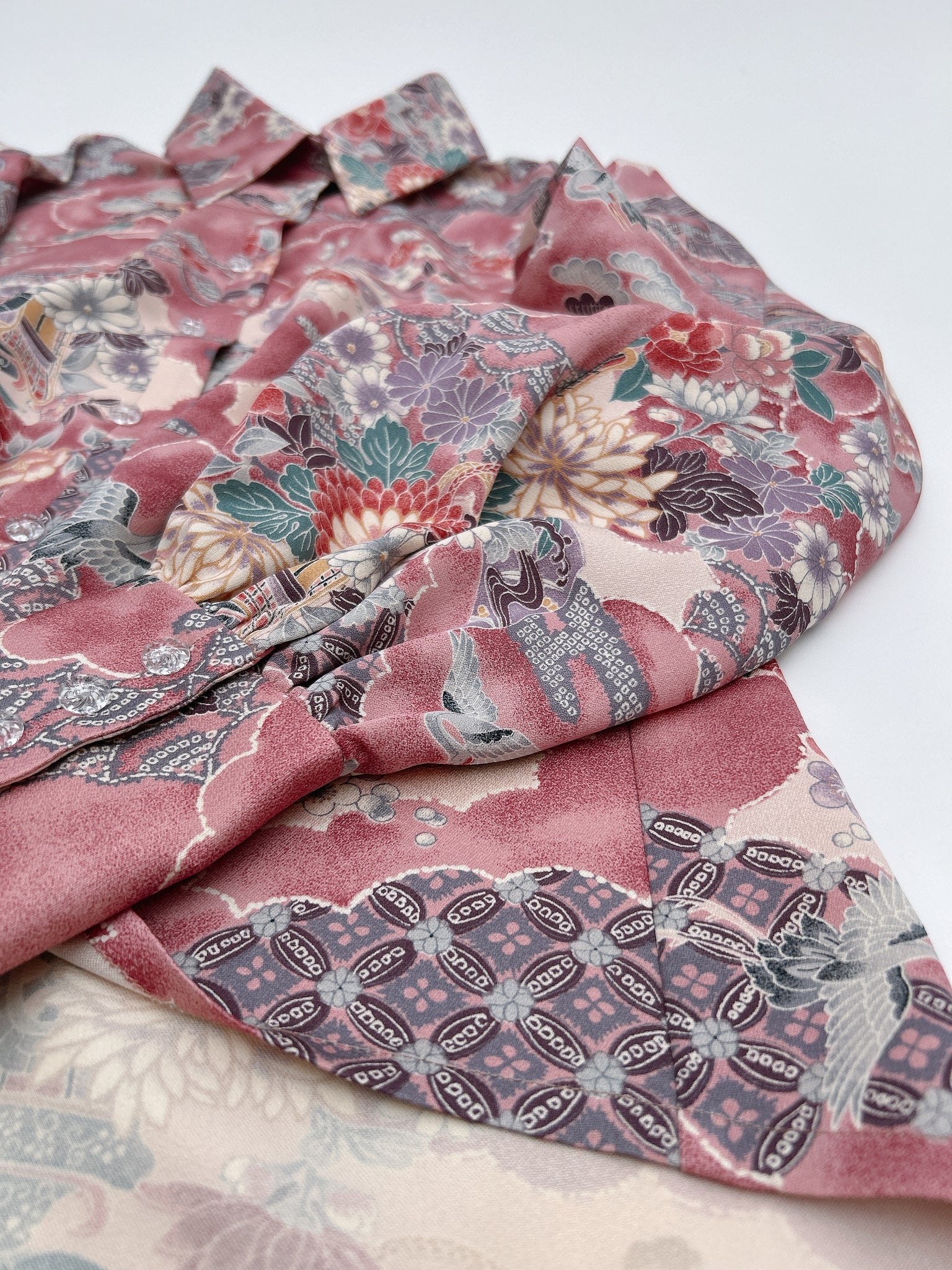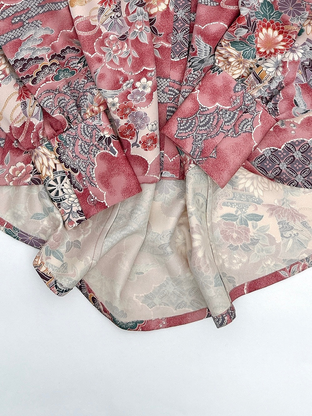 ⁑着物はシミや汚れ破れなどがつきもう着物としては着ることが難しくなったものや、ヴィンテージ、現代着物まで幅広く使用しておりますのでなるべくシミ汚れは逃がして仕立てております。が場合によっては少々アク、シミが付いてるものもございます。古いお着物の時代と時間の経過で現れるものですご理解のほどよろしくお願いもうしあげます。また正絹、化繊共に「防縮加工」をほどこしておりますのでご自宅でのお手入れが可能ですが、同じ色味艶状態を長く保たせるにはドライクリーニングがおすすめです。
