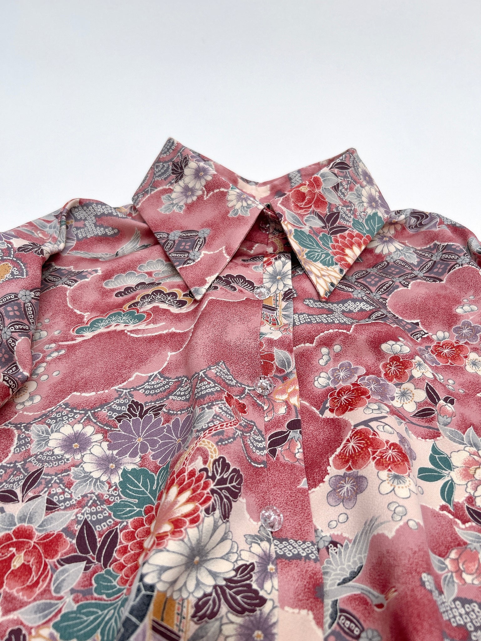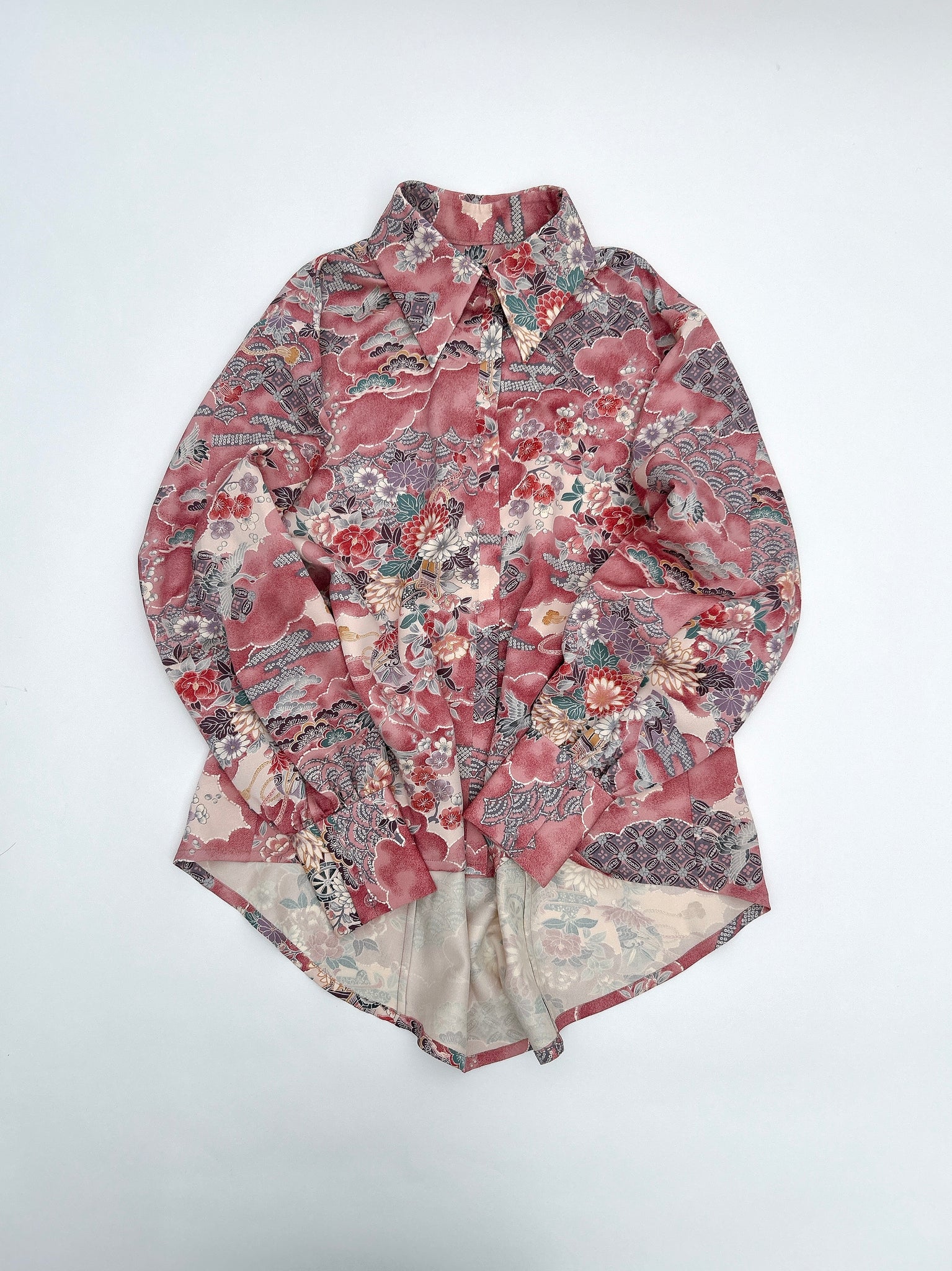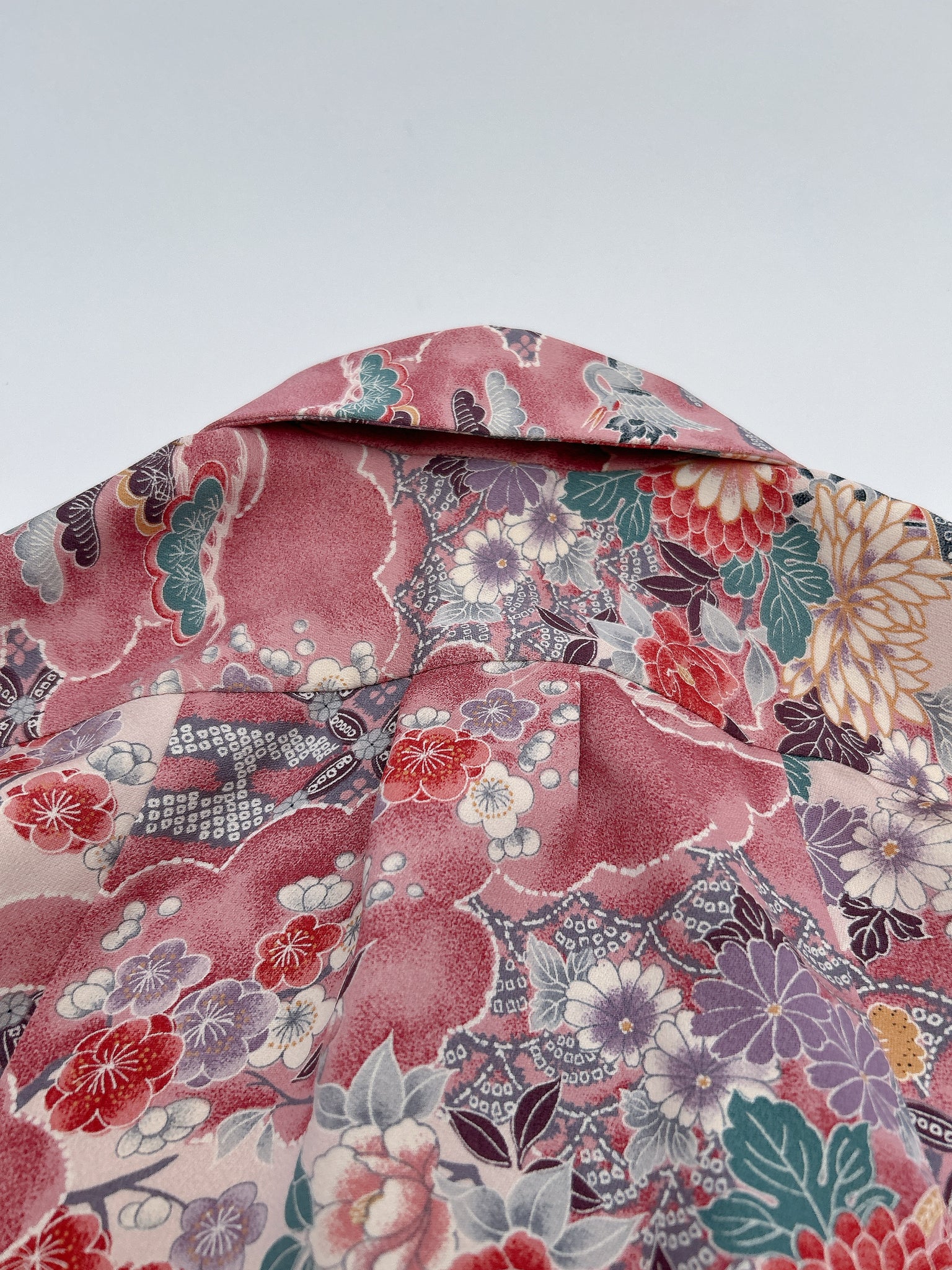 襟元は、おきもののえりの形を再現しカーブがかかった抜き襟の形になっております、羽織ったあと抜き具合をご自身で調整可能、袖はカフス四つ釦でギャザーを寄せた少しボリュームのあるデザイン、裾は前後で長さが違うので前開いて羽織ってもシルエットが重たくなりません。女性らしいシルエットに仕上がりました。