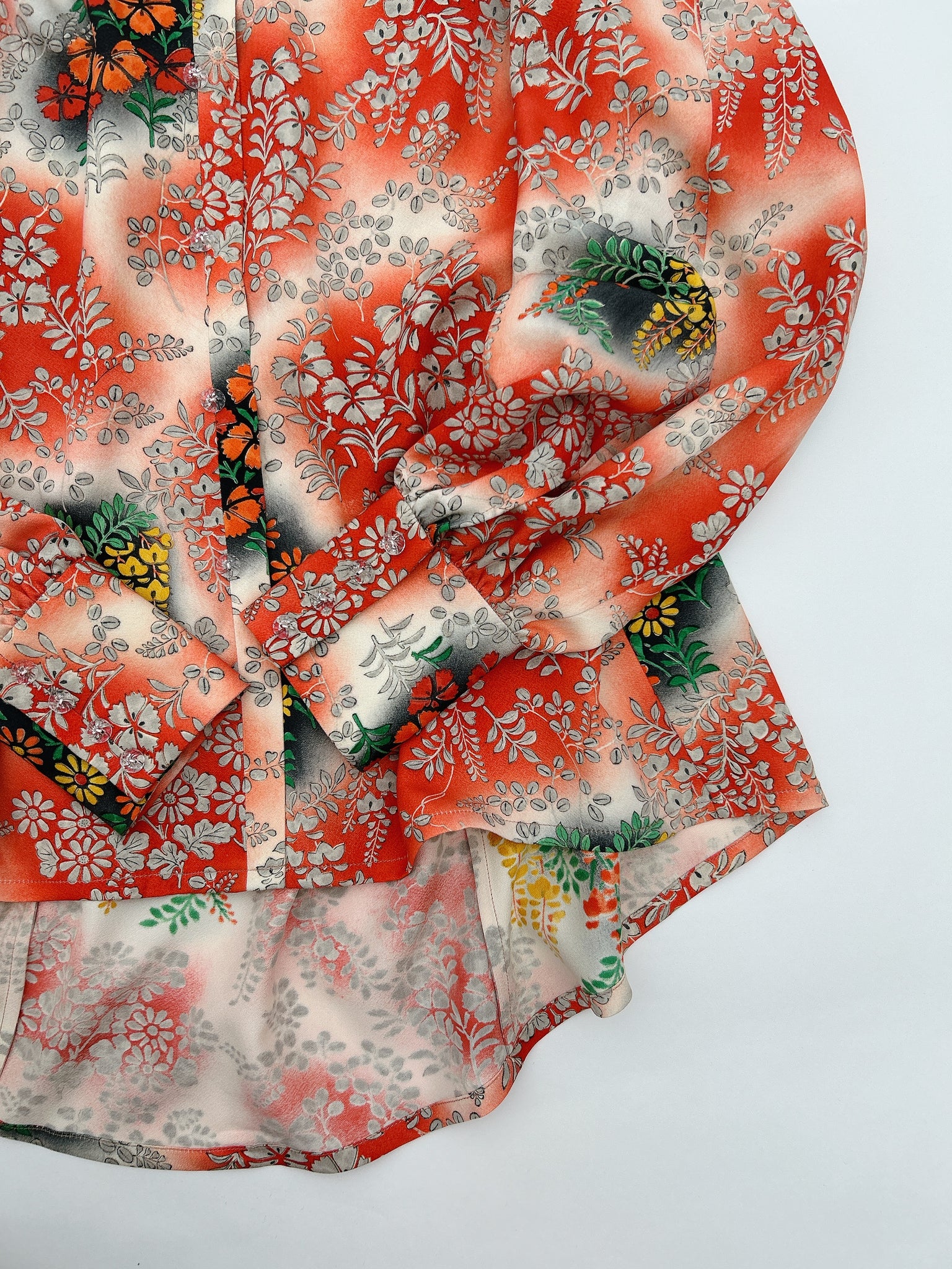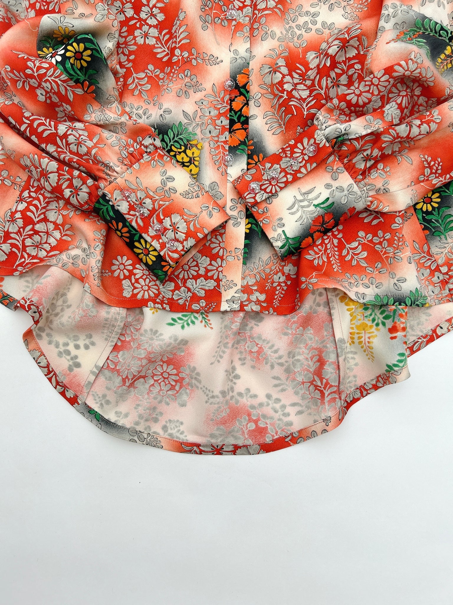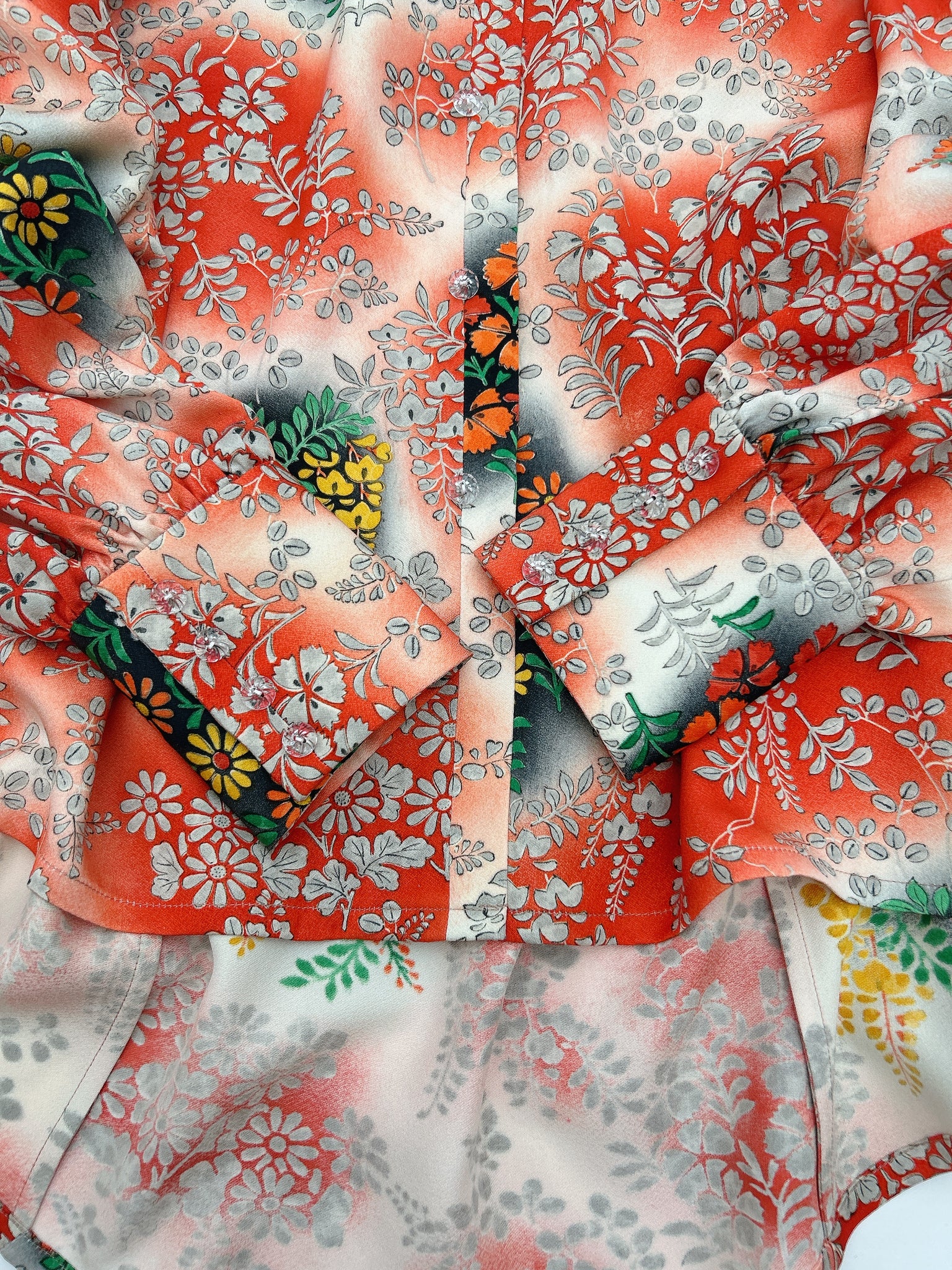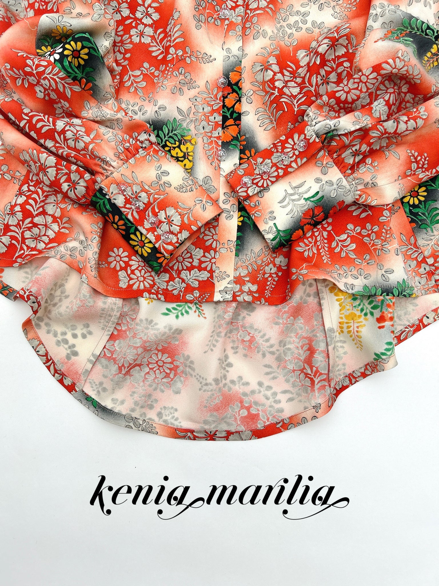 ⁑着物はシミや汚れ破れなどがつきもう着物としては着ることが難しくなったものや、ヴィンテージ、現代着物まで幅広く使用しておりますのでなるべくシミ汚れは逃がして仕立てております。が場合によっては少々アク、シミが付いてるものもございます。古いお着物の時代と時間の経過で現れるものですご理解のほどよろしくお願いもうしあげます。また正絹、化繊共に「防縮加工」をほどこしておりますのでご自宅でのお手入れが可能ですが、同じ色味艶状態を長く保たせるにはドライクリーニングがおすすめです。