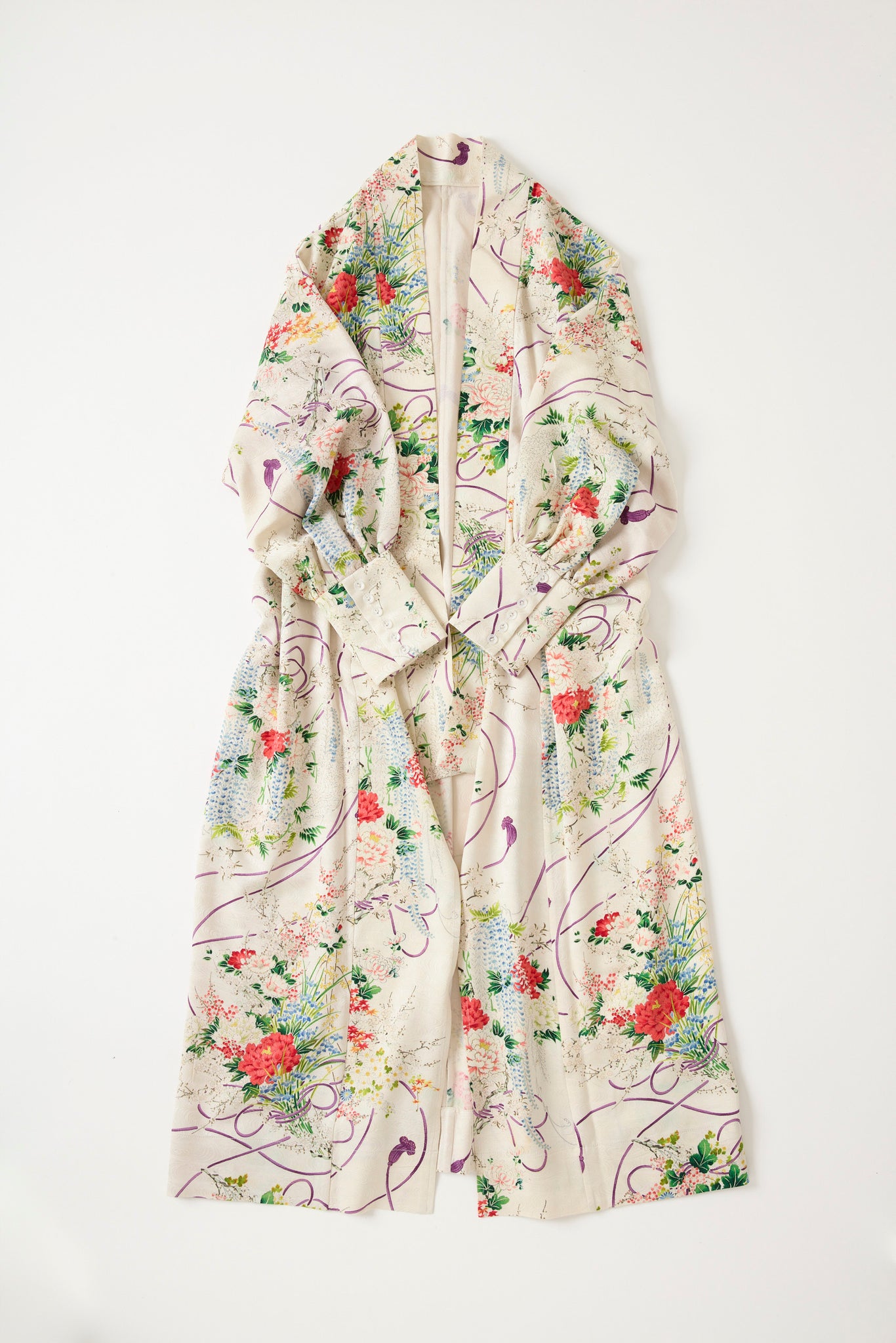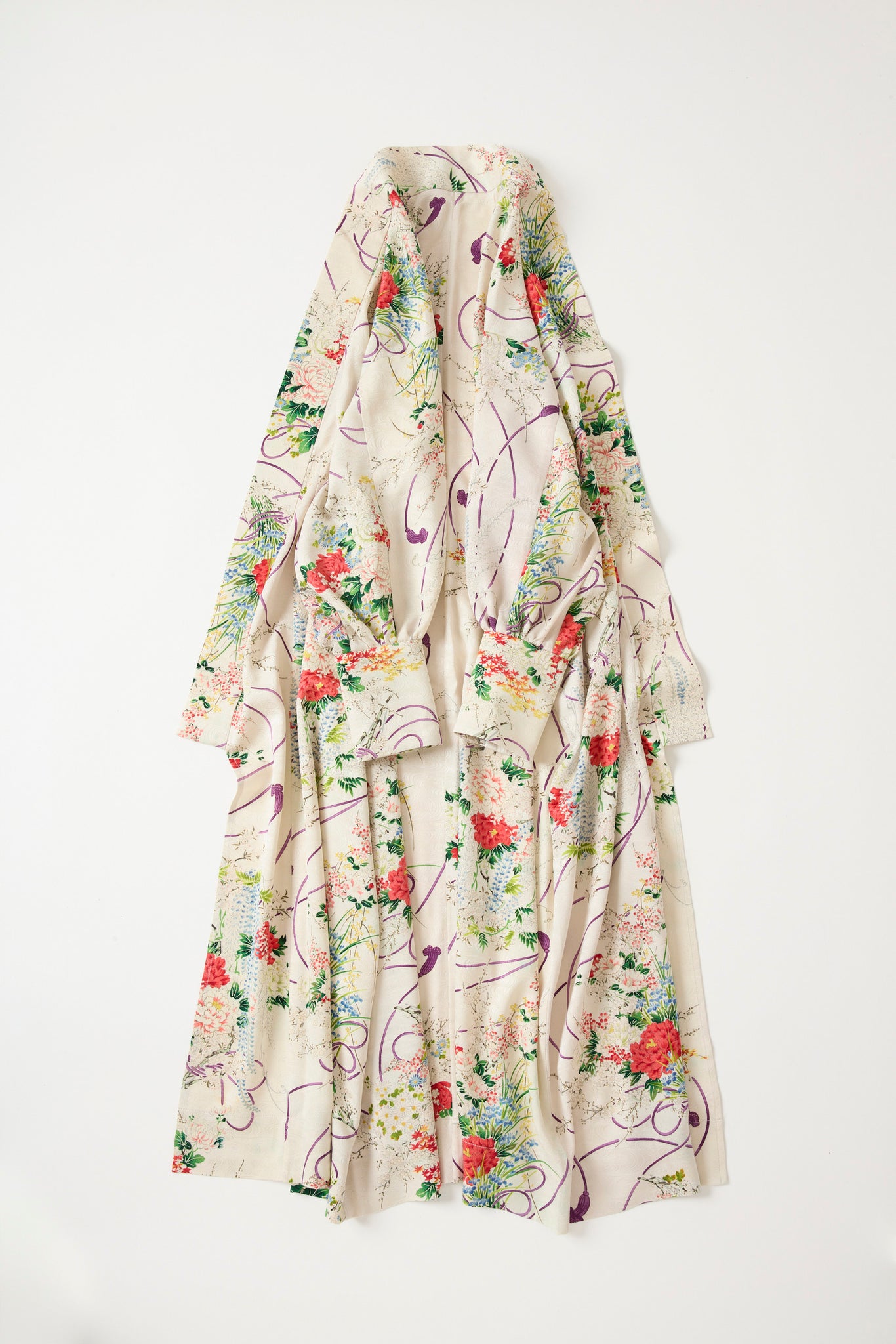 反物を極限まで活かすため3枚袖構造で立体的に。スリットがないためお着物に近いゆらめきが生まれます。