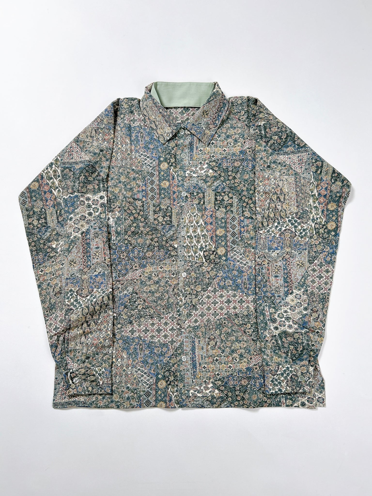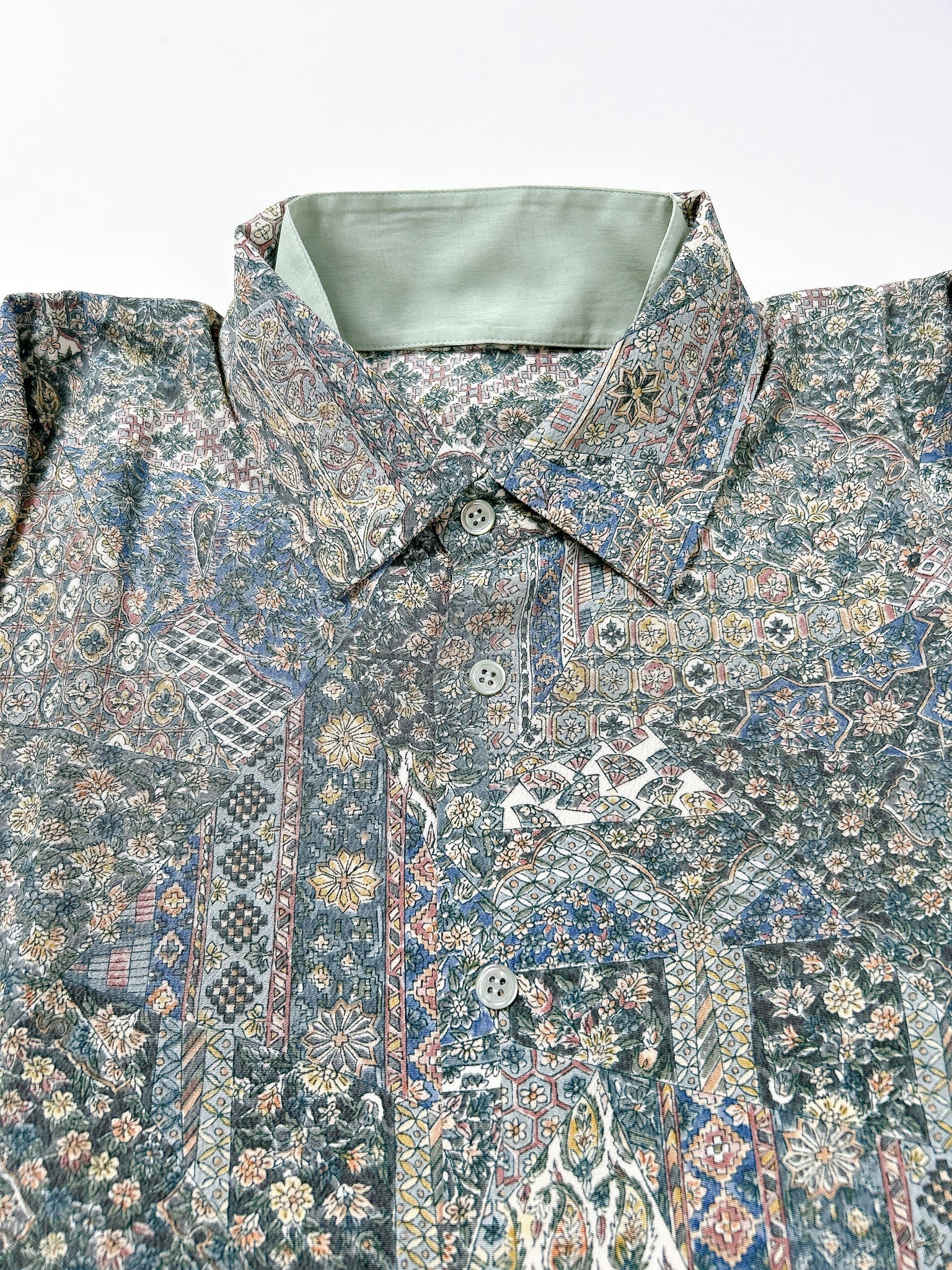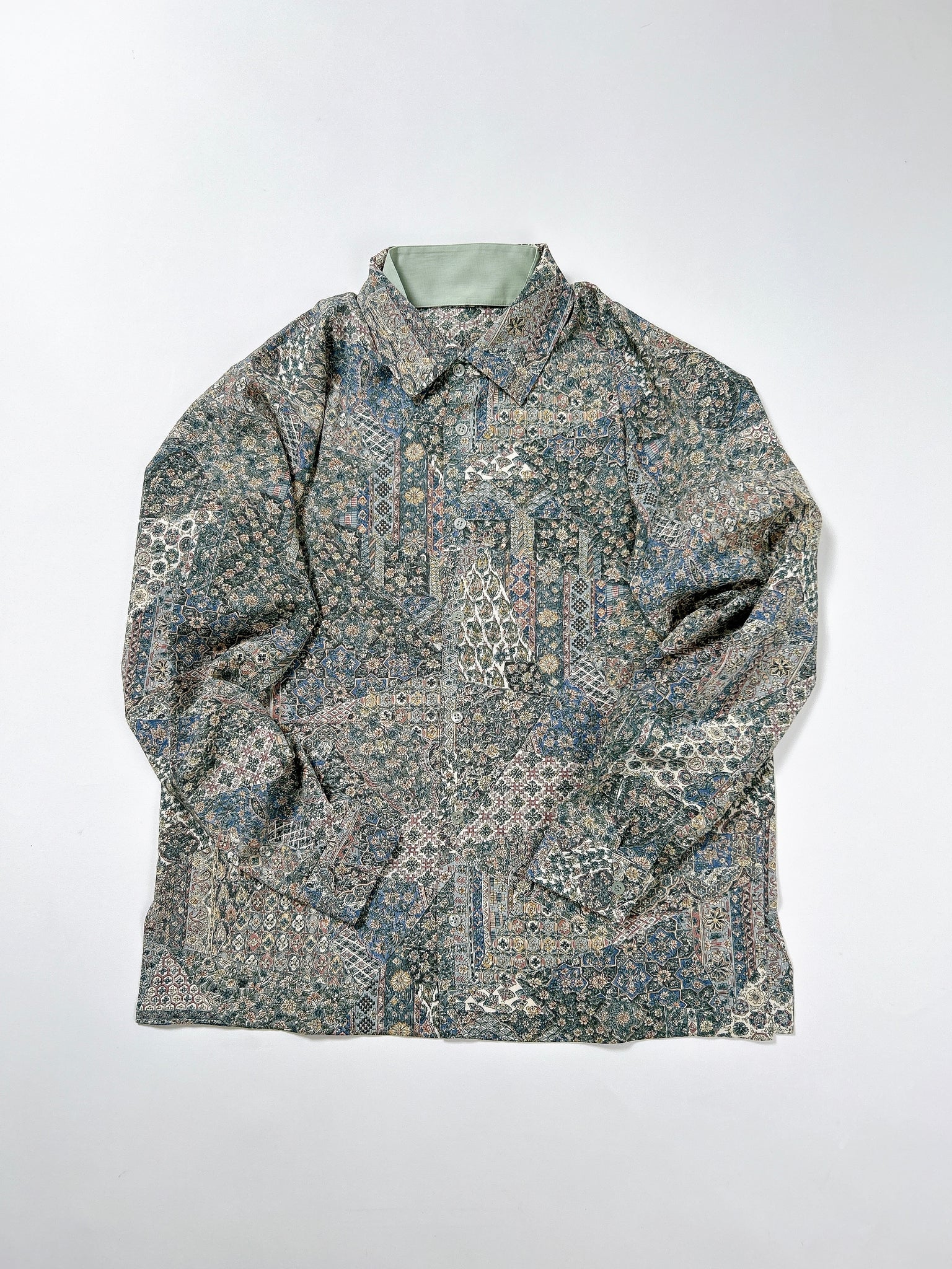 今季は、和裁の縫製仕様を踏襲するだけでなく、より「きものを纏う感覚」に近づけるために、シャツとしての肩線やヨークを省き、首元には付け襟を施しました。これにより、首回りのカーブをお着物の襟に見立てた、独自の設計となっております。