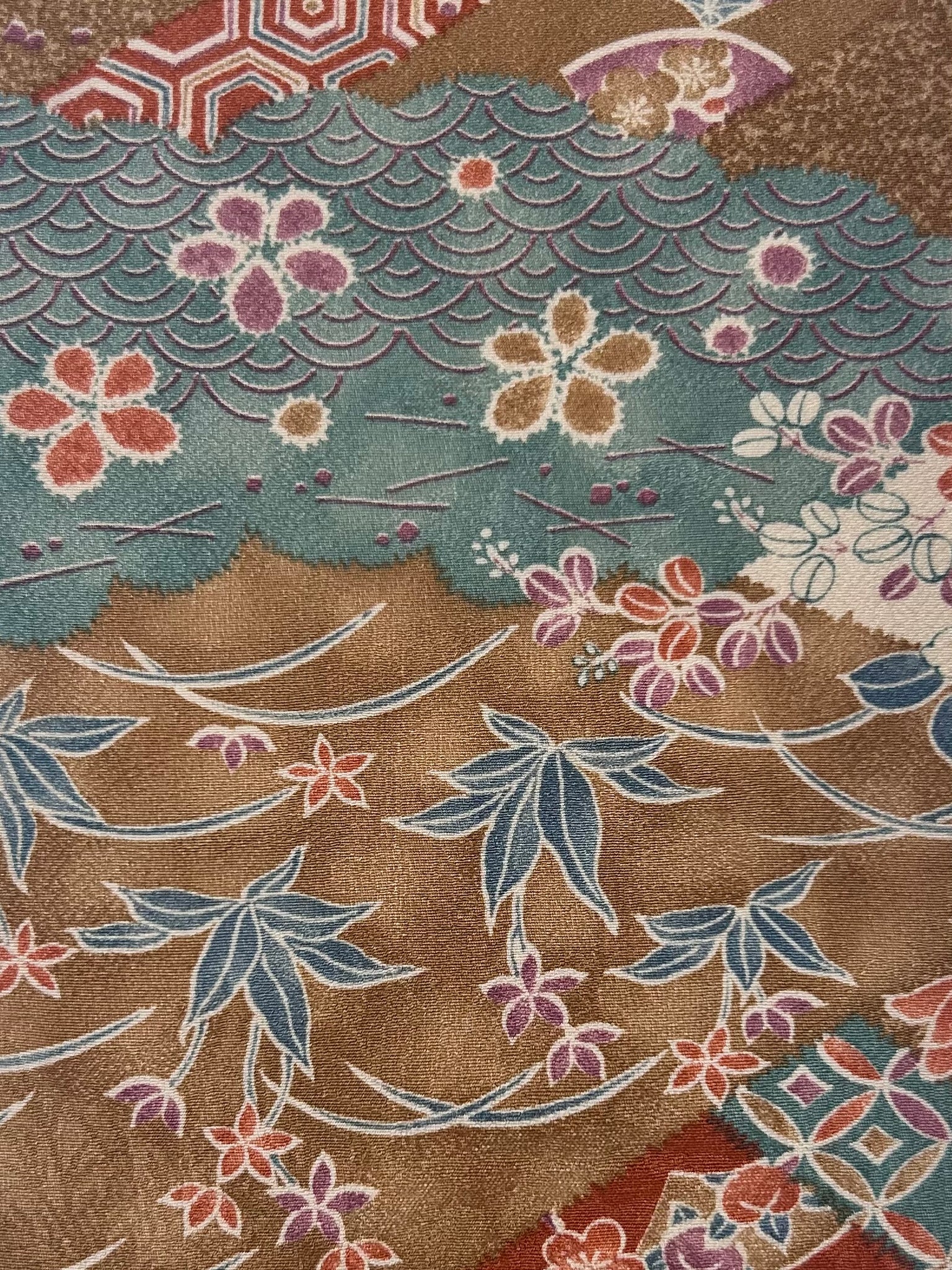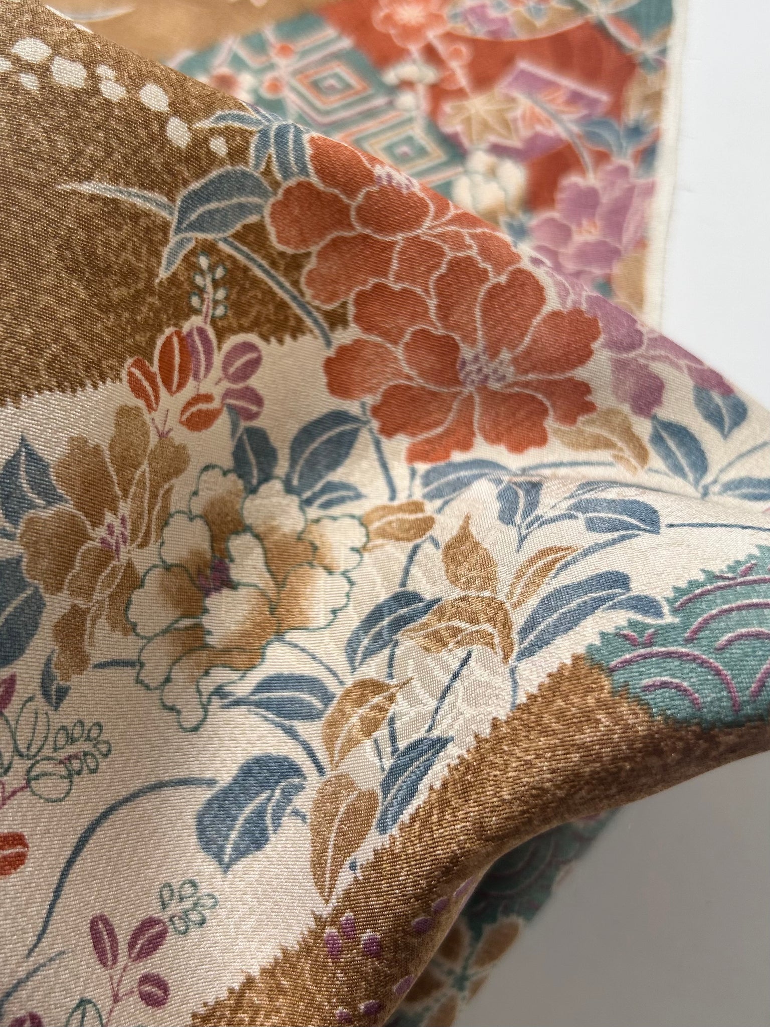 ⁑着物はシミや汚れ破れなどがつきもう着物としては着ることが難しくなったものや、ヴィンテージ、現代着物まで幅広く使用しておりますのでなるべくシミ汚れは逃がして仕立てております。が場合によっては少々アク、シミが付いてるものもございます。古いお着物の時代と時間の経過で現れるものですご理解のほどよろしくお願いもうしあげます。また正絹、化繊共に「防縮加工」をほどこしておりますのでご自宅でのお手入れが可能です。