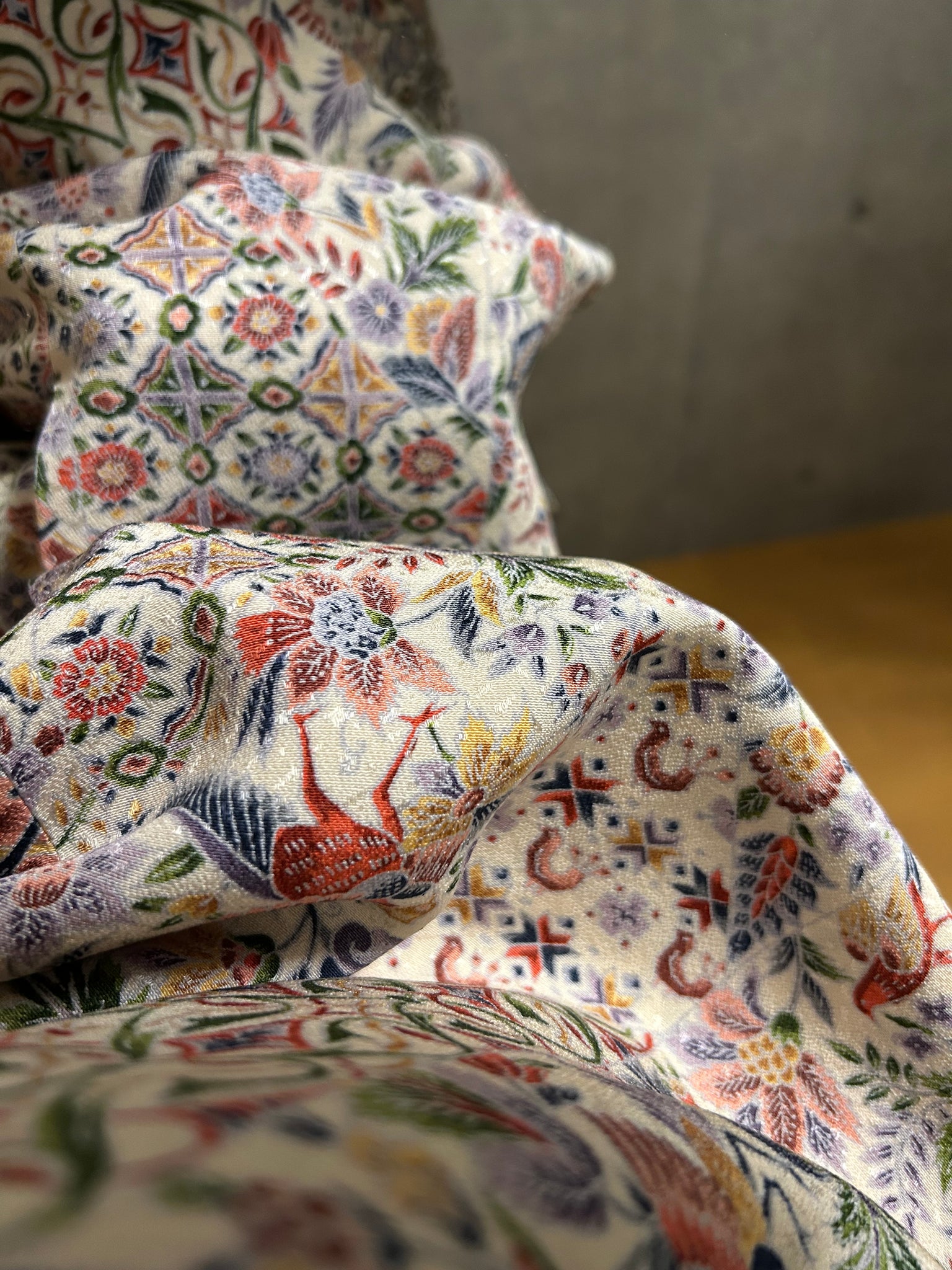 また、袖裏にはお着物の裏地として用いられる「同裏」の羽二重を、新たに織り・染め上げた絹生地で仕立てております。非常に滑らかで、腕通しの良い、心地よい着用感をお楽しみいただけます。