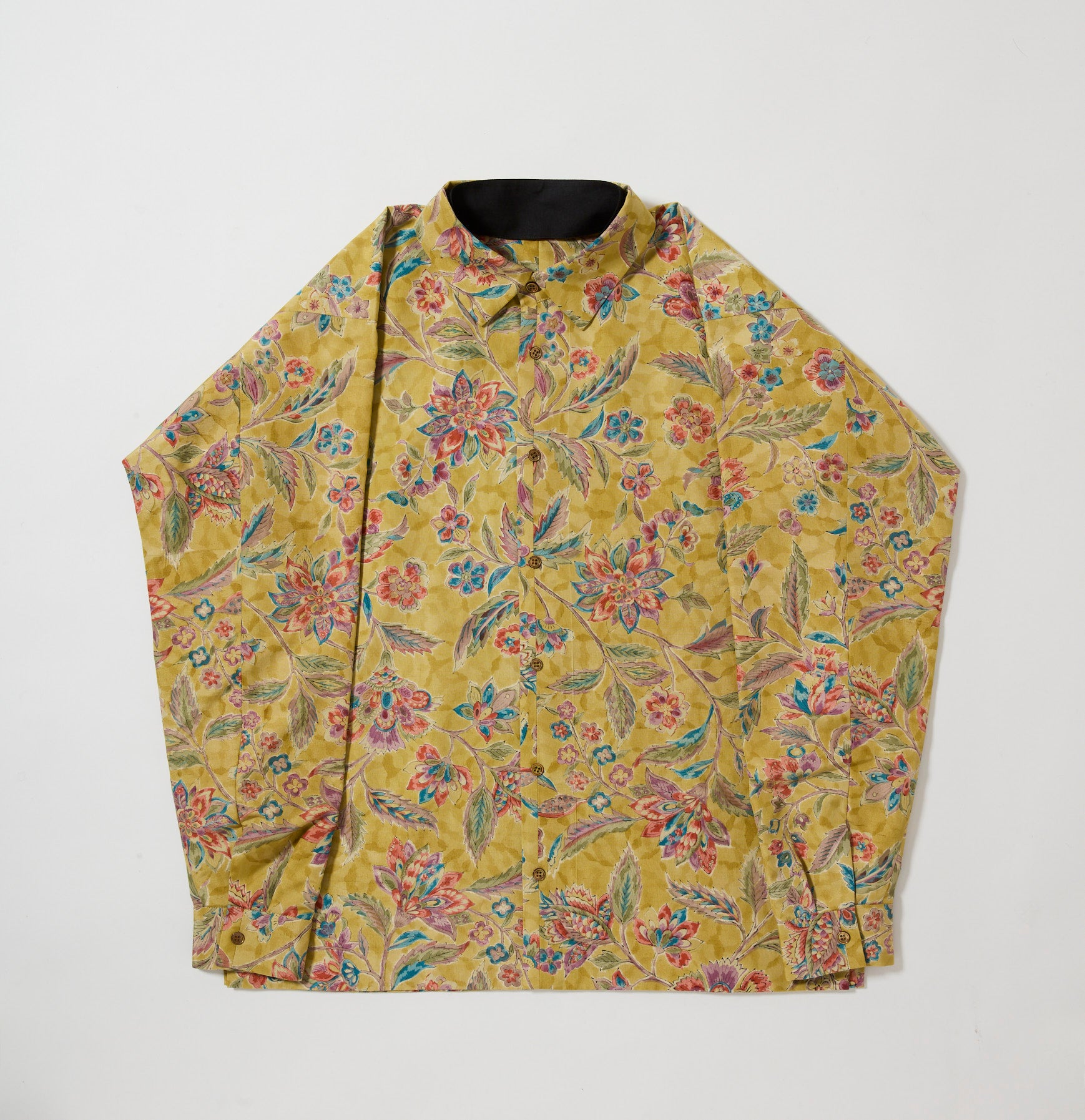 今季は、和裁の縫製仕様を踏襲するだけでなく、より「きものを纏う感覚」に近づけるために、シャツとしての肩線やヨークを省き、首元には付け襟を施しました。これにより、首回りのカーブをお着物の襟に見立てた、独自の設計となっております。