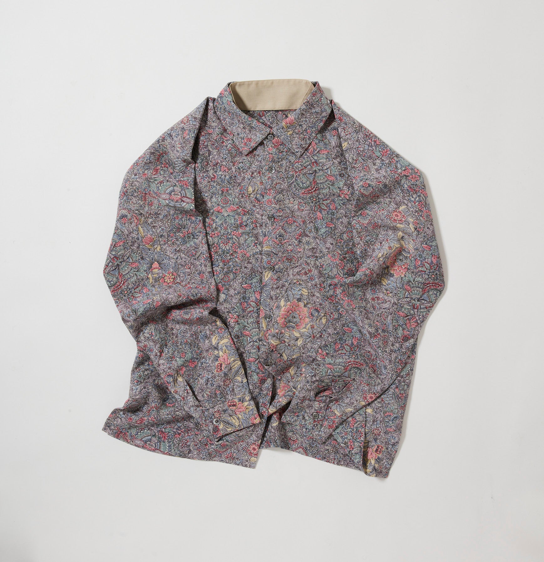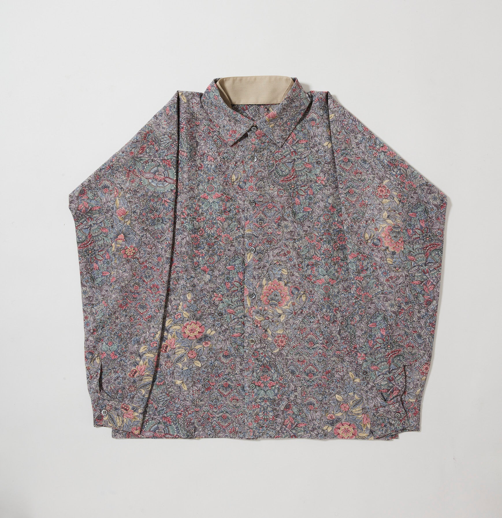 今季は、和裁の縫製仕様を踏襲するだけでなく、より「きものを纏う感覚」に近づけるために、シャツとしての肩線やヨークを省き、首元には付け襟を施しました。これにより、首回りのカーブをお着物の襟に見立てた、独自の設計となっております。