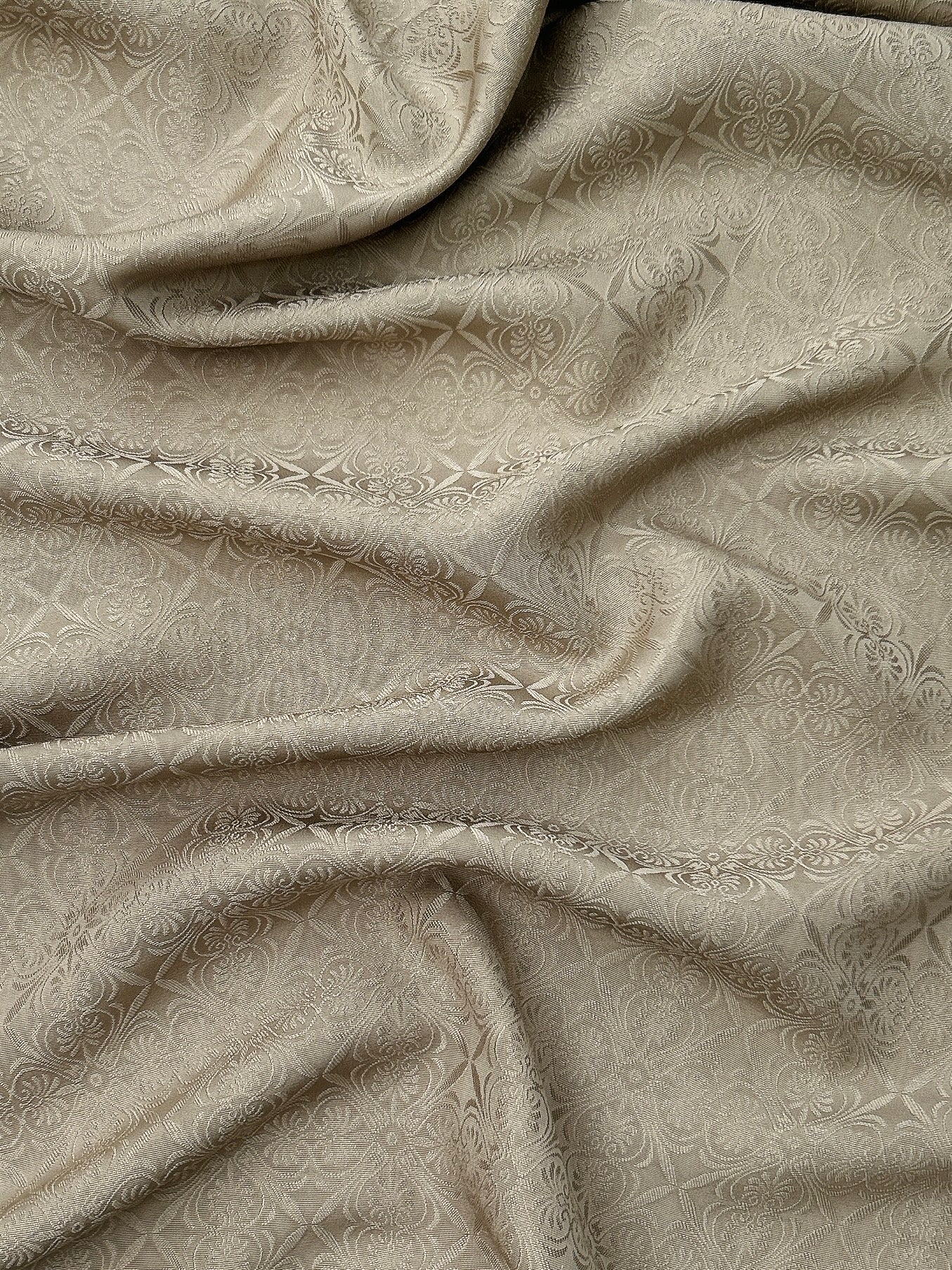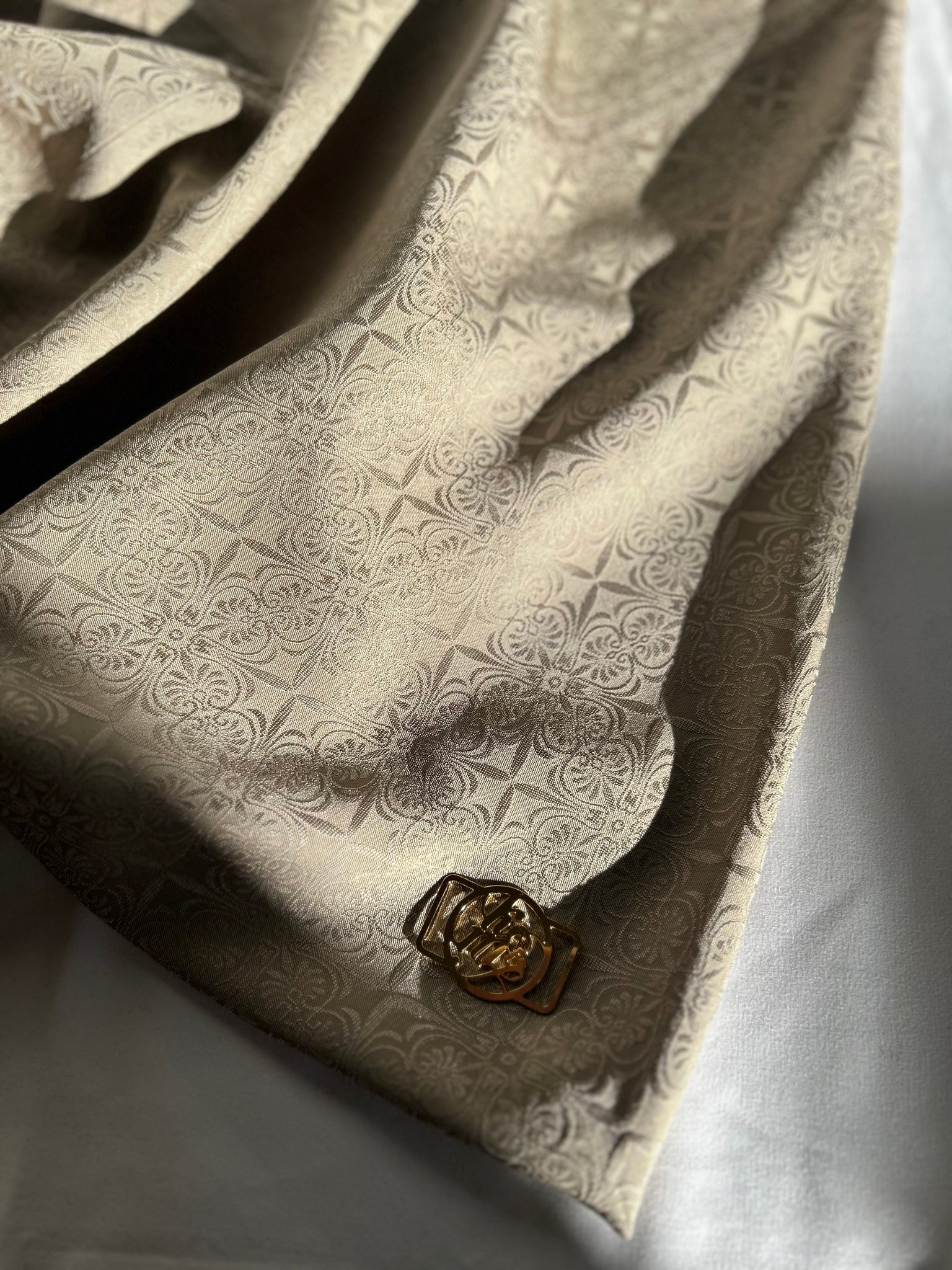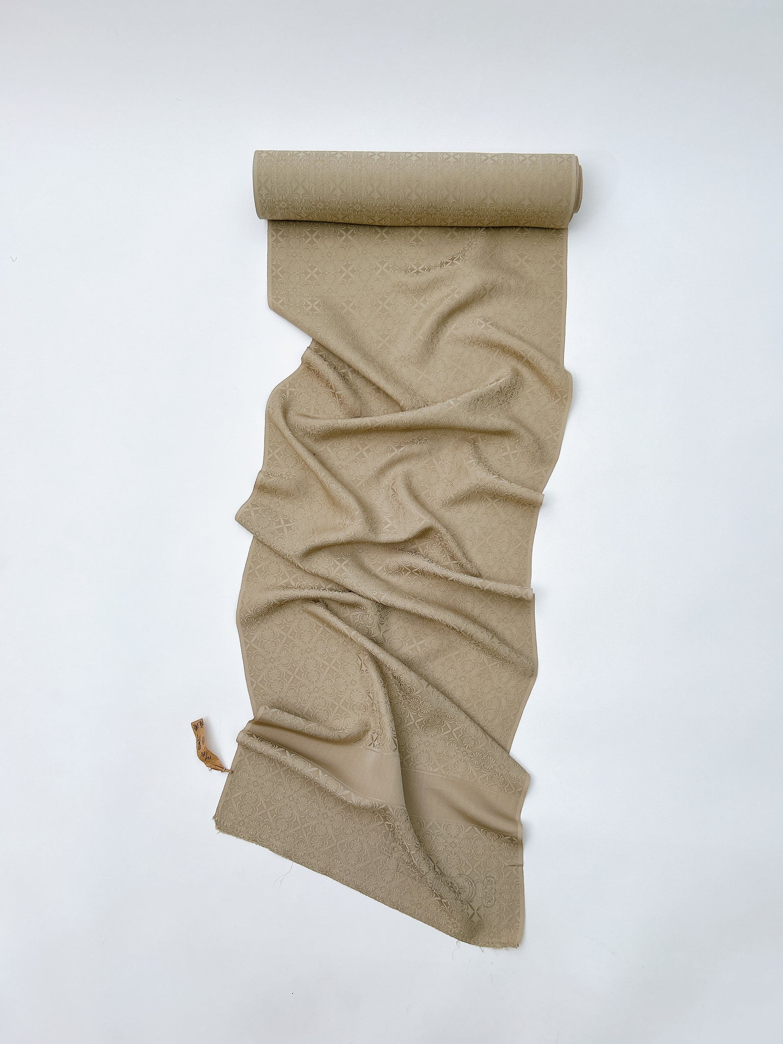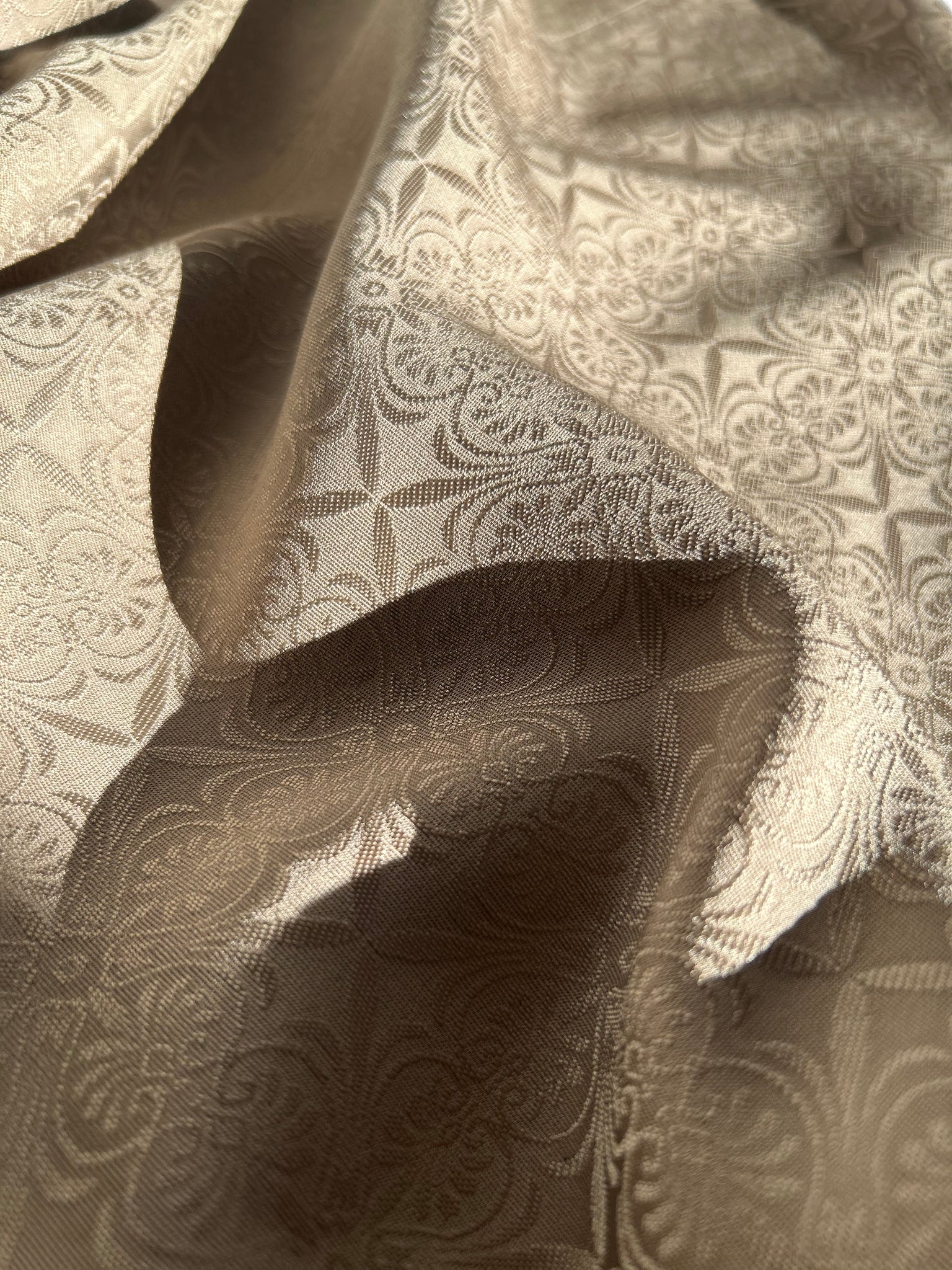 『源氏物語』にも登場する白橡(しろつるばみ)は、慎み深く、静かな白茶の伝統色です。和洋の境界を問わず自然に馴染む、懐の深い色合いでもあります。地紋には、異国情緒を感じさせる更紗紋を採用しました。古典色でありながら、どこか現代的で洗練された佇まいを併せ持つ一色です。
