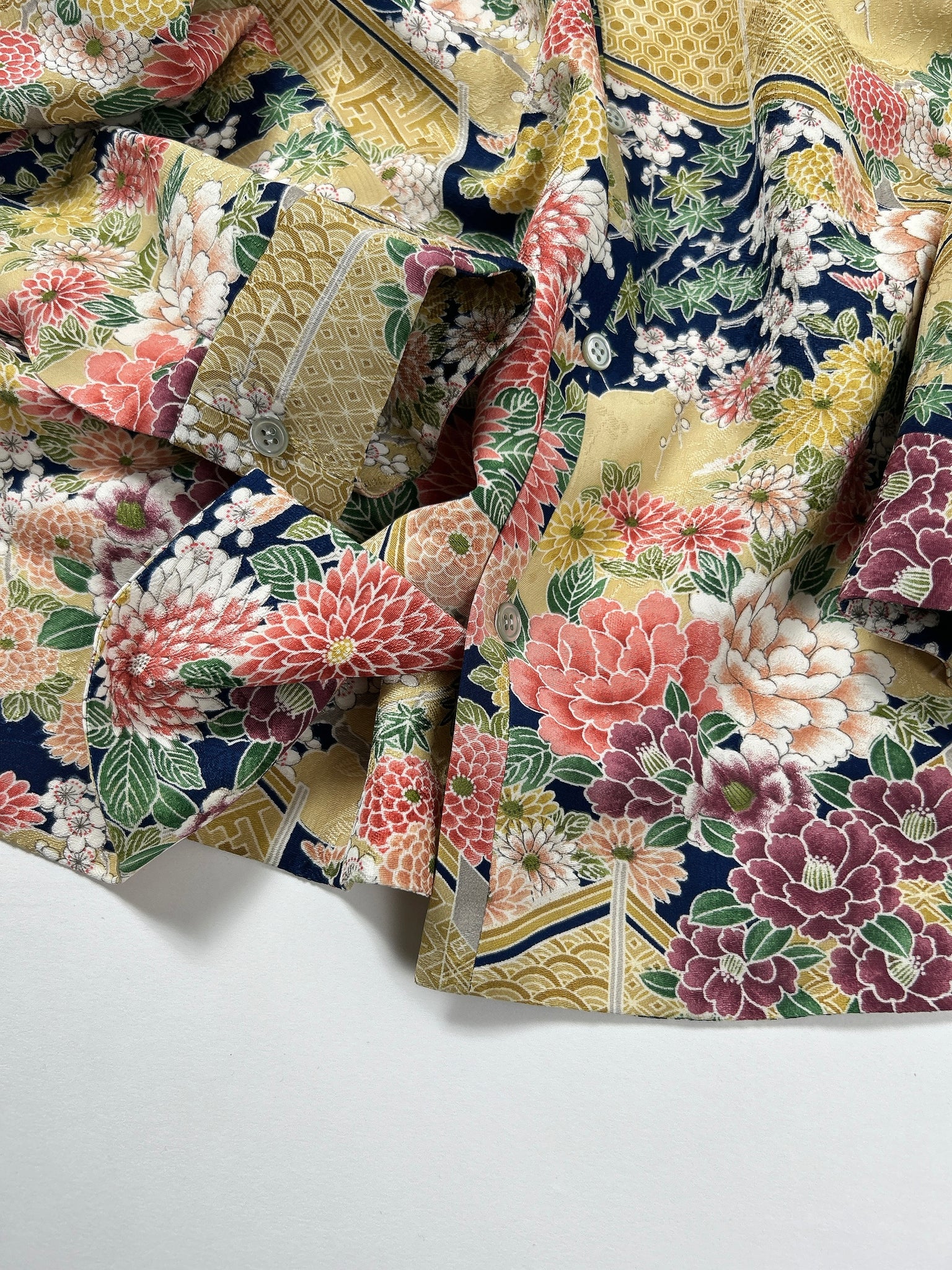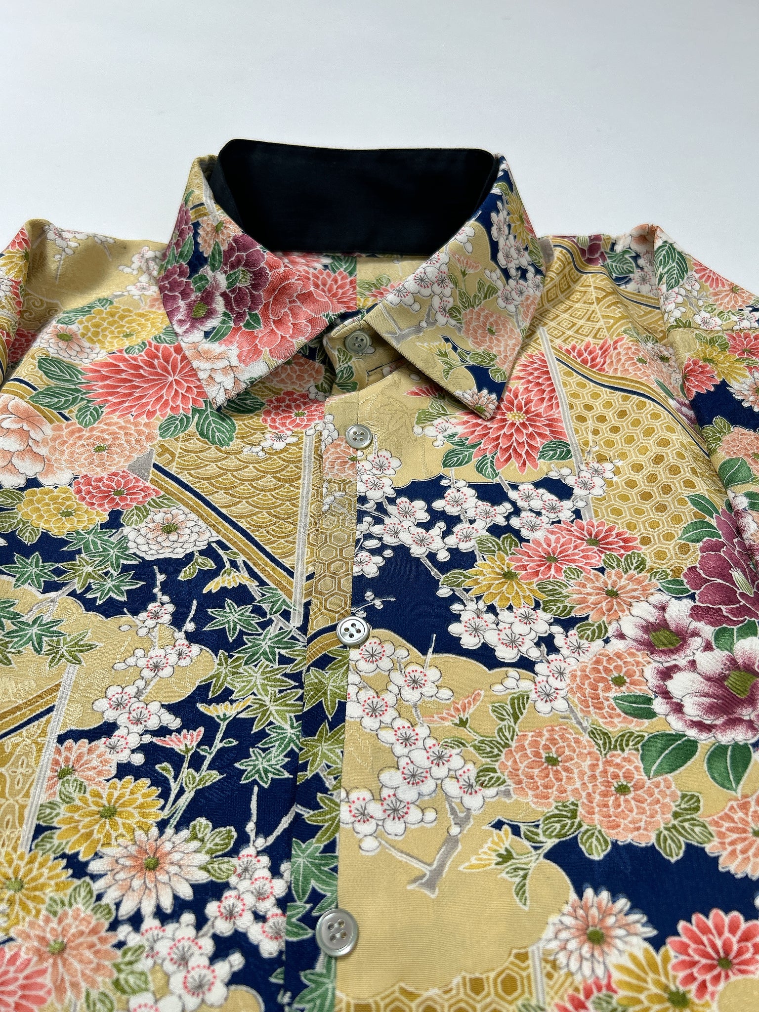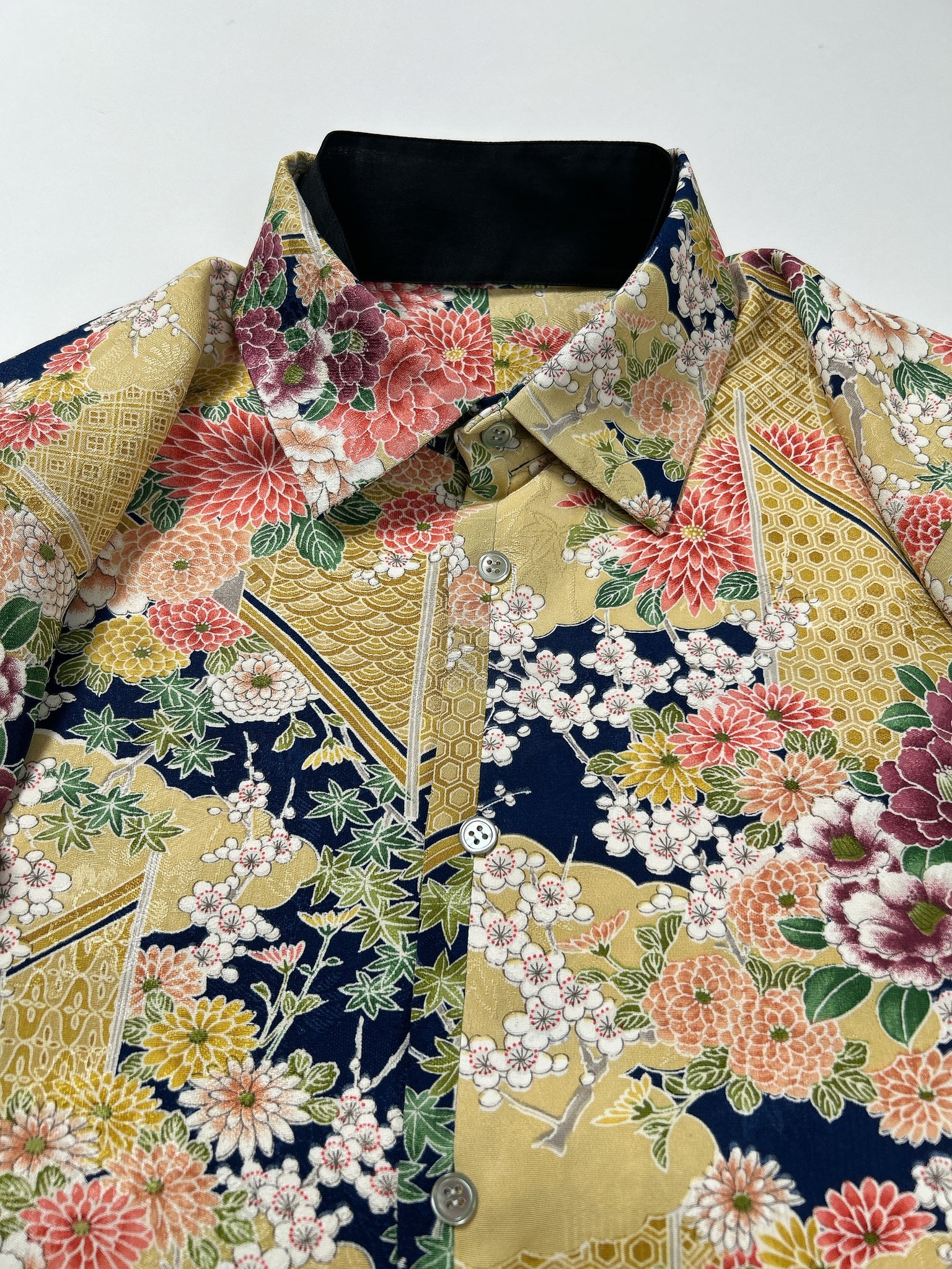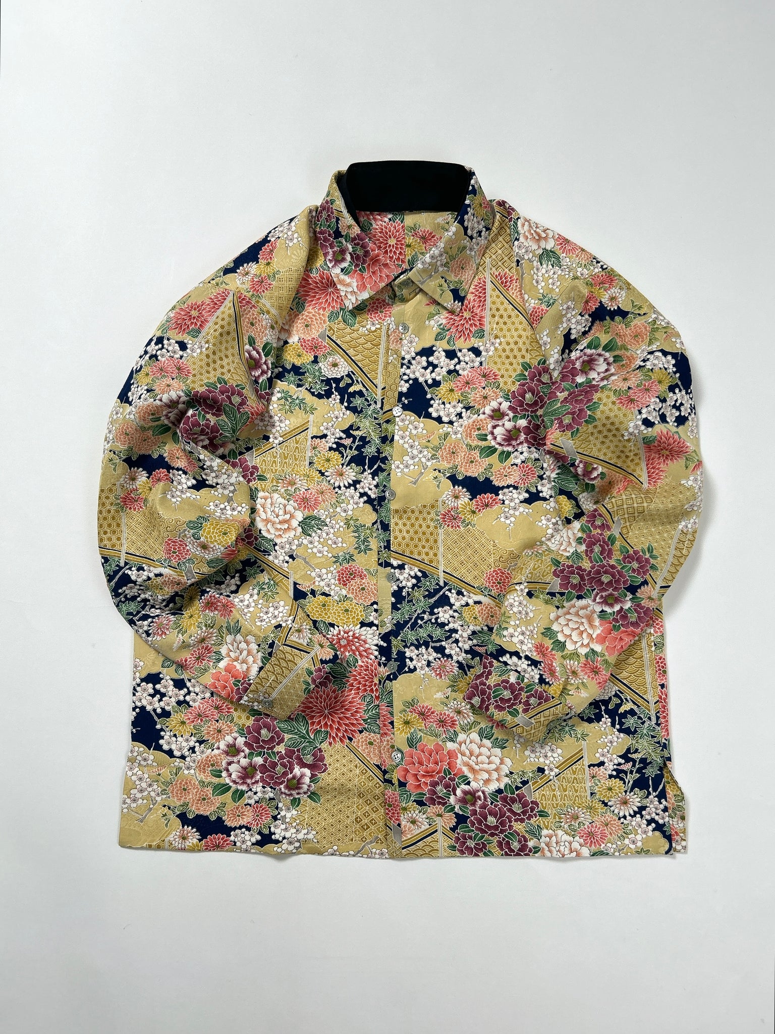 これまでと変わらず、ケニシャツは一反(約12メートル)のお着物生地を余すことなく使用し、総裏仕立ての二枚合わせにてお作りしております。そのため、程よい厚みと重みがあり、お着物一反から一点のみお作りできる、貴重なお品です。
