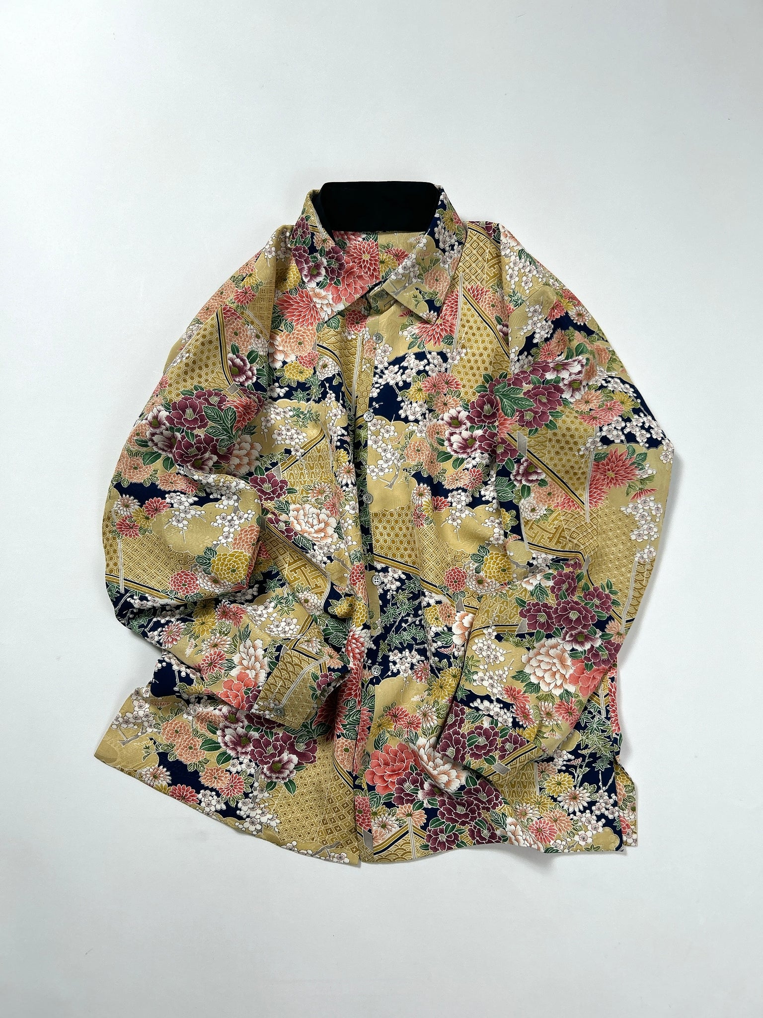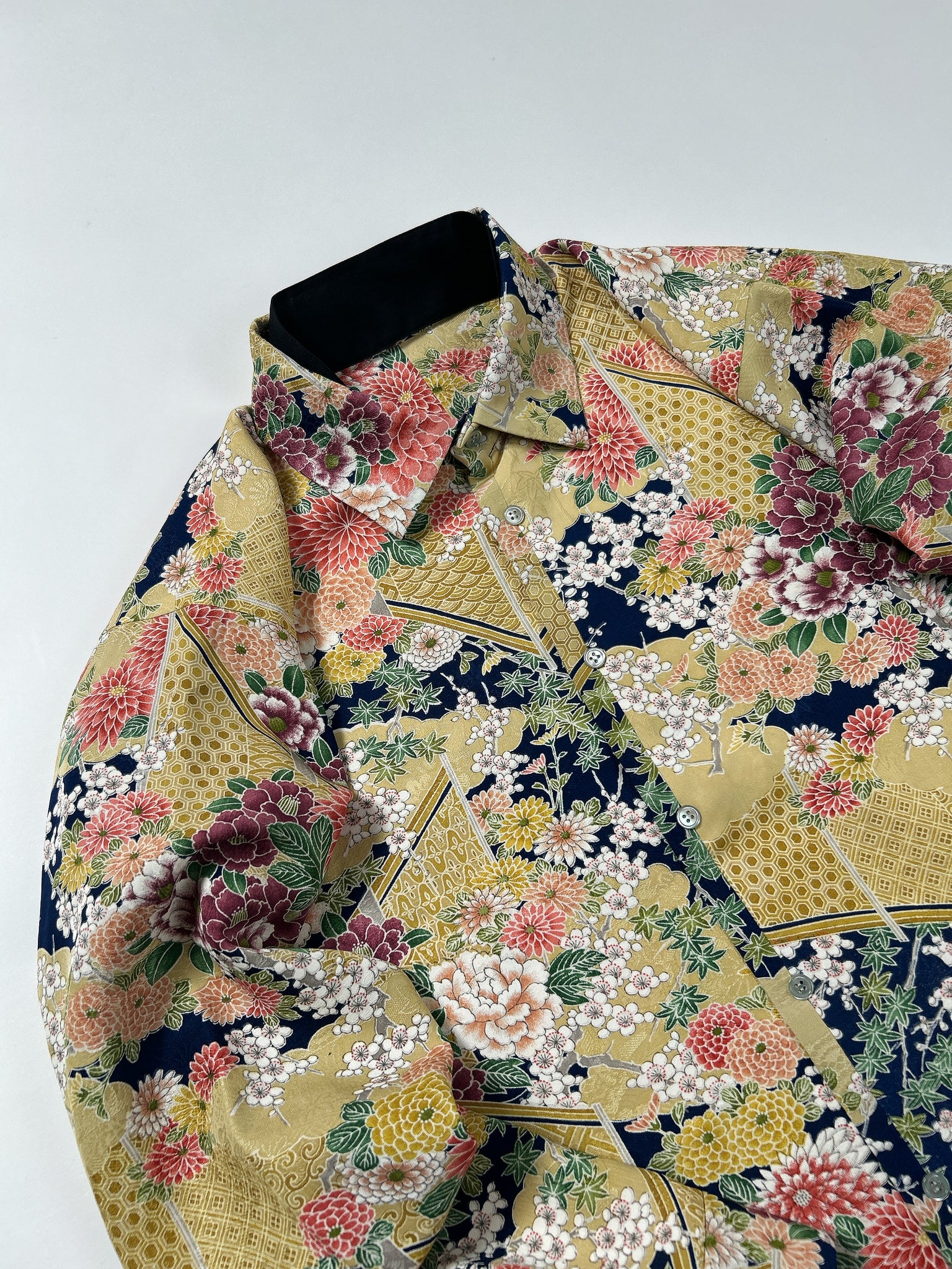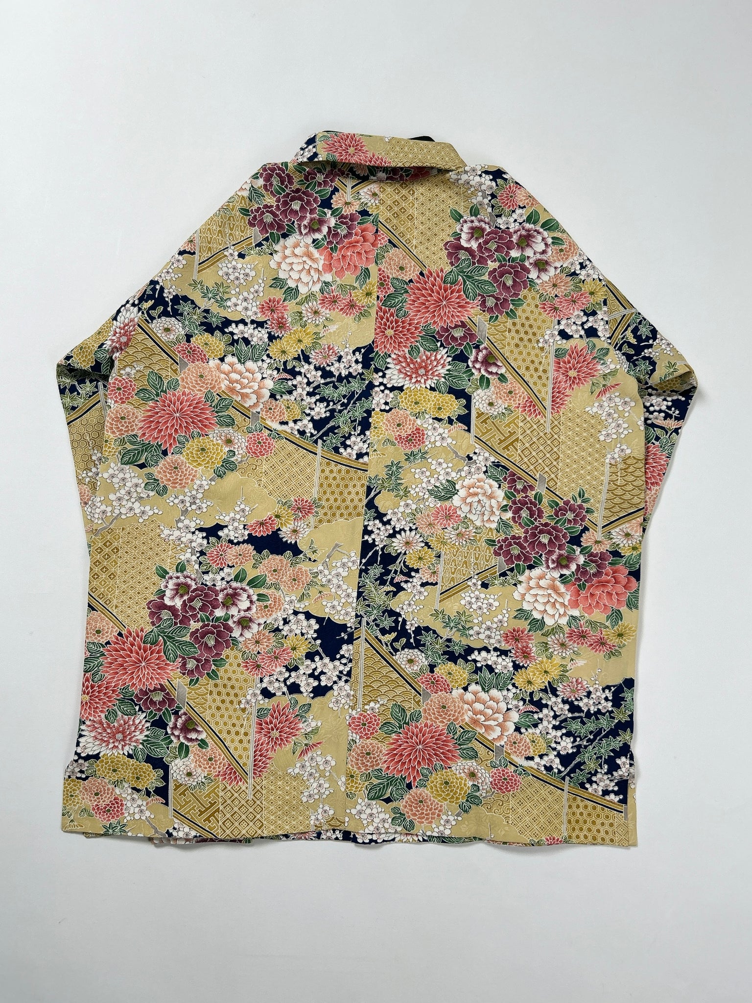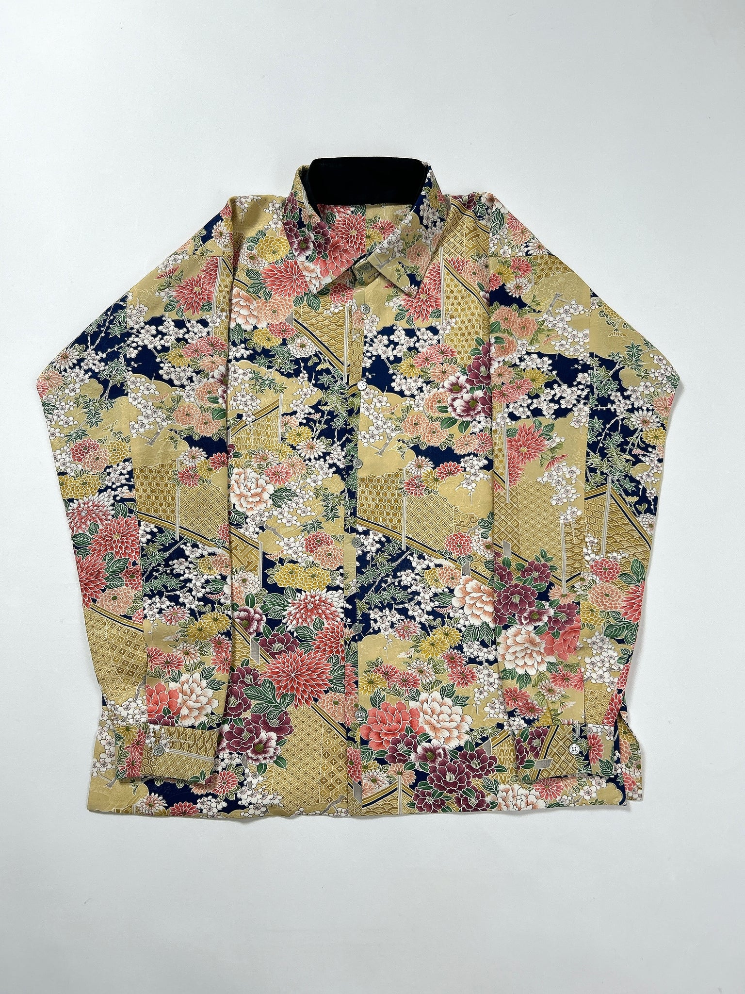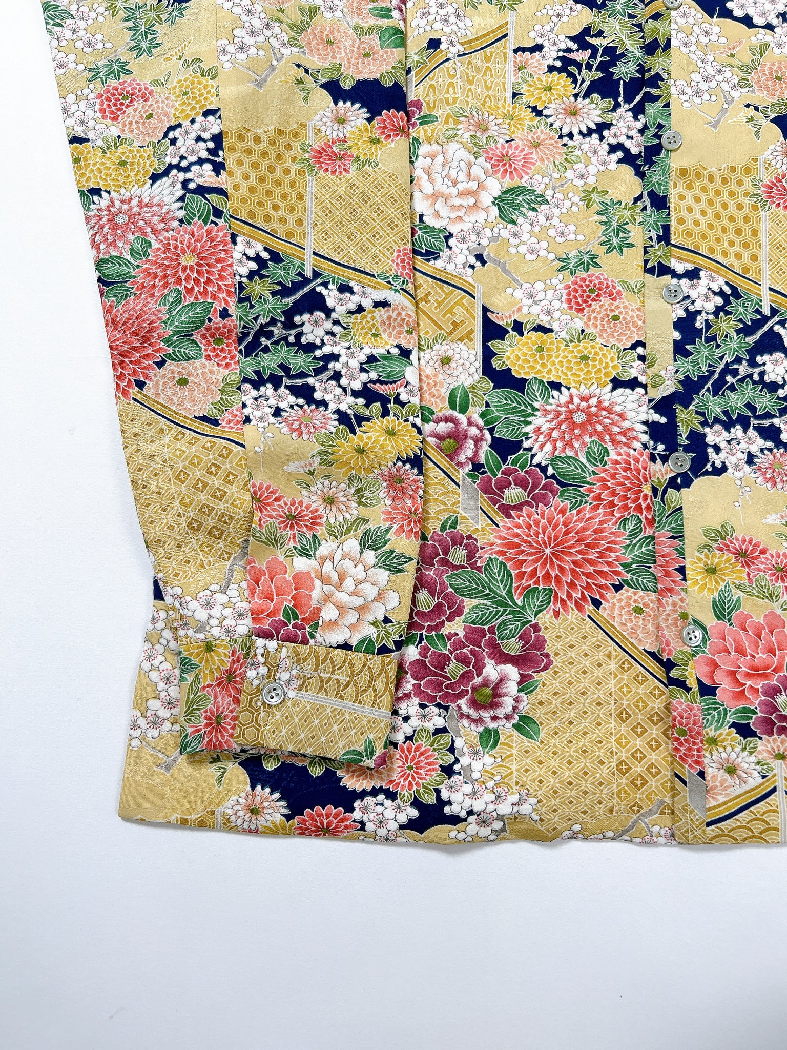 これまでと変わらず、ケニシャツは一反(約12メートル)のお着物生地を余すことなく使用し、総裏仕立ての二枚合わせにてお作りしております。そのため、程よい厚みと重みがあり、お着物一反から一点のみお作りできる、貴重なお品です。