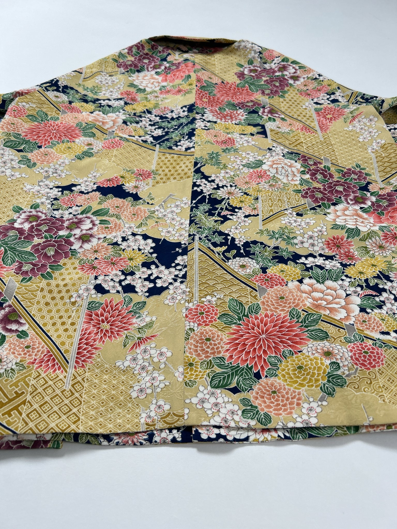 ⁑着物はシミや汚れ破れなどがつきもう着物としては着ることが難しくなったものや、ヴィンテージ、現代着物まで幅広く使用しておりますのでなるべくシミ汚れは逃がして仕立てております。が場合によっては少々アク、シミが付いてるものもございます。古いお着物の時代と時間の経過で現れるものですご理解のほどよろしくお願いもうしあげます。また正絹、化繊共に「防縮加工」をほどこしておりますのでご自宅でのお手入れが可能です。
