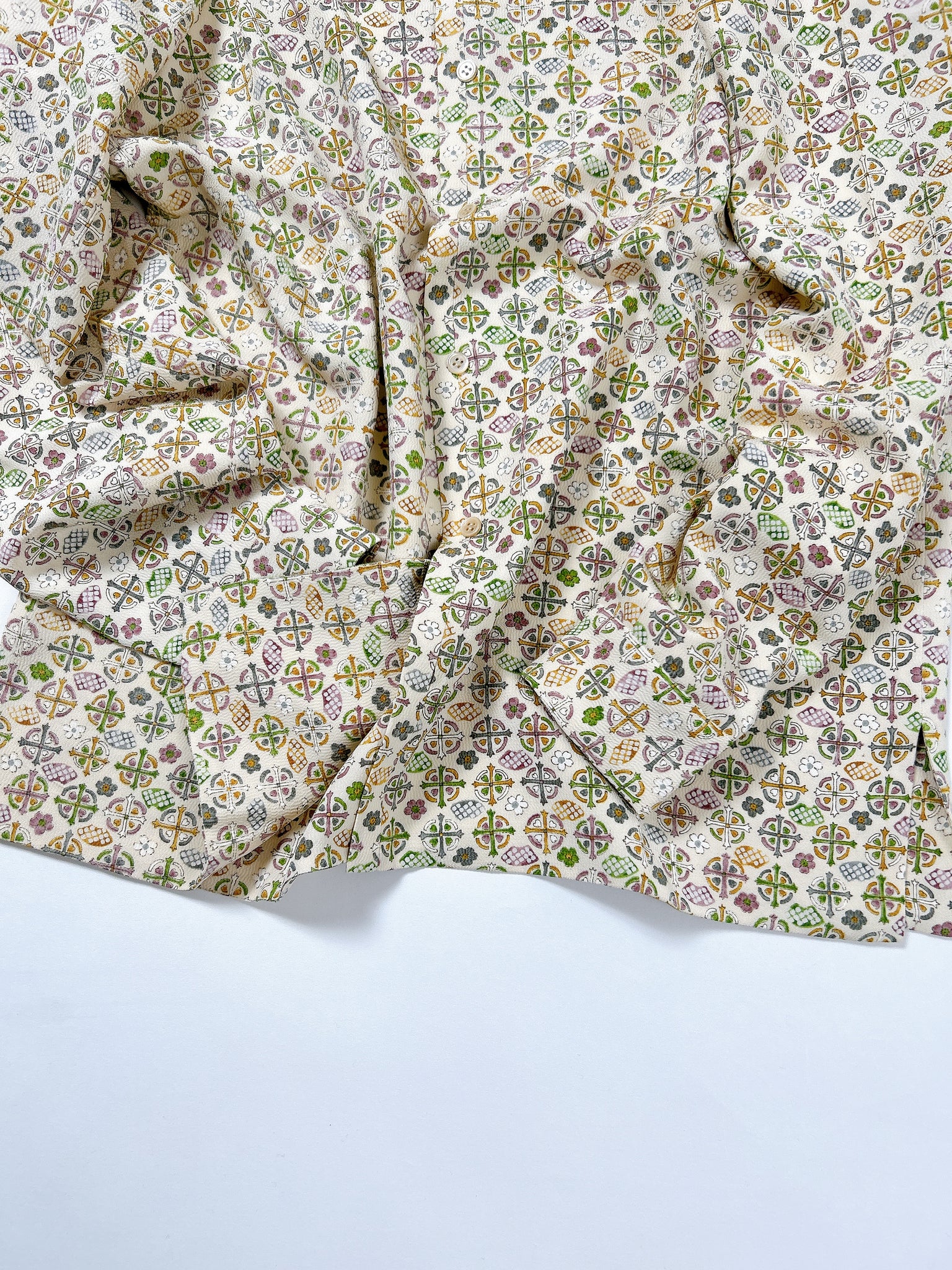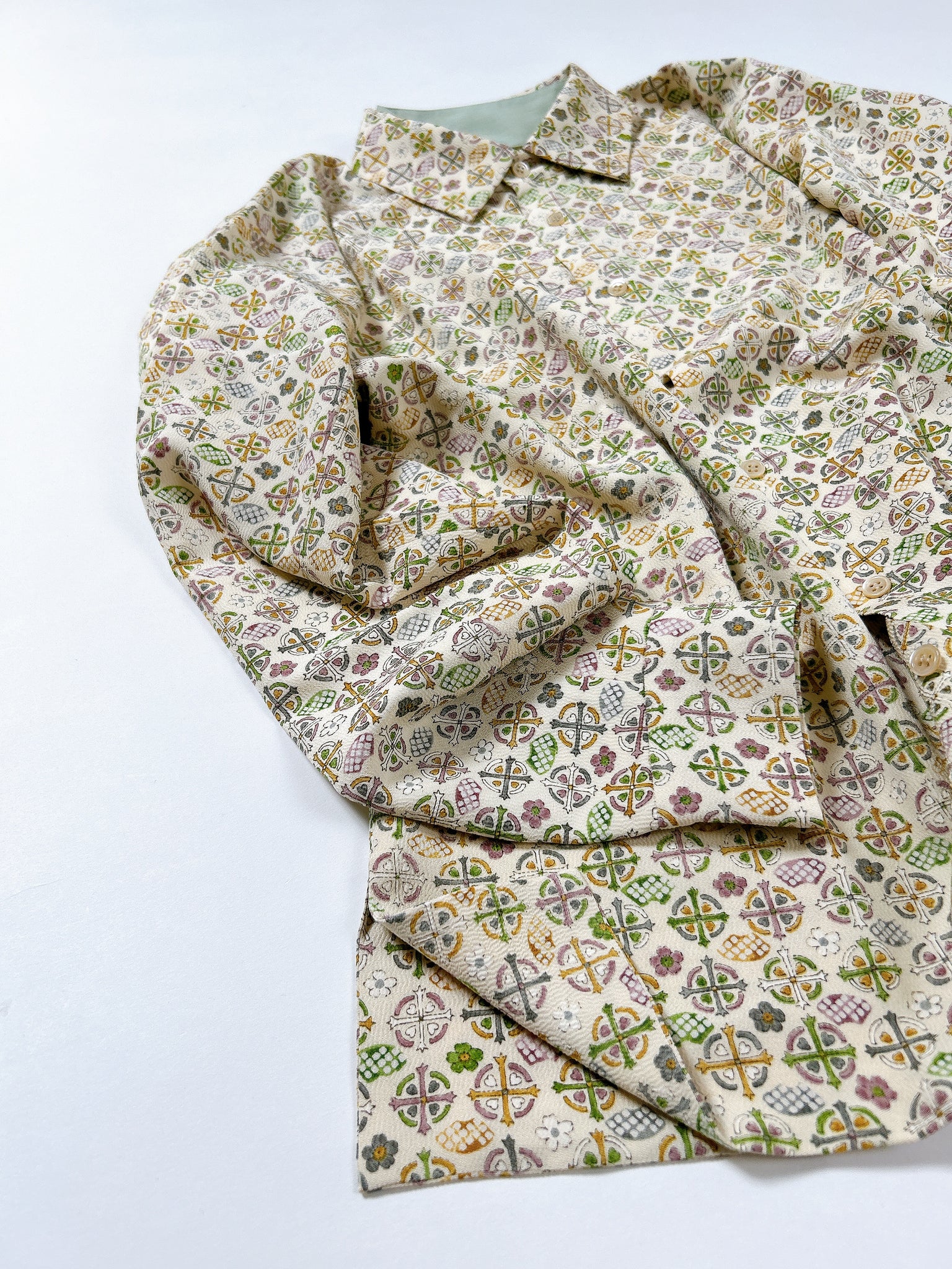 これまでと変わらず、ケニシャツは一反(約12メートル)のお着物生地を余すことなく使用し、総裏仕立ての二枚合わせにてお作りしております。そのため、程よい厚みと重みがあり、お着物一反から一点のみお作りできる、貴重なお品です。