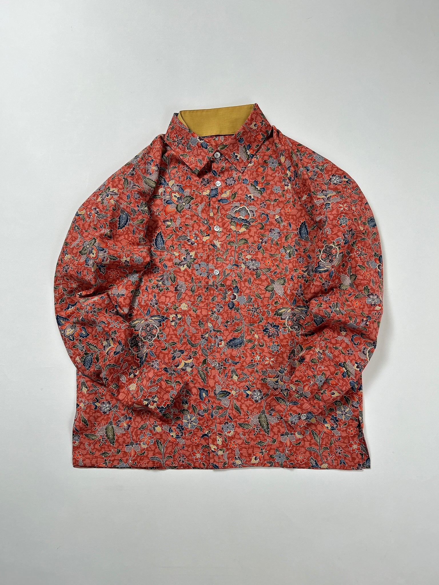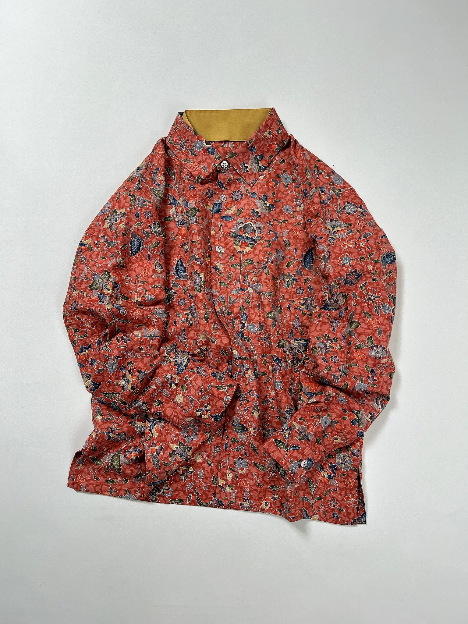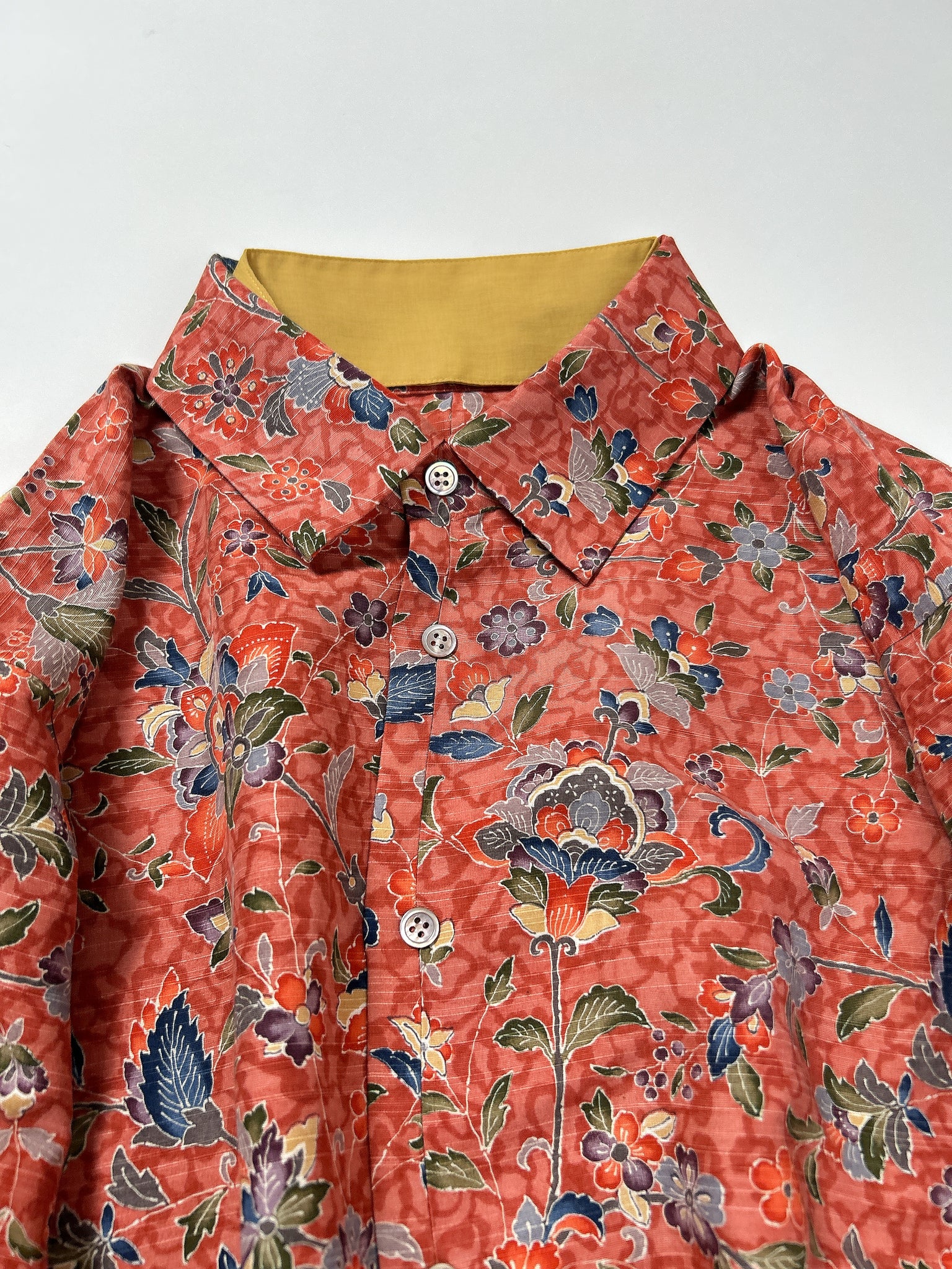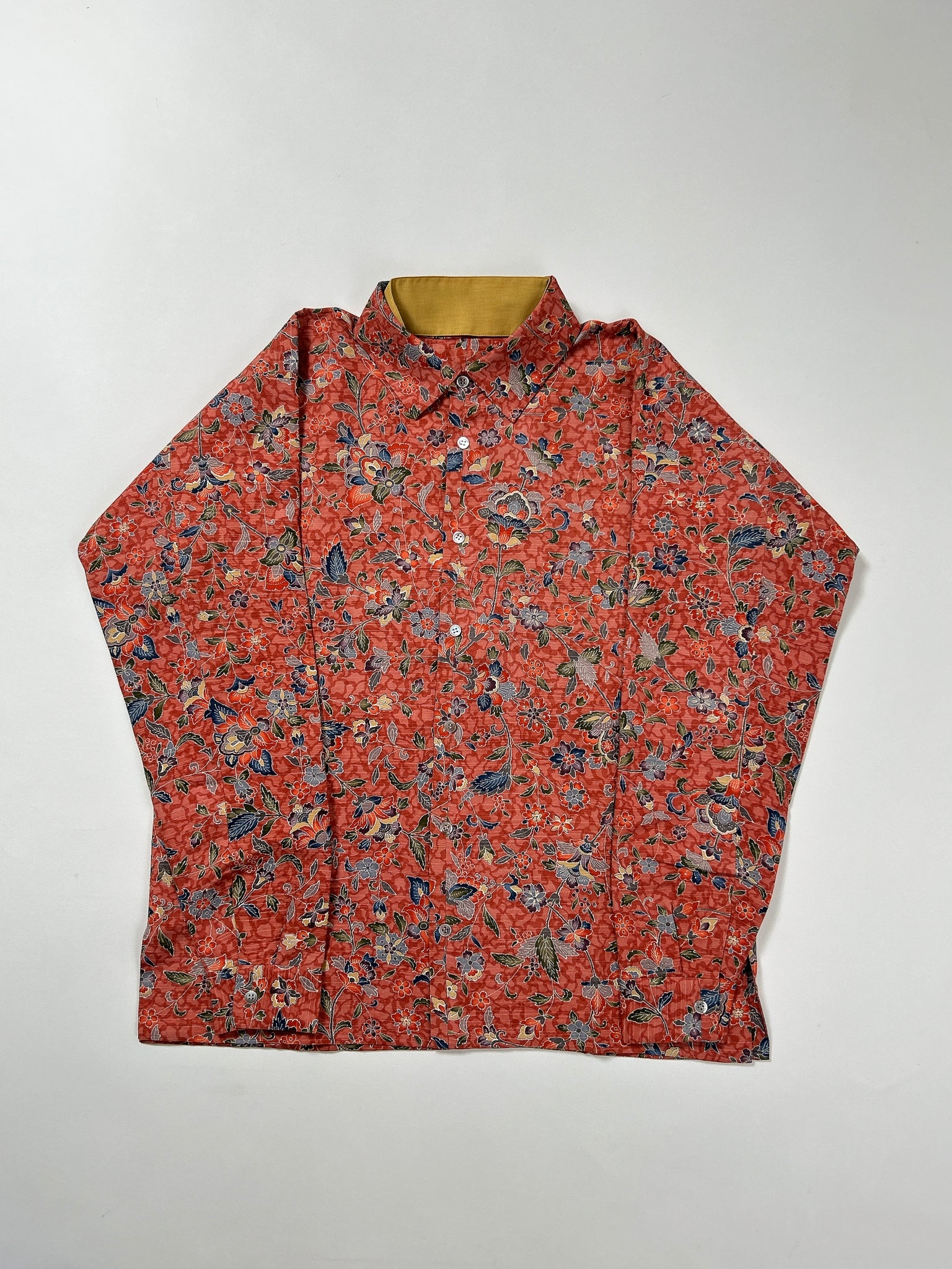 これまでと変わらず、ケニシャツは一反(約12メートル)のお着物生地を余すことなく使用し、総裏仕立ての二枚合わせにてお作りしております。そのため、程よい厚みと重みがあり、お着物一反から一点のみお作りできる、貴重なお品です。